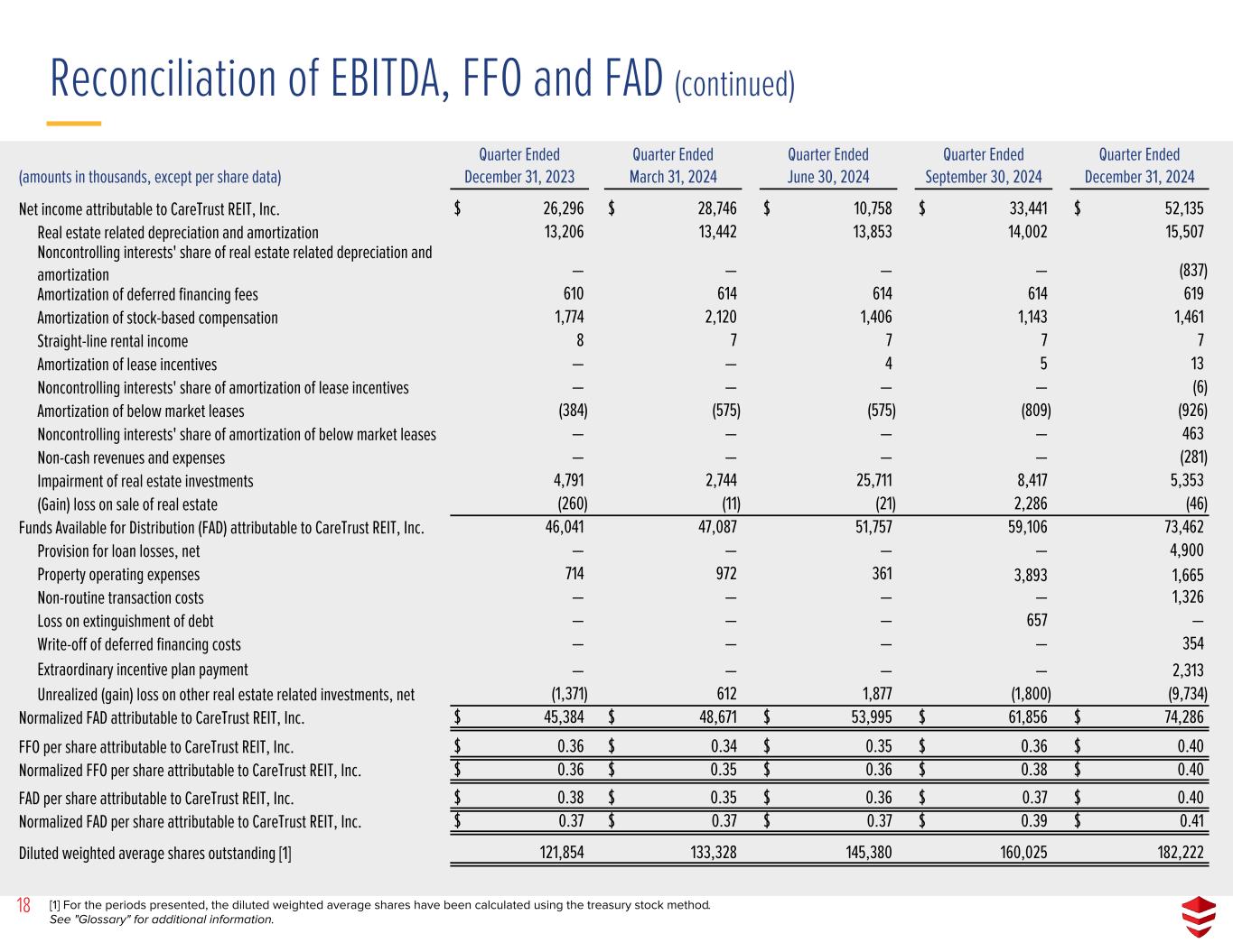 ビル・ワグナー最高財務責任者(CFO)の報告によると、ケアトラストの第4四半期の純利益は5,210万ドル(希薄化後加重平均普通株式1株当たり0.29ドル)、正規化FFOは7,290万ドル(希薄化後加重平均普通株式1株当たり0.40ドル)、正規化FADは7,430万ドル(希薄化後加重平均普通株式1株当たり0.41ドル)であった。2024年12月31日に終了した年度については、ケアトラストは純利益1億2,510万ドル(希薄化後加重平均普通株式1株当たり0.80ドル)、正規化FFO2億3,290万ドル(希薄化後加重平均普通株式1株当たり1.50ドル)、正規化FAD2億3,880万ドル(希薄化後加重平均普通株式1株当たり1.54ドル)を計上した。