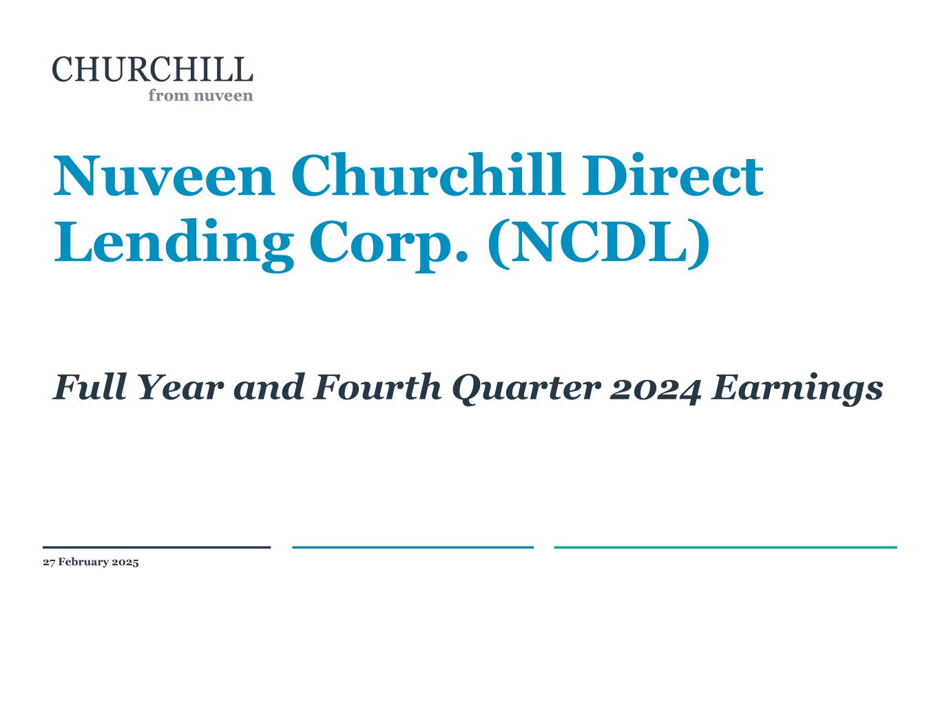 ニューヨーク、2025年2月27日-投資顧問会社であるチャーチルDLCアドバイザーLLC(以下「アドバイザー」)およびサブアドバイザーであるチャーチル・アセット・マネジメントLLC(以下「チャーチル」)が外部運用する事業開発会社であるニュービーン・チャーチル・ダイレクト・レンディング・コーポレーション(NYSE:NCDL)(以下「NCDL」または「当社」)は本日、2024年12月31日に終了した通期および第4四半期の決算を発表しました。