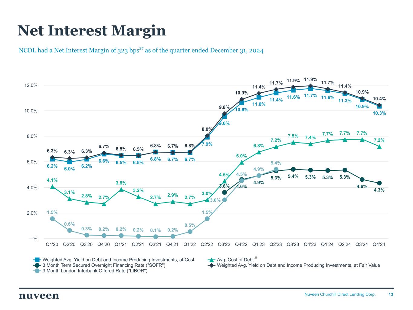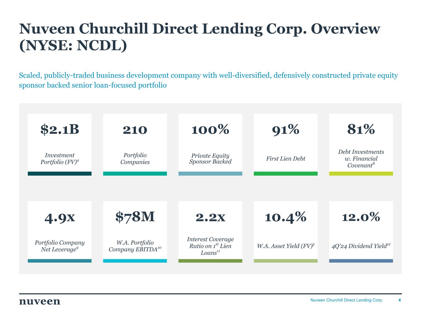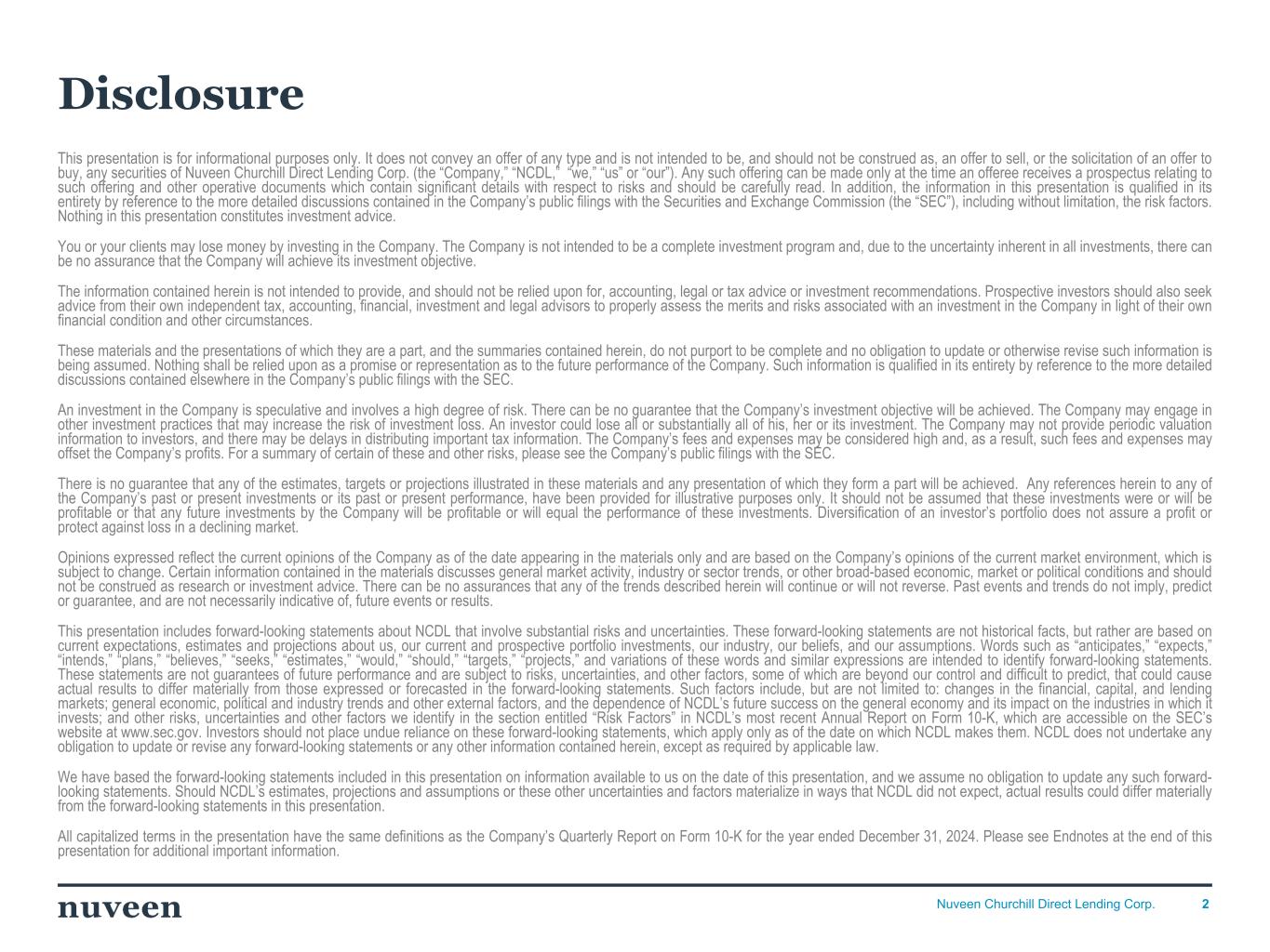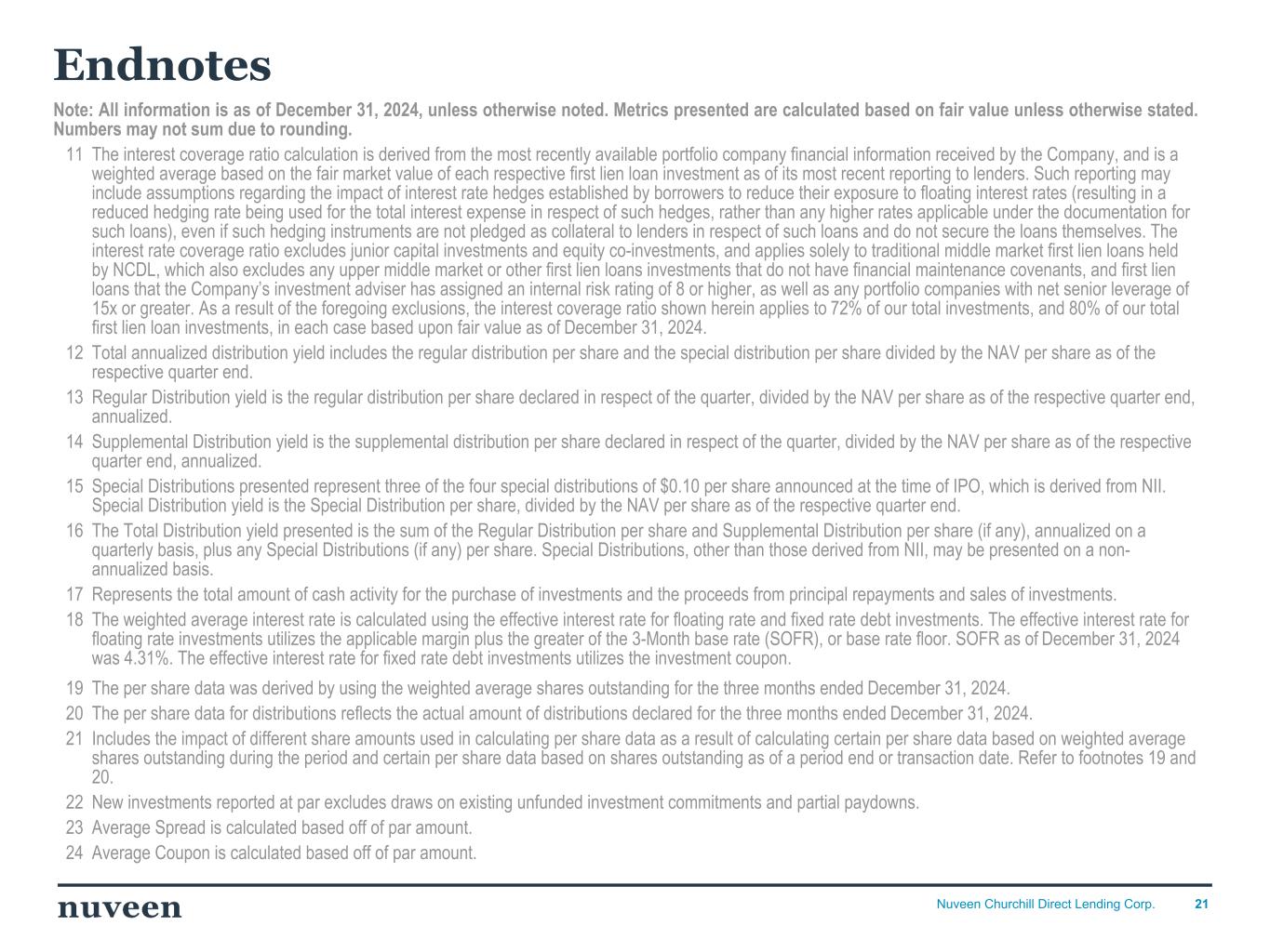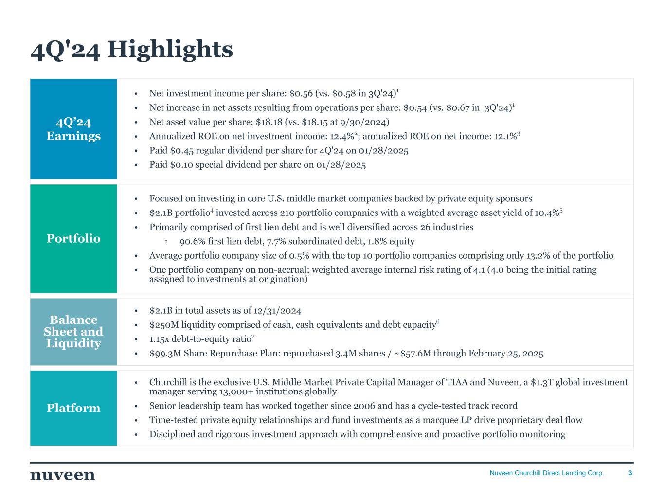 「2024 年第 4 四半期を好調な決算で終えることができ、年間を通じて築いてきた前向きなモメンタムを反映し ていることを喜ばしく思う。NCDLとチャーチルの社長兼最高経営責任者(CEO)であるケン・ケンセルは、「昨年はオリジネーションが活発な年であり、当社の投資チームは9億5,000万ドルを超える新規投資を実行しました。「2025年を迎えるにあたり、当社は中核的なミドルマーケットのダイレクト・レンディング分野におけるリーダーとしてのポジショニングに引き続き自信を持っており、株主の皆様に魅力的な利回りを提供し続けることに引き続き注力していきます。