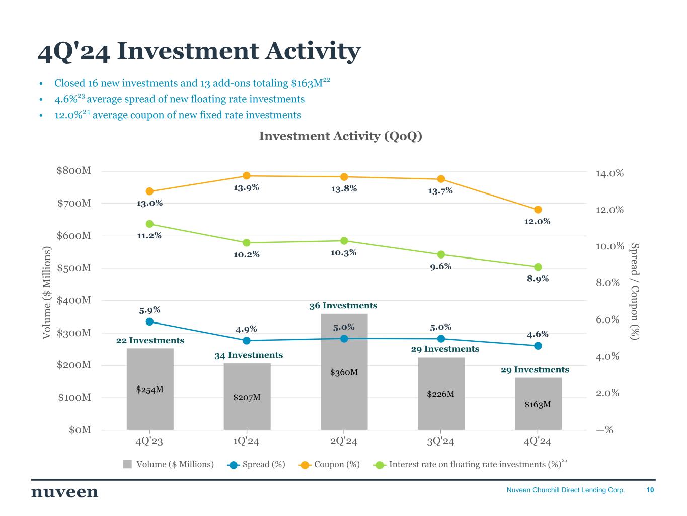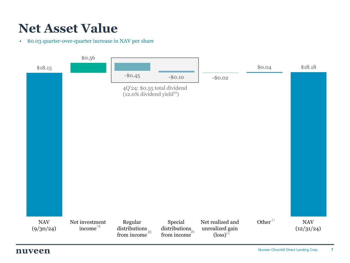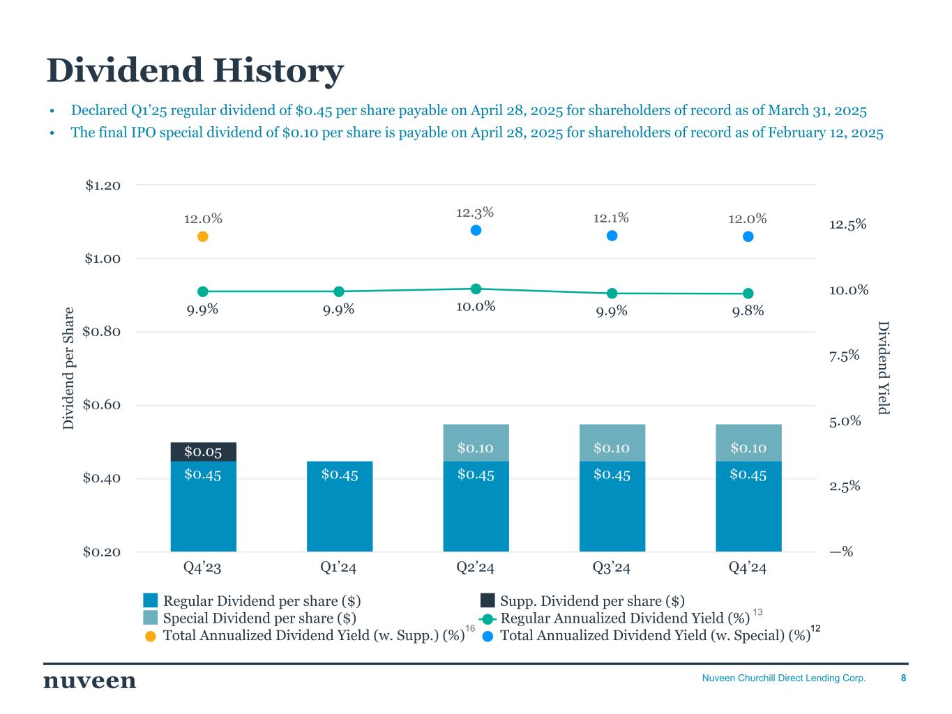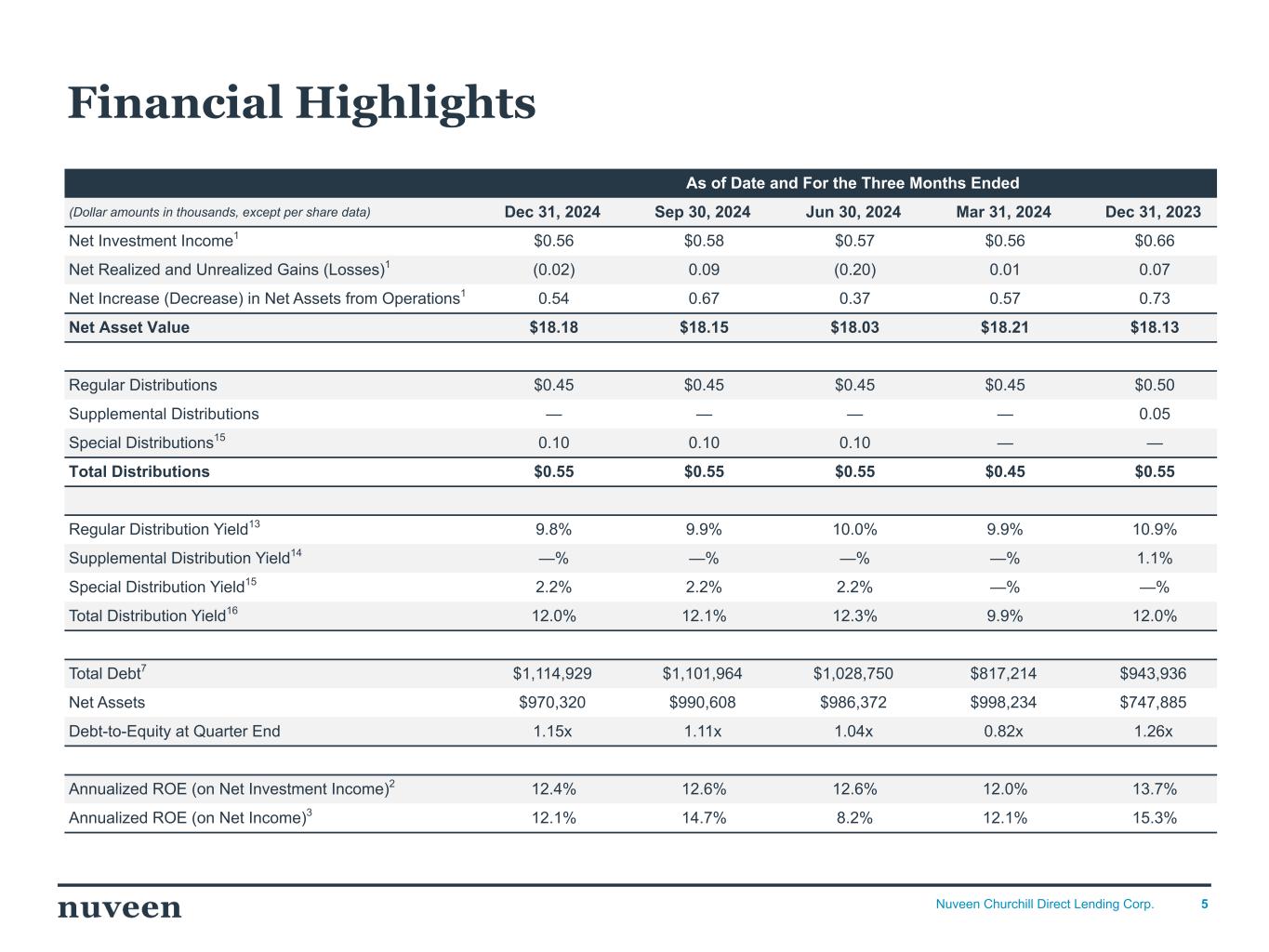 「2024 年第 4 四半期を好調な決算で終えることができ、年間を通じて築いてきた前向きなモメンタムを反映し ていることを喜ばしく思う。NCDLとチャーチルの社長兼最高経営責任者(CEO)であるケン・ケンセルは、「昨年はオリジネーションが活発な年であり、当社の投資チームは9億5,000万ドルを超える新規投資を実行しました。「2025年を迎えるにあたり、当社は中核的なミドルマーケットのダイレクト・レンディング分野におけるリーダーとしてのポジショニングに引き続き自信を持っており、株主の皆様に魅力的な利回りを提供し続けることに引き続き注力していきます。