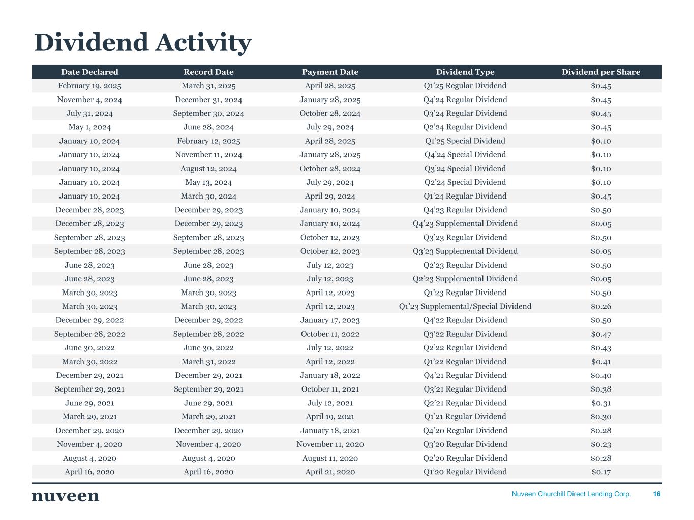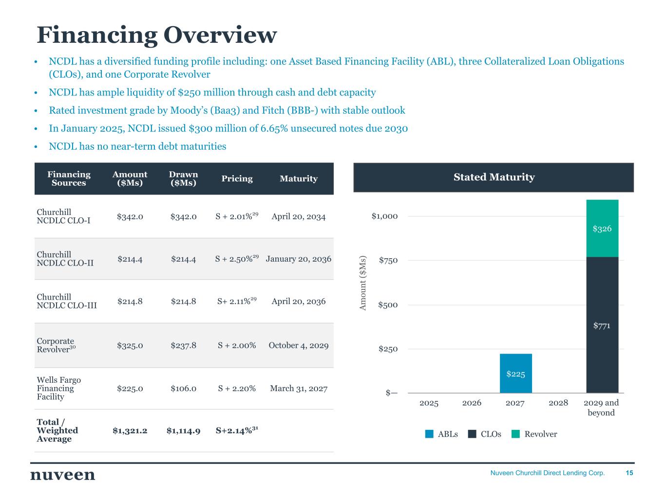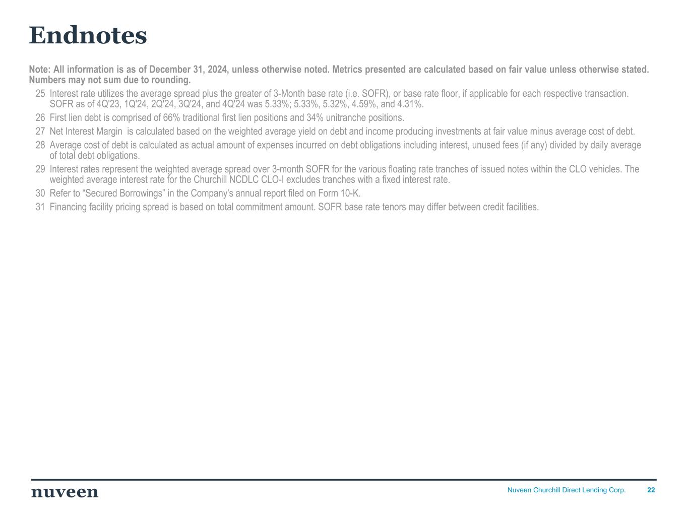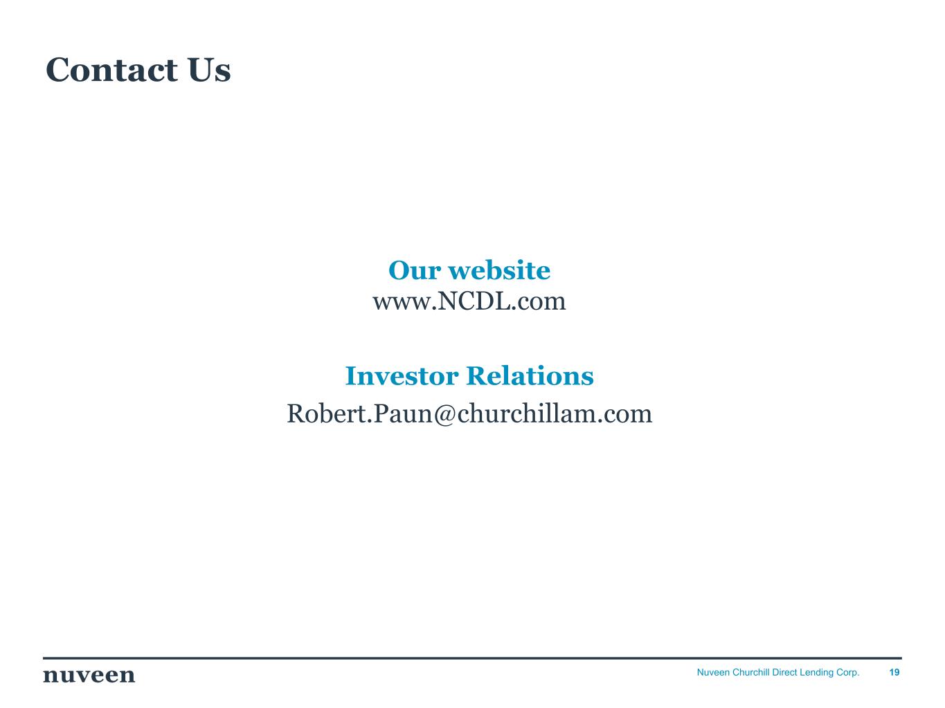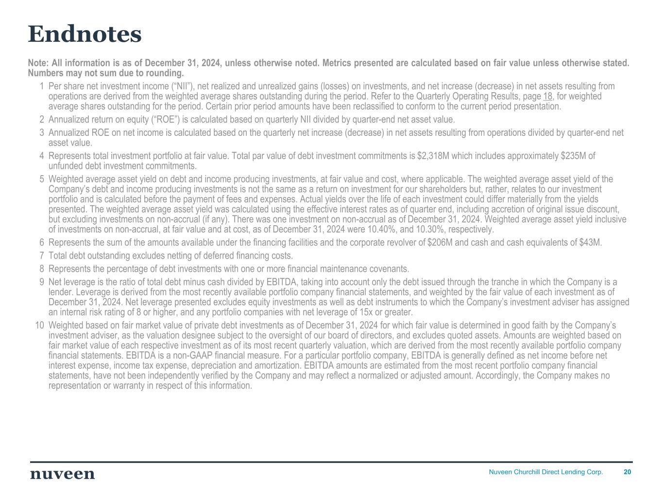 「2024 年第 4 四半期を好調な決算で終えることができ、年間を通じて築いてきた前向きなモメンタムを反映し ていることを喜ばしく思う。NCDLとチャーチルの社長兼最高経営責任者(CEO)であるケン・ケンセルは、「昨年はオリジネーションが活発な年であり、当社の投資チームは9億5,000万ドルを超える新規投資を実行しました。「2025年を迎えるにあたり、当社は中核的なミドルマーケットのダイレクト・レンディング分野におけるリーダーとしてのポジショニングに引き続き自信を持っており、株主の皆様に魅力的な利回りを提供し続けることに引き続き注力していきます。