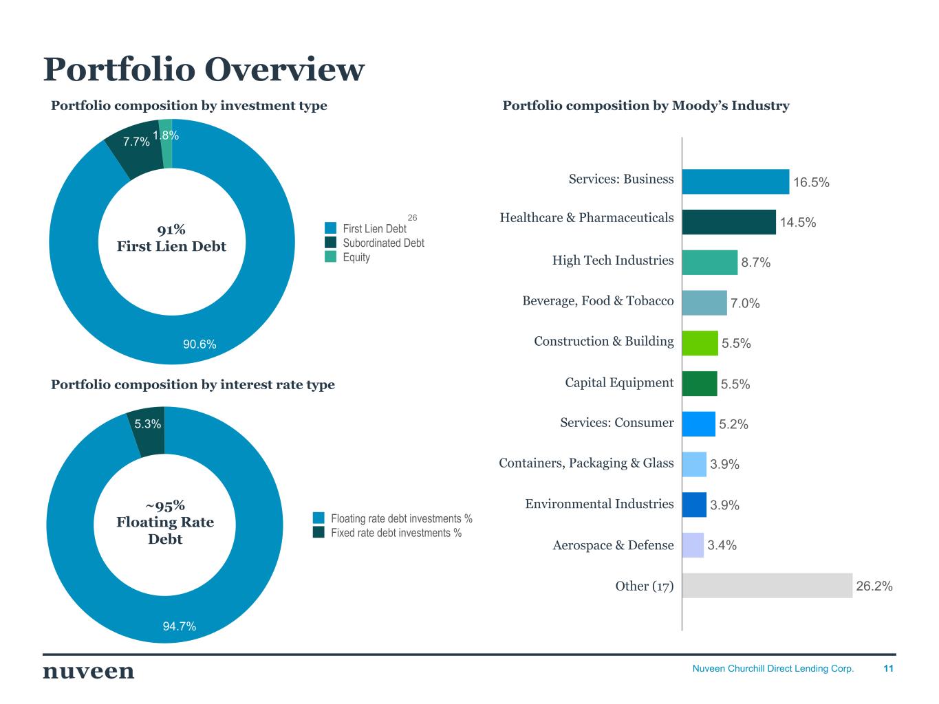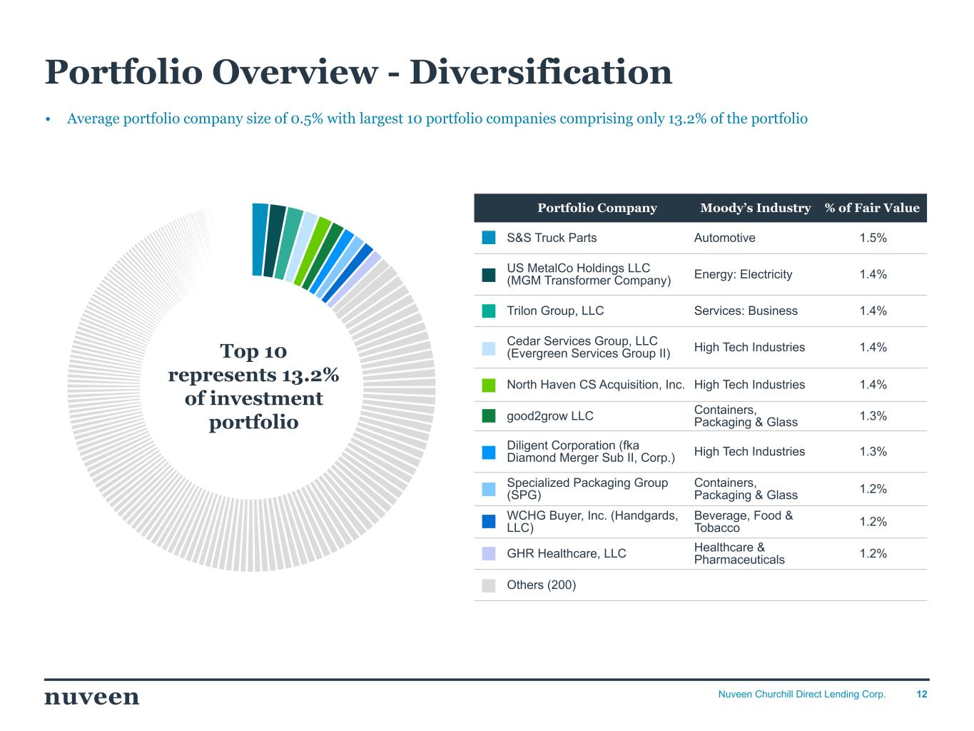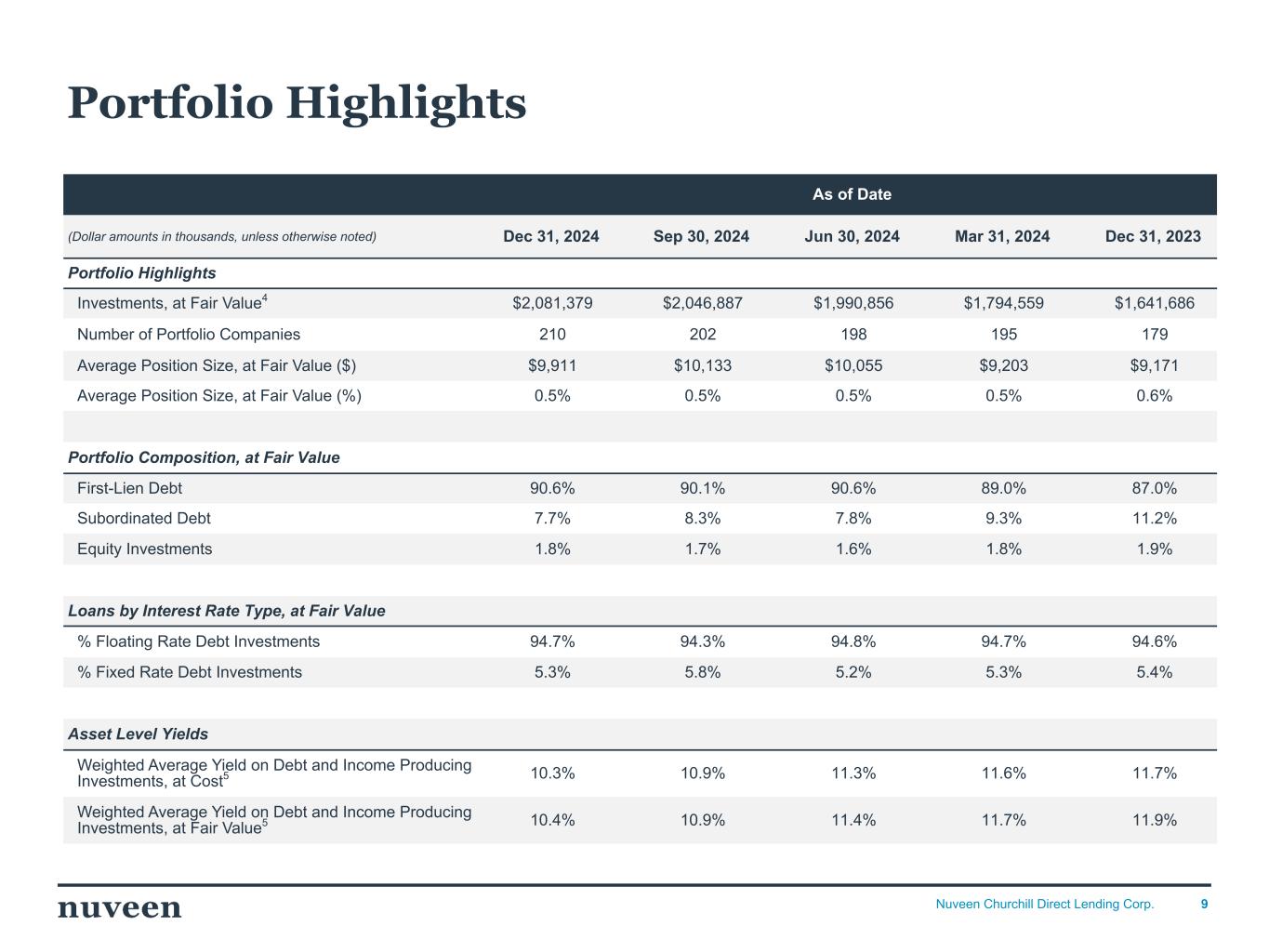 2024年12月31日現在、当社のポートフォリオ投資の公正価値は、ポートフォリオ企業210社、27業種にわたって20億8,000万ドルであった。これに対し、2024年9月30日現在の投資先企業数は202社、業種は26業種、公正価値は20億5,000万ドルであった。