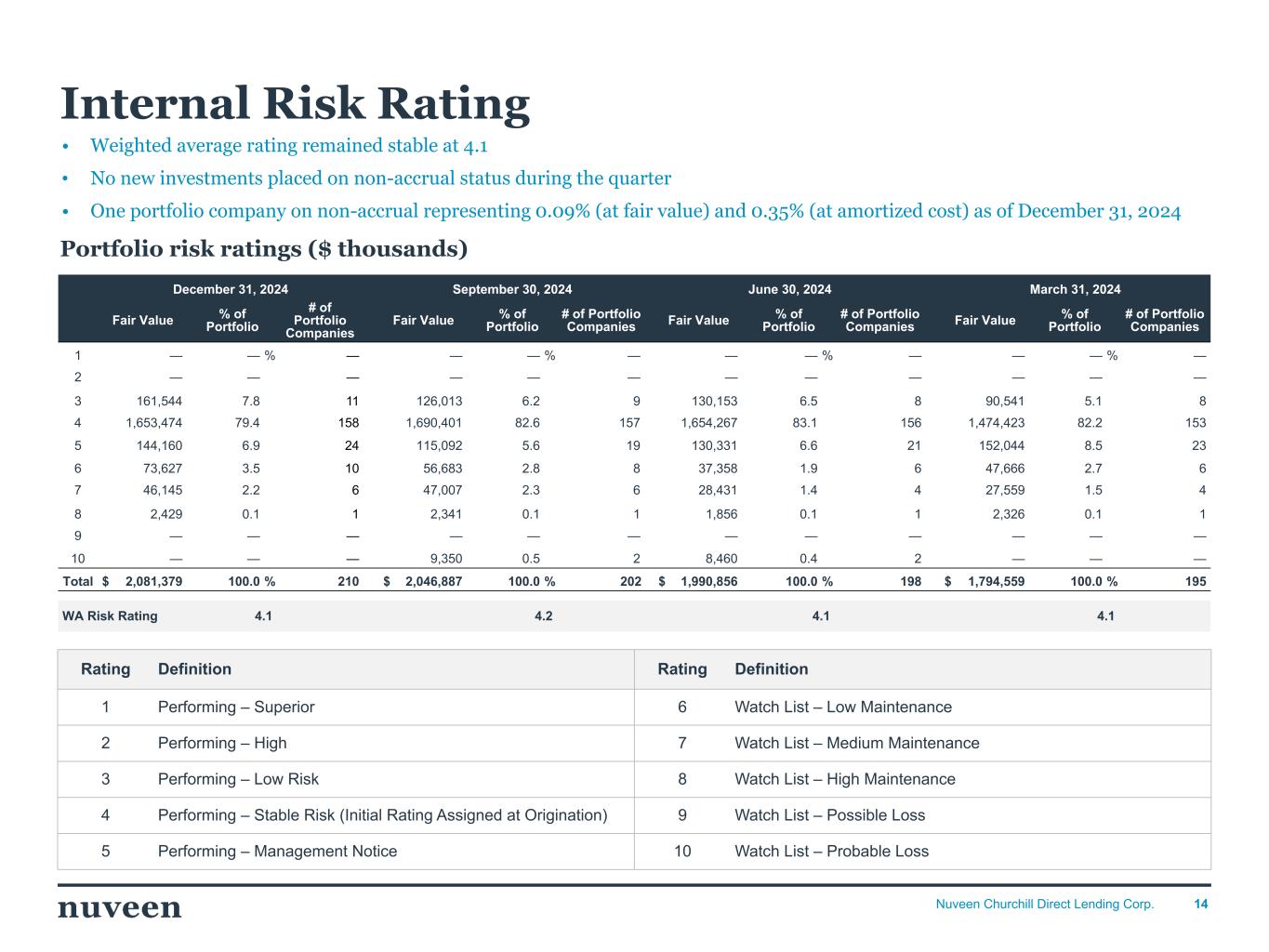 2024年12月31日および2024年9月30日現在、ポートフォリオの公正価値での加重平均内部リスク格付けは、それぞ れ4.1および4.2(4.0は当初格付け)であった。2024年12月31日現在、償却原価での投資総額の0.4%(公正価値での投資総額の0.1%)に相当するノンアクルーアル投資先が1社あった。2024年9月30日現在、償却原価ベースで投資総額の1.4%(公正価値ベースでは0.5%)に相当する3社の 投資先企業がノンアクルーアルとなっている。当四半期中に新たにノンアクルーアル状態になった投資先企業はない。