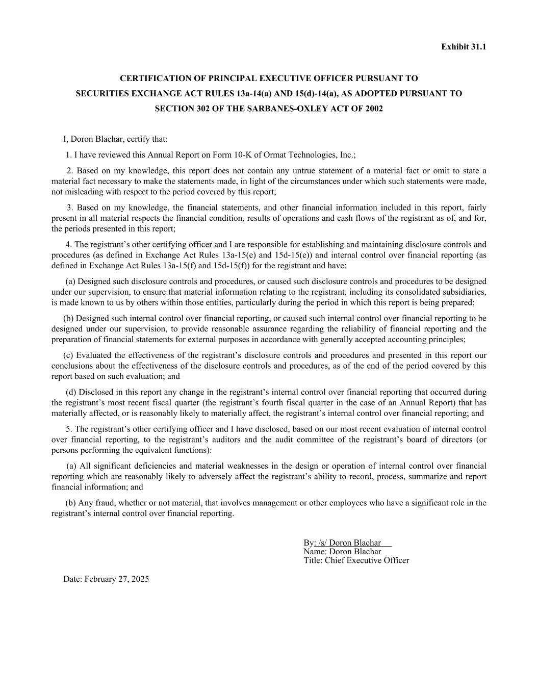Exhibit 31.1 CERTIFICATION OF PRINCIPAL EXECUTIVE OFFICER PURSUANT TO SECURITIES EXCHANGE ACT RULES 13a-14(a) AND 15(d)-14(a), AS ADOPTED PURSUANT TO SECTION 302 OF THE SARBANES-OXLEY ACT OF 2002 I, Doron Blachar, certify that: 1. I have reviewed this Annual Report on Form 10-K of Ormat Technologies, Inc.; 2. Based on my knowledge, this report does not contain any untrue statement of a material fact or omit to state a material fact necessary to make the statements made, in light of the circumstances under which such statements were made, not misleading with respect to the period covered by this report; 3. Based on my knowledge, the financial statements, and other financial information included in this report, fairly present in all material respects the financial condition, results of operations and cash flows of the registrant as of, and for, the periods presented in this report; 4. The registrant’s other certifying officer and I are responsible for establishing and maintaining disclosure controls and procedures (as defined in Exchange Act Rules 13a-15(e) and 15d-15(e)) and internal control over financial reporting (as defined in Exchange Act Rules 13a-15(f) and 15d-15(f)) for the registrant and have: (a) Designed such disclosure controls and procedures, or caused such disclosure controls and procedures to be designed under our supervision, to ensure that material information relating to the registrant, including its consolidated subsidiaries, is made known to us by others within those entities, particularly during the period in which this report is being prepared; (b) Designed such internal control over financial reporting, or caused such internal control over financial reporting to be designed under our supervision, to provide reasonable assurance regarding the reliability of financial reporting and the preparation of financial statements for external purposes in accordance with generally accepted accounting principles; (c) Evaluated the effectiveness of the registrant’s disclosure controls and procedures and presented in this report our conclusions about the effectiveness of the disclosure controls and procedures, as of the end of the period covered by this report based on such evaluation; and (d) Disclosed in this report any change in the registrant’s internal control over financial reporting that occurred during the registrant’s most recent fiscal quarter (the registrant’s fourth fiscal quarter in the case of an Annual Report) that has materially affected, or is reasonably likely to materially affect, the registrant’s internal control over financial reporting; and 5. The registrant’s other certifying officer and I have disclosed, based on our most recent evaluation of internal control over financial reporting, to the registrant’s auditors and the audit committee of the registrant’s board of directors (or persons performing the equivalent functions): (a) All significant deficiencies and material weaknesses in the design or operation of internal control over financial reporting which are reasonably likely to adversely affect the registrant’s ability to record, process, summarize and report financial information; and (b) Any fraud, whether or not material, that involves management or other employees who have a significant role in the registrant’s internal control over financial reporting. By: /s/ Doron Blachar Name: Doron Blachar Title: Chief Executive Officer Date: February 27, 2025