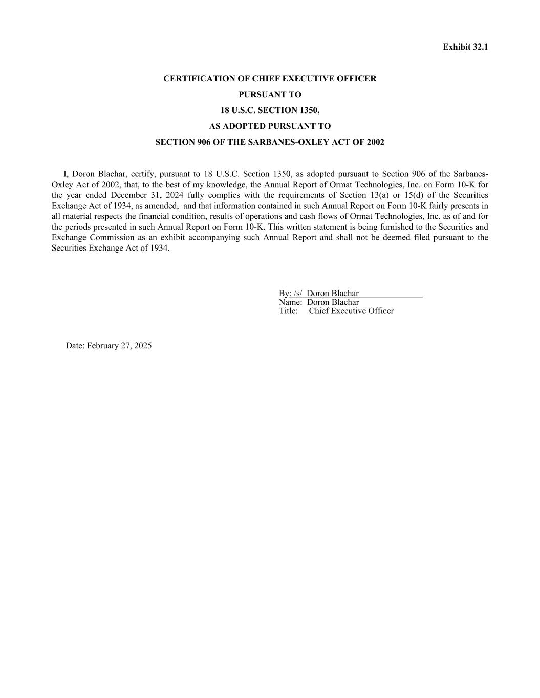 Exhibit 32.1 CERTIFICATION OF CHIEF EXECUTIVE OFFICER PURSUANT TO 18 U.S.C. SECTION 1350, AS ADOPTED PURSUANT TO SECTION 906 OF THE SARBANES-OXLEY ACT OF 2002 I, Doron Blachar, certify, pursuant to 18 U.S.C. Section 1350, as adopted pursuant to Section 906 of the Sarbanes- Oxley Act of 2002, that, to the best of my knowledge, the Annual Report of Ormat Technologies, Inc. on Form 10-K for the year ended December 31, 2024 fully complies with the requirements of Section 13(a) or 15(d) of the Securities Exchange Act of 1934, as amended, and that information contained in such Annual Report on Form 10-K fairly presents in all material respects the financial condition, results of operations and cash flows of Ormat Technologies, Inc. as of and for the periods presented in such Annual Report on Form 10-K. This written statement is being furnished to the Securities and Exchange Commission as an exhibit accompanying such Annual Report and shall not be deemed filed pursuant to the Securities Exchange Act of 1934. By: /s/ Doron Blachar Name: Doron Blachar Title: Chief Executive Officer Date: February 27, 2025