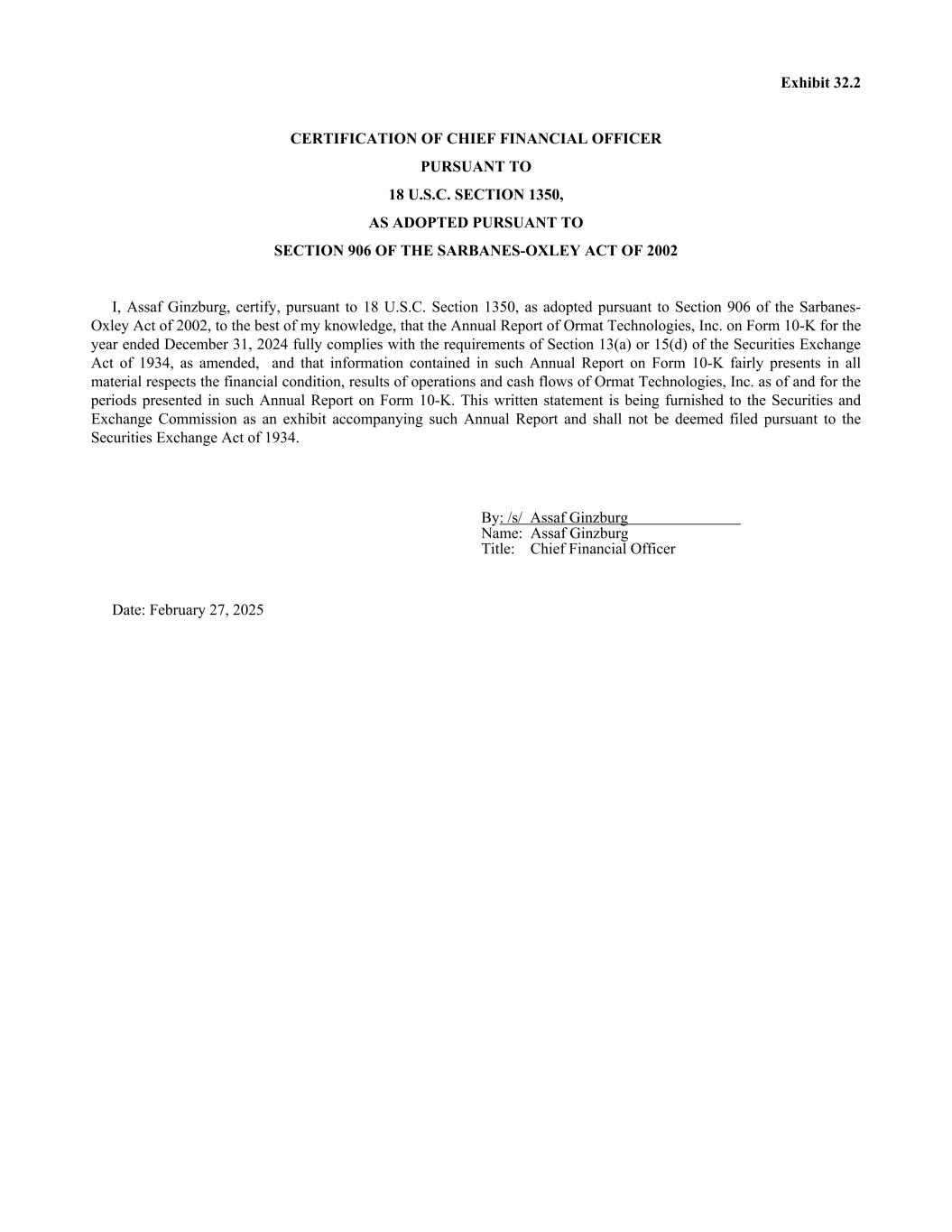 Exhibit 32.2 CERTIFICATION OF CHIEF FINANCIAL OFFICER PURSUANT TO 18 U.S.C. SECTION 1350, AS ADOPTED PURSUANT TO SECTION 906 OF THE SARBANES-OXLEY ACT OF 2002 I, Assaf Ginzburg, certify, pursuant to 18 U.S.C. Section 1350, as adopted pursuant to Section 906 of the Sarbanes- Oxley Act of 2002, to the best of my knowledge, that the Annual Report of Ormat Technologies, Inc. on Form 10-K for the year ended December 31, 2024 fully complies with the requirements of Section 13(a) or 15(d) of the Securities Exchange Act of 1934, as amended, and that information contained in such Annual Report on Form 10-K fairly presents in all material respects the financial condition, results of operations and cash flows of Ormat Technologies, Inc. as of and for the periods presented in such Annual Report on Form 10-K. This written statement is being furnished to the Securities and Exchange Commission as an exhibit accompanying such Annual Report and shall not be deemed filed pursuant to the Securities Exchange Act of 1934. By: /s/ Assaf Ginzburg Name: Assaf Ginzburg Title: Chief Financial Officer Date: February 27, 2025