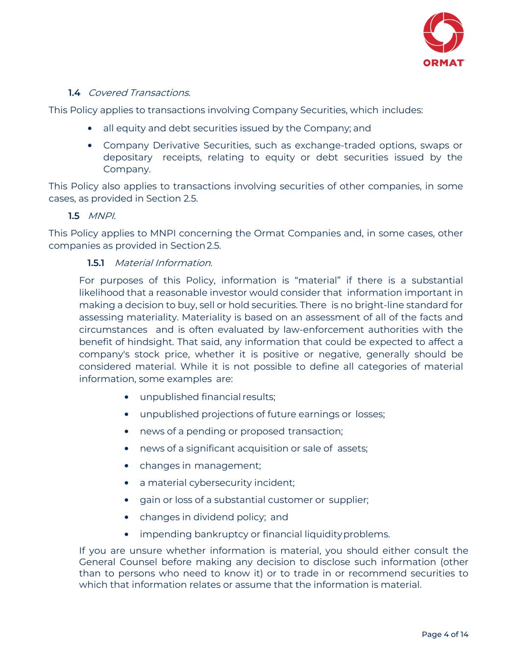 Page 4 of 14 1.4 Covered Transactions. This Policy applies to transactions involving Company Securities, which includes: • all equity and debt securities issued by the Company; and • Company Derivative Securities, such as exchange-traded options, swaps or depositary receipts, relating to equity or debt securities issued by the Company. This Policy also applies to transactions involving securities of other companies, in some cases, as provided in Section 2.5. 1.5 MNPI. This Policy applies to MNPI concerning the Ormat Companies and, in some cases, other companies as provided in Section 2.5. 1.5.1 Material Information. For purposes of this Policy, information is “material” if there is a substantial likelihood that a reasonable investor would consider that information important in making a decision to buy, sell or hold securities. There is no bright-line standard for assessing materiality. Materiality is based on an assessment of all of the facts and circumstances and is often evaluated by law-enforcement authorities with the benefit of hindsight. That said, any information that could be expected to affect a company's stock price, whether it is positive or negative, generally should be considered material. While it is not possible to define all categories of material information, some examples are: • unpublished financial results; • unpublished projections of future earnings or losses; • news of a pending or proposed transaction; • news of a significant acquisition or sale of assets; • changes in management; • a material cybersecurity incident; • gain or loss of a substantial customer or supplier; • changes in dividend policy; and • impending bankruptcy or financial liquidity problems. If you are unsure whether information is material, you should either consult the General Counsel before making any decision to disclose such information (other than to persons who need to know it) or to trade in or recommend securities to which that information relates or assume that the information is material.