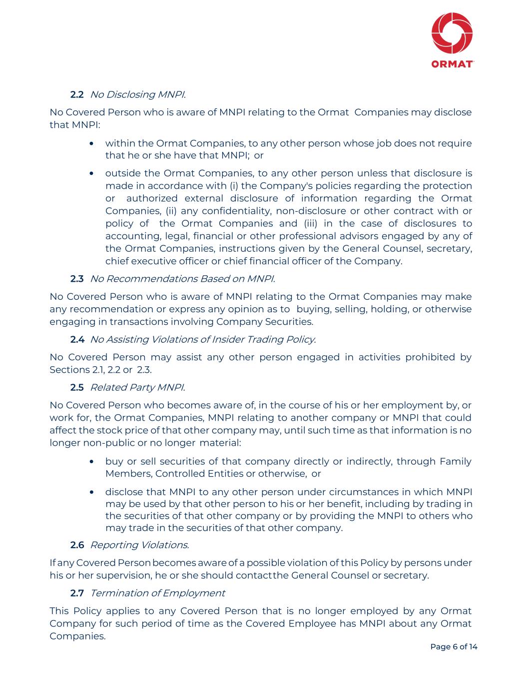 Page 6 of 14 2.2 No Disclosing MNPI. No Covered Person who is aware of MNPI relating to the Ormat Companies may disclose that MNPI: • within the Ormat Companies, to any other person whose job does not require that he or she have that MNPI; or • outside the Ormat Companies, to any other person unless that disclosure is made in accordance with (i) the Company's policies regarding the protection or authorized external disclosure of information regarding the Ormat Companies, (ii) any confidentiality, non-disclosure or other contract with or policy of the Ormat Companies and (iii) in the case of disclosures to accounting, legal, financial or other professional advisors engaged by any of the Ormat Companies, instructions given by the General Counsel, secretary, chief executive officer or chief financial officer of the Company. 2.3 No Recommendations Based on MNPI. No Covered Person who is aware of MNPI relating to the Ormat Companies may make any recommendation or express any opinion as to buying, selling, holding, or otherwise engaging in transactions involving Company Securities. 2.4 No Assisting Violations of Insider Trading Policy. No Covered Person may assist any other person engaged in activities prohibited by Sections 2.1, 2.2 or 2.3. 2.5 Related Party MNPI. No Covered Person who becomes aware of, in the course of his or her employment by, or work for, the Ormat Companies, MNPI relating to another company or MNPI that could affect the stock price of that other company may, until such time as that information is no longer non-public or no longer material: • buy or sell securities of that company directly or indirectly, through Family Members, Controlled Entities or otherwise, or • disclose that MNPI to any other person under circumstances in which MNPI may be used by that other person to his or her benefit, including by trading in the securities of that other company or by providing the MNPI to others who may trade in the securities of that other company. 2.6 Reporting Violations. If any Covered Person becomes aware of a possible violation of this Policy by persons under his or her supervision, he or she should contact the General Counsel or secretary. 2.7 Termination of Employment This Policy applies to any Covered Person that is no longer employed by any Ormat Company for such period of time as the Covered Employee has MNPI about any Ormat Companies.
