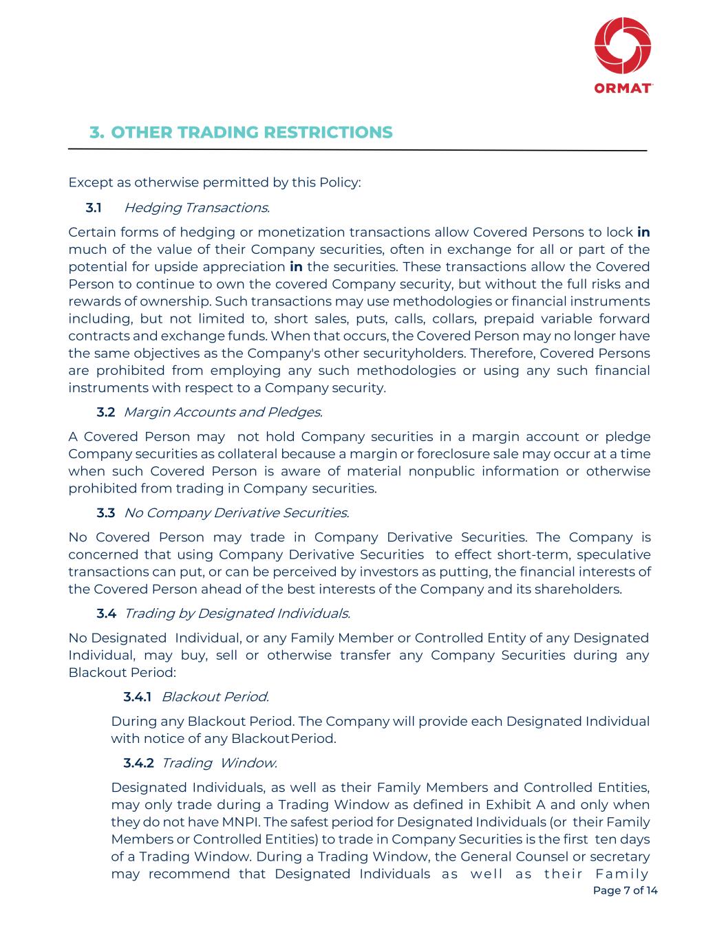 Page 3 of 14 1. INTRODUCTION Ormat Technologies, Inc. (the “Company”) has adopted the policies, guidelines and procedures in this policy (the “Policy”) to: • promote compliance with certain securities laws that prohibit certain persons who have material, non-public information (“MNPI”) about a company from: o trading in securities of that company; or o providing that MNPI to other persons who may trade securities of that company; or o making recommendations or expressing any opinion as to buying, selling, holding or otherwise engaging in transactions involving the Company. • restrict certain types of transactions involving securities of the Company; and • supplement other confidentiality, non-disclosure and similar policies, contracts and rules concerning information of the Company or any subsidiaries of the Company (the “Ormat Companies”). 1.1 Policy Administration and Questions. This Policy is administered by the General Counsel of the Company (the “General Counsel”). Any questions about this Policy should be directed to the General Counsel c/o Ormat Technologies, Inc. 1.2 Defined Terms. The Policy uses legal and other terms defined in Exhibit A, which determine the persons and transactions subject to particular policies, guidelines and procedures under this Policy. 1.3 Covered Persons. This Policy applies to all Covered Persons, which includes: • all employees of any Ormat Company; • all executive officers of any Ormat Company; • all directors of any Ormat Company; • all Family Members and Controlled Entities of any employee, officer or director of any Ormat Company; and • any consultant, advisor, agent, contractor OR temporary, loaned, contracted or seconded employee or other person that becomes subject to this Policy by contract or agreement with any Ormat Company, and all Family Members and Controlled Entities of any such person. Certain policies, guidelines and procedures in this Policy apply to a more limited group of persons, as described below.