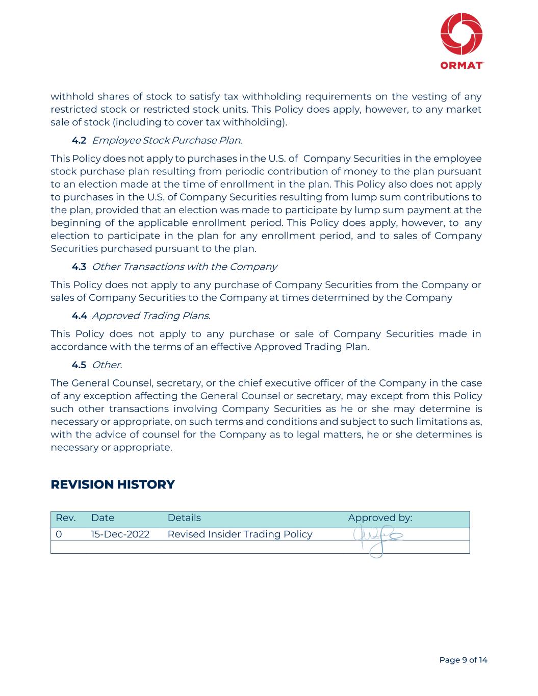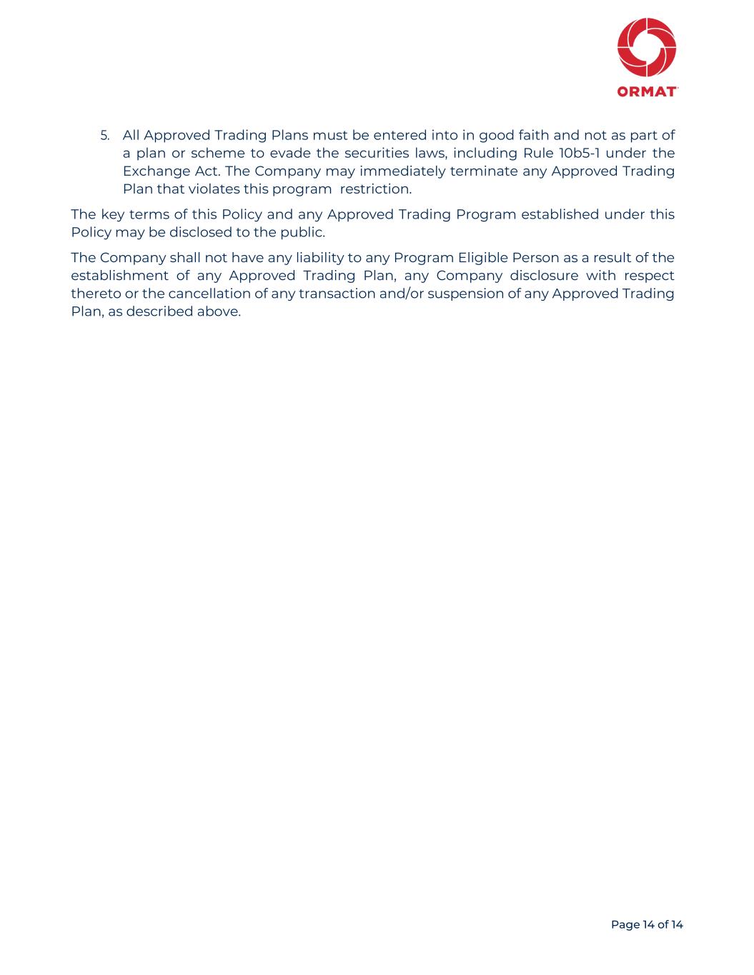 Page 8 of 14 M e m be r s a n d Co n tr o l l e d E nt i t i e s suspend trading because of material developments involving the Ormat Companies that have not yet been disclosed to the public. All those affected shall not trade in Company Securities while the suspension is in effect and shall not disclose to others that the Company has suspended trading for certain individuals. 3.4.3 Preclearance of Trades. Prior to trading, Designated Individuals, as well as their Family Members and Controlled Entities, must obtain for any trade the prior approval of (i) the General Counsel or secretary or (ii) in the case of any transaction by the General Counsel or secretary (or any Family Member or Controlled Entity of the General Counsel or secretary), the chief executive officer of the Company. A request for pre clearance should be submitted to the General Counsel or secretary at least one Trading Day in advance of the proposed transaction. The General Counsel or secretary is under no obligation to approve a transaction submitted for pre-clearance and may determine not to permit the transaction. If a Designated Individual or a Family Member or a Controlled Entity of such Designated Individual who seeks preclearance is denied permission to engage in the transaction, then he or she should refrain from initiating any transaction in Company Securities and should not inform any other person of the denial. When a request for pre-clearance is made, the Designated Individual or a Family Member or a Controlled Entity of such Designated Individual should carefully consider whether he or she may be aware of any MNPI about the Ormat Companies and should describe fully those circumstances to the General Counsel or secretary. The Designated Individual should also indicate whether he or she has effected any nonexempt "opposite-way" transactions within the past six months, and should be prepared to report the proposed transaction on an appropriate Form 4 or Form 5. The Designated Individual should also be prepared to comply with Exchange Act Rule 144 and file Form 144, if necessary, at the time of any sale. According to Israeli Securities Law there is a presumption that MNPI was used when certain principal insiders effect “opposite-way” transactions within a period of three months (buying Company securities within three months after selling Company securities or vice versa). Therefore, unless an exception is granted by the General Counsel or secretary after carefully examining the legal aspects and the circumstances of the case, Designated Individuals are not allowed to engage in such transactions. 4. EXCEPTIONS TO TRADING RESTRICTIONS 4.1 Restricted Stock. This Policy does not apply to the vesting of restricted stock or restricted stock units, or the exercise of a tax withholding right under which a person elects to have the Company