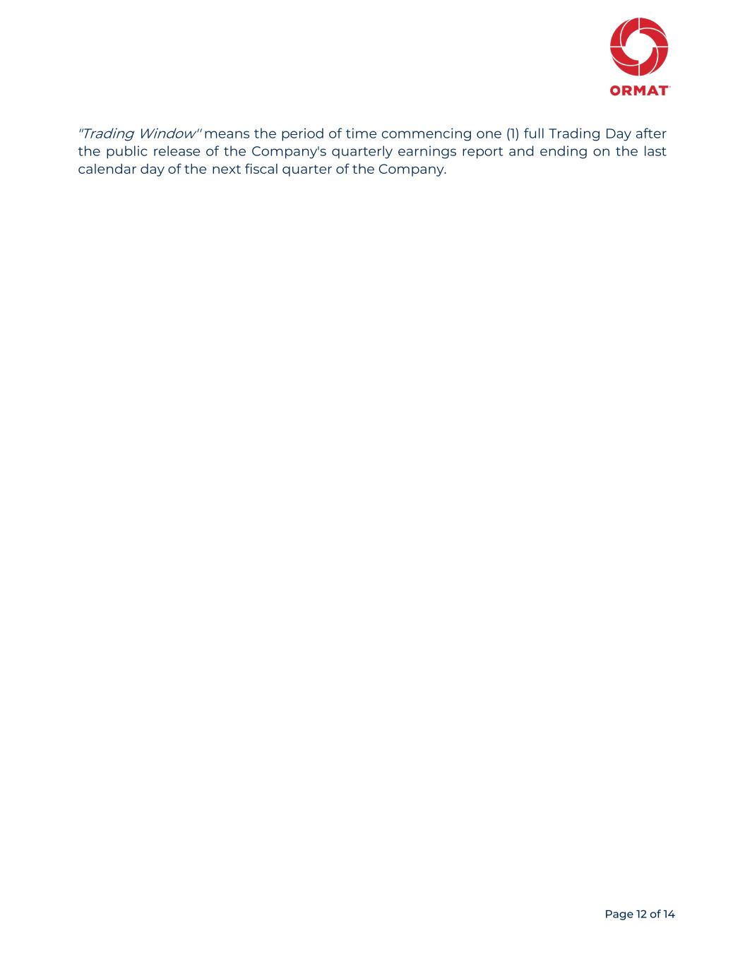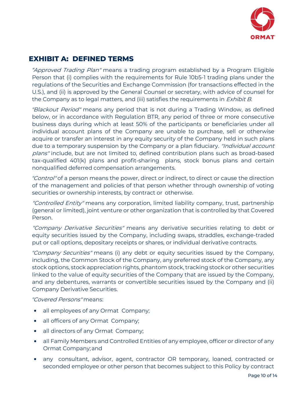 Page 10 of 14 EXHIBIT A: DEFINED TERMS “Approved Trading Plan" means a trading program established by a Program Eligible Person that (i) complies with the requirements for Rule 10b5-1 trading plans under the regulations of the Securities and Exchange Commission (for transactions effected in the U.S.), and (ii) is approved by the General Counsel or secretary, with advice of counsel for the Company as to legal matters, and (iii) satisfies the requirements in Exhibit B. "Blackout Period" means any period that is not during a Trading Window, as defined below, or in accordance with Regulation BTR, any period of three or more consecutive business days during which at least 50% of the participants or beneficiaries under all individual account plans of the Company are unable to purchase, sell or otherwise acquire or transfer an interest in any equity security of the Company held in such plans due to a temporary suspension by the Company or a plan fiduciary. "Individual account plans" include, but are not limited to, defined contribution plans such as broad-based tax-qualified 401(k) plans and profit-sharing plans, stock bonus plans and certain nonqualified deferred compensation arrangements. "Control" of a person means the power, direct or indirect, to direct or cause the direction of the management and policies of that person whether through ownership of voting securities or ownership interests, by contract or otherwise. "Controlled Entity" means any corporation, limited liability company, trust, partnership (general or limited), joint venture or other organization that is controlled by that Covered Person. "Company Derivative Securities" means any derivative securities relating to debt or equity securities issued by the Company, including swaps, straddles, exchange-traded put or call options, depositary receipts or shares, or individual derivative contracts. "Company Securities" means (i) any debt or equity securities issued by the Company, including, the Common Stock of the Company, any preferred stock of the Company, any stock options, stock appreciation rights, phantom stock, tracking stock or other securities linked to the value of equity securities of the Company that are issued by the Company, and any debentures, warrants or convertible securities issued by the Company and (ii) Company Derivative Securities. "Covered Persons" means: • all employees of any Ormat Company; • all officers of any Ormat Company; • all directors of any Ormat Company; • all Family Members and Controlled Entities of any employee, officer or director of any Ormat Company; and • any consultant, advisor, agent, contractor OR temporary, loaned, contracted or seconded employee or other person that becomes subject to this Policy by contract