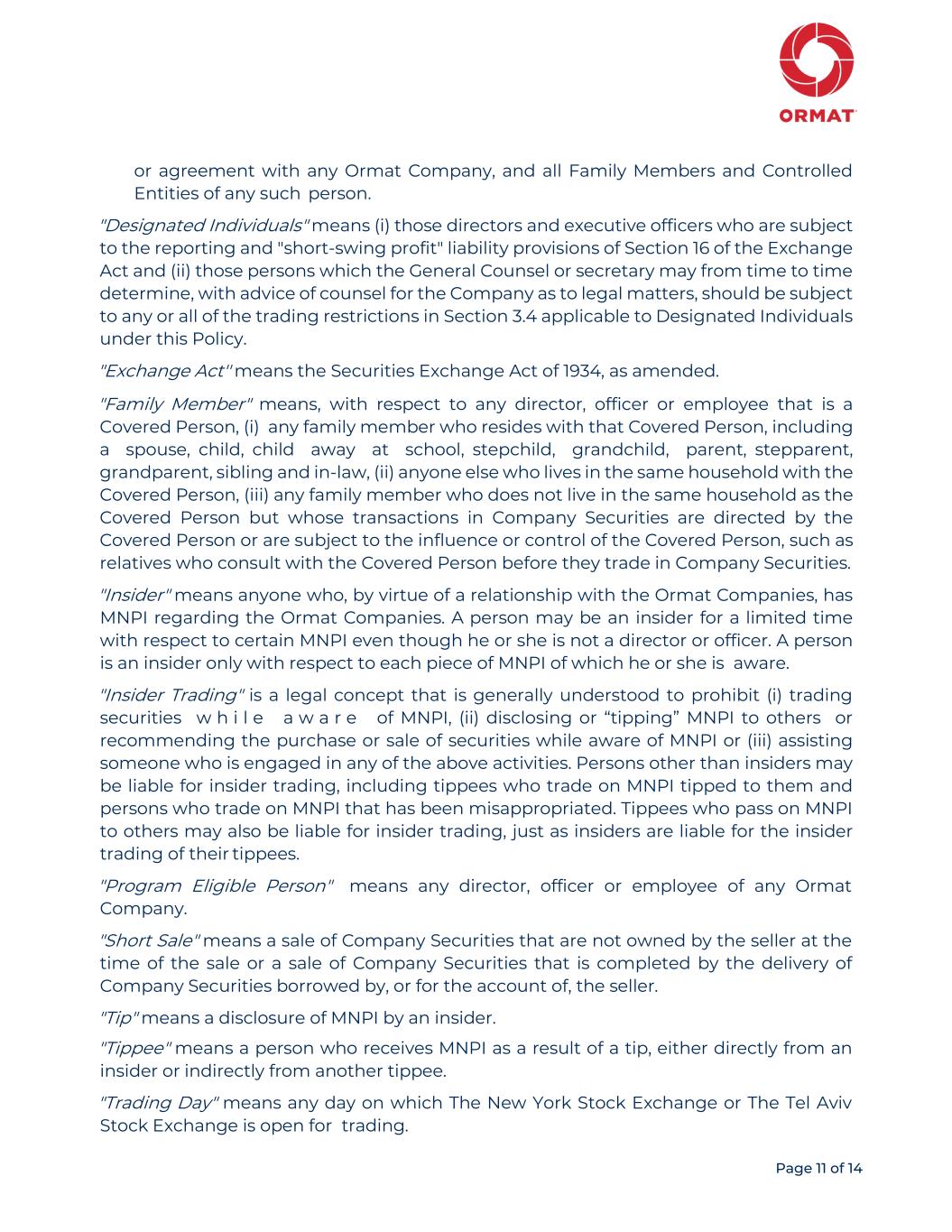 Page 11 of 14 or agreement with any Ormat Company, and all Family Members and Controlled Entities of any such person. "Designated Individuals" means (i) those directors and executive officers who are subject to the reporting and "short-swing profit" liability provisions of Section 16 of the Exchange Act and (ii) those persons which the General Counsel or secretary may from time to time determine, with advice of counsel for the Company as to legal matters, should be subject to any or all of the trading restrictions in Section 3.4 applicable to Designated Individuals under this Policy. "Exchange Act'' means the Securities Exchange Act of 1934, as amended. "Family Member" means, with respect to any director, officer or employee that is a Covered Person, (i) any family member who resides with that Covered Person, including a spouse, child, child away at school, stepchild, grandchild, parent, stepparent, grandparent, sibling and in-law, (ii) anyone else who lives in the same household with the Covered Person, (iii) any family member who does not live in the same household as the Covered Person but whose transactions in Company Securities are directed by the Covered Person or are subject to the influence or control of the Covered Person, such as relatives who consult with the Covered Person before they trade in Company Securities. "Insider" means anyone who, by virtue of a relationship with the Ormat Companies, has MNPI regarding the Ormat Companies. A person may be an insider for a limited time with respect to certain MNPI even though he or she is not a director or officer. A person is an insider only with respect to each piece of MNPI of which he or she is aware. "Insider Trading" is a legal concept that is generally understood to prohibit (i) trading securities w h i l e a w a r e of MNPI, (ii) disclosing or “tipping” MNPI to others or recommending the purchase or sale of securities while aware of MNPI or (iii) assisting someone who is engaged in any of the above activities. Persons other than insiders may be liable for insider trading, including tippees who trade on MNPI tipped to them and persons who trade on MNPI that has been misappropriated. Tippees who pass on MNPI to others may also be liable for insider trading, just as insiders are liable for the insider trading of their tippees. "Program Eligible Person" means any director, officer or employee of any Ormat Company. "Short Sale" means a sale of Company Securities that are not owned by the seller at the time of the sale or a sale of Company Securities that is completed by the delivery of Company Securities borrowed by, or for the account of, the seller. "Tip" means a disclosure of MNPI by an insider. "Tippee" means a person who receives MNPI as a result of a tip, either directly from an insider or indirectly from another tippee. "Trading Day" means any day on which The New York Stock Exchange or The Tel Aviv Stock Exchange is open for trading.