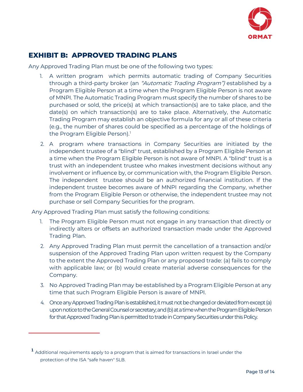 Page 13 of 14 EXHIBIT B: APPROVED TRADING PLANS Any Approved Trading Plan must be one of the following two types: 1. A written program which permits automatic trading of Company Securities through a third-party broker (an “Automatic Trading Program”) established by a Program Eligible Person at a time when the Program Eligible Person is not aware of MNPI. The Automatic Trading Program must specify the number of shares to be purchased or sold, the price(s) at which transaction(s) are to take place, and the date(s) on which transaction(s) are to take place. Alternatively, the Automatic Trading Program may establish an objective formula for any or all of these criteria (e.g., the number of shares could be specified as a percentage of the holdings of the Program Eligible Person).1 2. A program where transactions in Company Securities are initiated by the independent trustee of a "blind" trust, established by a Program Eligible Person at a time when the Program Eligible Person is not aware of MNPI. A "blind" trust is a trust with an independent trustee who makes investment decisions without any involvement or influence by, or communication with, the Program Eligible Person. The independent trustee should be an authorized financial institution. If the independent trustee becomes aware of MNPI regarding the Company, whether from the Program Eligible Person or otherwise, the independent trustee may not purchase or sell Company Securities for the program. Any Approved Trading Plan must satisfy the following conditions: 1. The Program Eligible Person must not engage in any transaction that directly or indirectly alters or offsets an authorized transaction made under the Approved Trading Plan. 2. Any Approved Trading Plan must permit the cancellation of a transaction and/or suspension of the Approved Trading Plan upon written request by the Company to the extent the Approved Trading Plan or any proposed trade: (a) fails to comply with applicable law; or (b) would create material adverse consequences for the Company. 3. No Approved Trading Plan may be established by a Program Eligible Person at any time that such Program Eligible Person is aware of MNPI. 4. Once any Approved Trading Plan is established, it must not be changed or deviated from except (a) upon notice to the General Counsel or secretary; and (b) at a time when the Program Eligible Person for that Approved Trading Plan is permitted to trade in Company Securities under this Policy. 1 Additional requirements apply to a program that is aimed for transactions in Israel under the protection of the ISA "safe haven" SLB.
