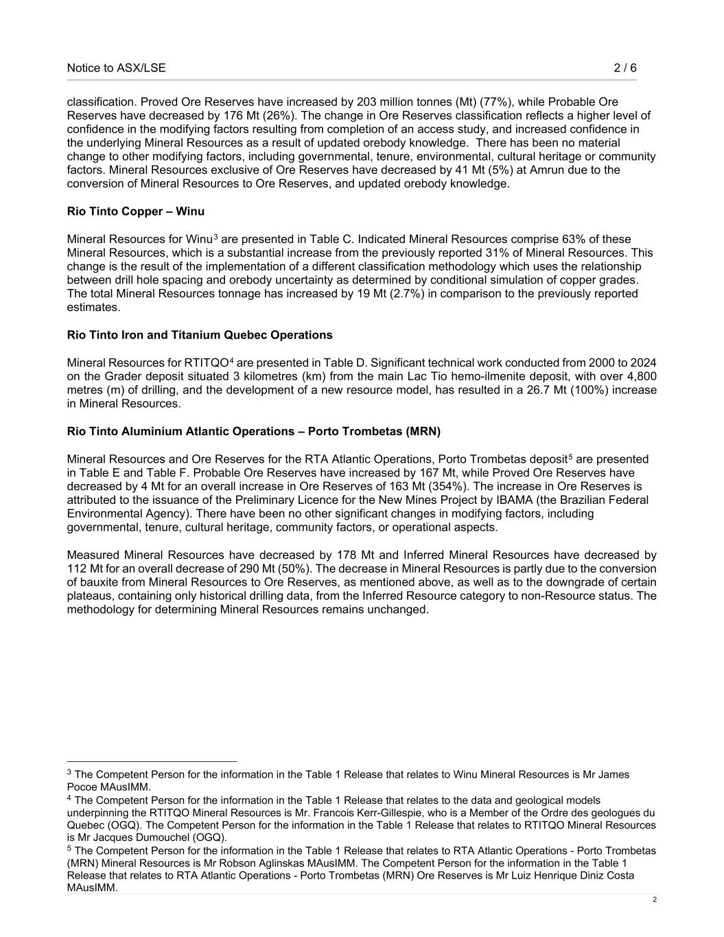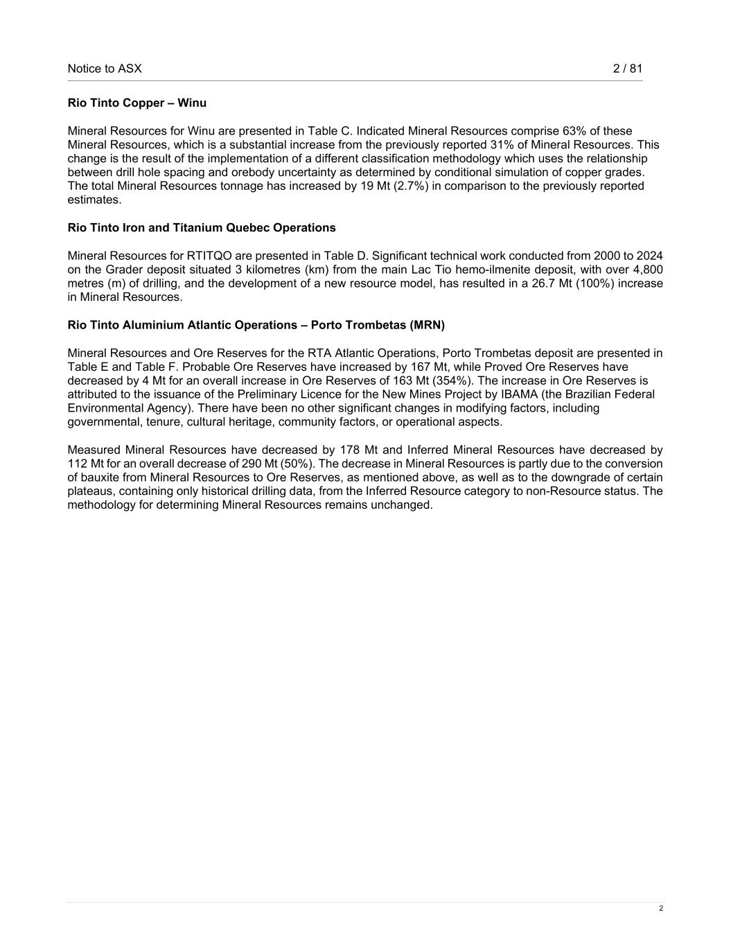 Notice to ASX 2 / 81 2 Rio Tinto Copper – Winu Mineral Resources for Winu are presented in Table C. Indicated Mineral Resources comprise 63% of these Mineral Resources, which is a substantial increase from the previously reported 31% of Mineral Resources. This change is the result of the implementation of a different classification methodology which uses the relationship between drill hole spacing and orebody uncertainty as determined by conditional simulation of copper grades. The total Mineral Resources tonnage has increased by 19 Mt (2.7%) in comparison to the previously reported estimates. Rio Tinto Iron and Titanium Quebec Operations Mineral Resources for RTITQO are presented in Table D. Significant technical work conducted from 2000 to 2024 on the Grader deposit situated 3 kilometres (km) from the main Lac Tio hemo-ilmenite deposit, with over 4,800 metres (m) of drilling, and the development of a new resource model, has resulted in a 26.7 Mt (100%) increase in Mineral Resources. Rio Tinto Aluminium Atlantic Operations – Porto Trombetas (MRN) Mineral Resources and Ore Reserves for the RTA Atlantic Operations, Porto Trombetas deposit are presented in Table E and Table F. Probable Ore Reserves have increased by 167 Mt, while Proved Ore Reserves have decreased by 4 Mt for an overall increase in Ore Reserves of 163 Mt (354%). The increase in Ore Reserves is attributed to the issuance of the Preliminary Licence for the New Mines Project by IBAMA (the Brazilian Federal Environmental Agency). There have been no other significant changes in modifying factors, including governmental, tenure, cultural heritage, community factors, or operational aspects. Measured Mineral Resources have decreased by 178 Mt and Inferred Mineral Resources have decreased by 112 Mt for an overall decrease of 290 Mt (50%). The decrease in Mineral Resources is partly due to the conversion of bauxite from Mineral Resources to Ore Reserves, as mentioned above, as well as to the downgrade of certain plateaus, containing only historical drilling data, from the Inferred Resource category to non-Resource status. The methodology for determining Mineral Resources remains unchanged.