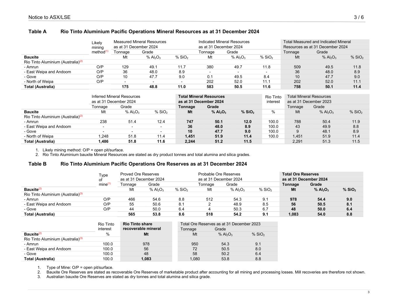 Notice to ASX 3 / 81 3 Table A Rio Tinto Aluminium Pacific Operations Mineral Resources as at 31 December 2024 Likely mining method(1) Measured Mineral Resources Indicated Mineral Resources Total Measured and Indicated Mineral as at 31 December 2024 as at 31 December 2024 Resources as at 31 December 2024 Tonnage Grade Tonnage Grade Tonnage Grade Bauxite Mt % Al2O3 % SiO2 Mt % Al2O3 % SiO2 Mt % Al2O3 % SiO2 Rio Tinto Aluminium (Australia)(2) - Amrun O/P 129 49.1 11.7 380 49.7 11.8 509 49.5 11.8 - East Weipa and Andoom O/P 36 48.0 8.9 - - - 36 48.0 8.9 - Gove O/P 10 47.7 9.0 0.1 49.5 8.4 10 47.7 9.0 - North of Weipa O/P - - - 202 52.0 11.1 202 52.0 11.1 Total (Australia) 175 48.8 11.0 583 50.5 11.6 758 50.1 11.4 Inferred Mineral Resources Total Mineral Resources Rio Tinto interest Total Mineral Resources as at 31 December 2024 as at 31 December 2024 as at 31 December 2023 Tonnage Grade Tonnage Grade Tonnage Grade Bauxite Mt % Al2O3 % SiO2 Mt % Al2O3 % SiO2 % Mt % Al2O3 % SiO2 Rio Tinto Aluminium (Australia)(2) - Amrun 238 51.4 12.4 747 50.1 12.0 100.0 788 50.4 11.9 - East Weipa and Andoom - - - 36 48.0 8.9 100.0 43 49.9 8.8 - Gove - - - 10 47.7 9.0 100.0 9 48.1 8.9 - North of Weipa 1,248 51.8 11.4 1,451 51.9 11.4 100.0 1,451 51.9 11.4 Total (Australia) 1,486 51.8 11.6 2,244 51.2 11.5 2,291 51.3 11.5 1. Likely mining method: O/P = open pit/surface. 2. Rio Tinto Aluminium bauxite Mineral Resources are stated as dry product tonnes and total alumina and silica grades. Table B Rio Tinto Aluminium Pacific Operations Ore Reserves as at 31 December 2024 Type of mine(1) Proved Ore Reserves Probable Ore Reserves Total Ore Reserves as at 31 December 2024 as at 31 December 2024 as at 31 December 2024 Tonnage Grade Tonnage Grade Tonnage Grade Bauxite(2) Mt % Al2O3 % SiO2 Mt % Al2O3 % SiO2 Mt % Al2O3 % SiO2 Rio Tinto Aluminium (Australia)(3) - Amrun O/P 466 54.6 8.8 512 54.3 9.1 978 54.4 9.0 - East Weipa and Andoom O/P 55 50.6 8.1 2 48.9 8.5 56 50.5 8.1 - Gove O/P 44 50.0 6.4 4 50.3 6.7 48 50.0 6.4 Total (Australia) 565 53.8 8.6 518 54.2 9.1 1,083 54.0 8.8 Rio Tinto interest Rio Tinto share recoverable mineral Total Ore Reserves as at 31 December 2023 Tonnage Grade Bauxite(2) % Mt Mt % Al2O3 % SiO2 Rio Tinto Aluminium (Australia)(3) - Amrun 100.0 978 950 54.3 9.1 - East Weipa and Andoom 100.0 56 72 50.5 8.0 - Gove 100.0 48 58 50.2 6.4 Total (Australia) 100.0 1,083 1,080 53.8 8.8 1. Type of Mine: O/P = open pit/surface. 2. Bauxite Ore Reserves are stated as recoverable Ore Reserves of marketable product after accounting for all mining and processing losses. Mill recoveries are therefore not shown. 3. Australian bauxite Ore Reserves are stated as dry tonnes and total alumina and silica grade.