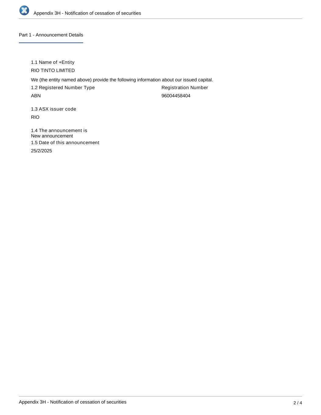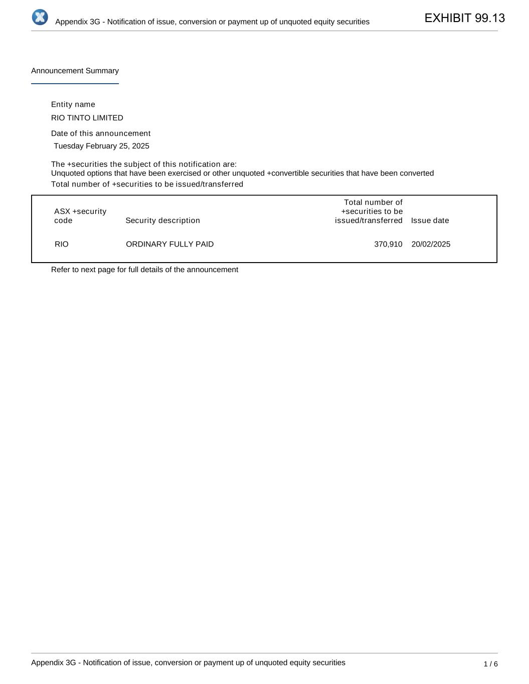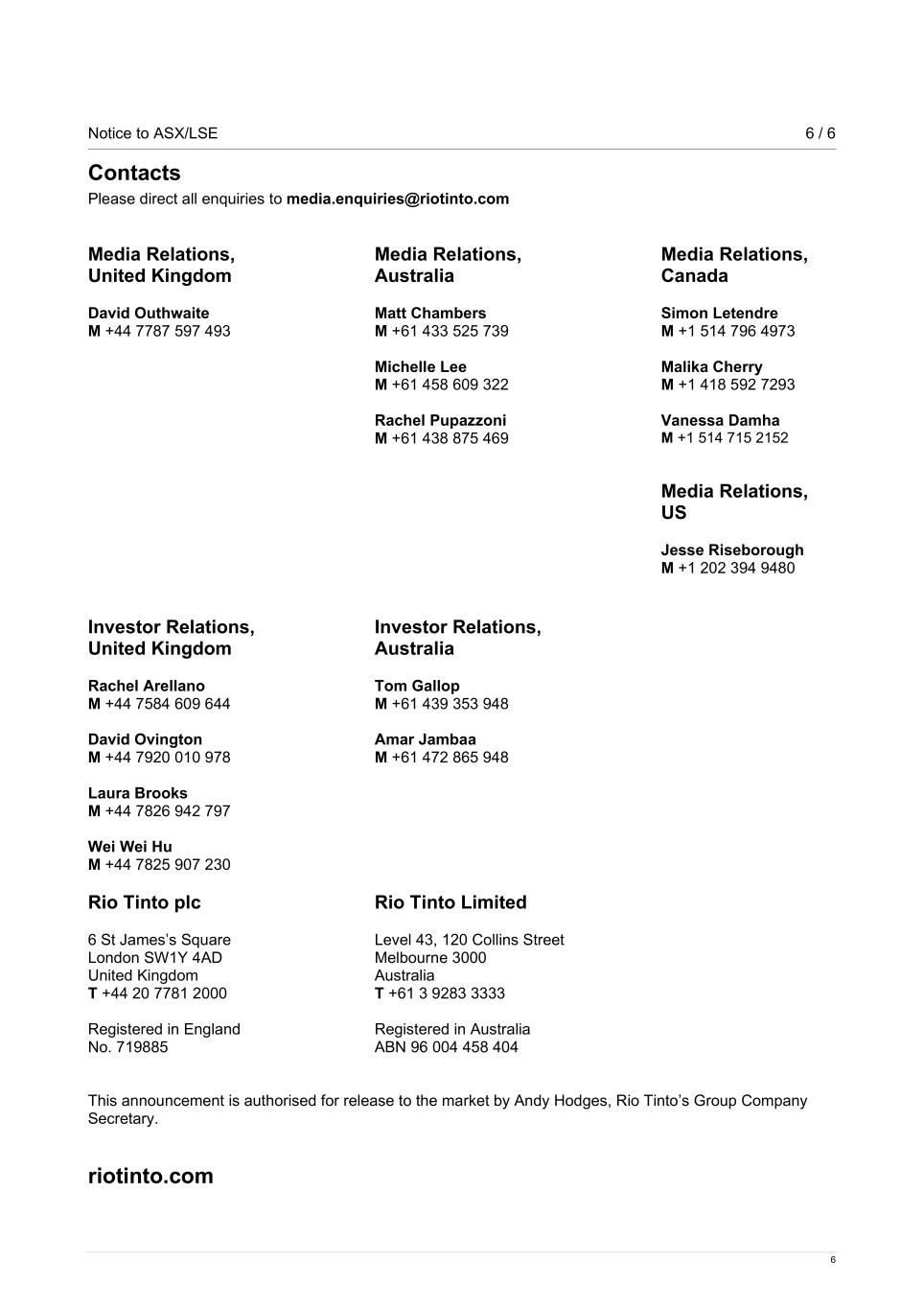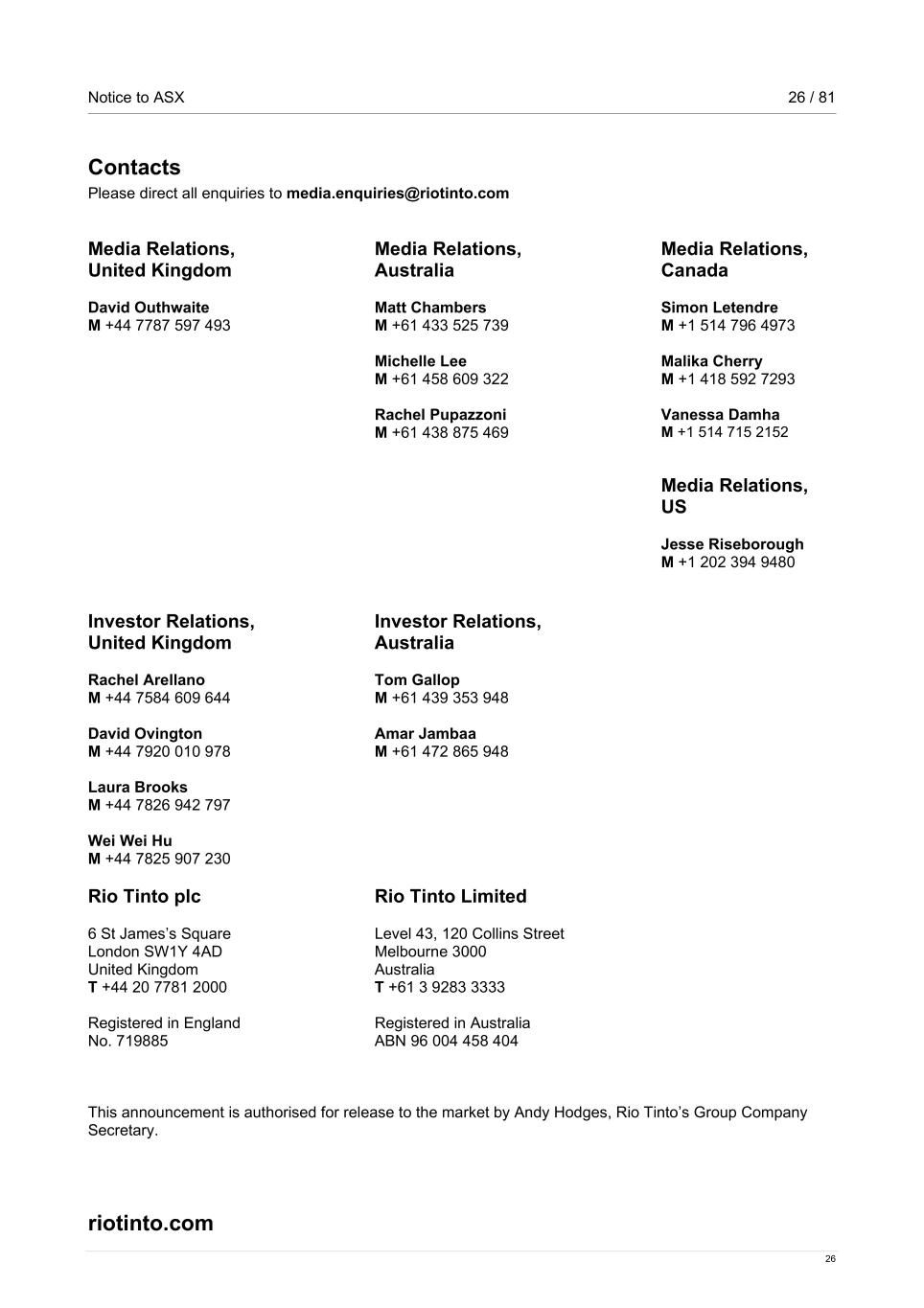 Notice to ASX 26 / 81 26 Contacts Please direct all enquiries to media.enquiries@riotinto.com Media Relations, United Kingdom David Outhwaite M +44 7787 597 493 Media Relations, Australia Matt Chambers M +61 433 525 739 Michelle Lee M +61 458 609 322 Rachel Pupazzoni M +61 438 875 469 Media Relations, Canada Simon Letendre M +1 514 796 4973 Malika Cherry M +1 418 592 7293 Vanessa Damha M +1 514 715 2152 Media Relations, US Jesse Riseborough M +1 202 394 9480 Investor Relations, United Kingdom Rachel Arellano M +44 7584 609 644 David Ovington M +44 7920 010 978 Laura Brooks M +44 7826 942 797 Wei Wei Hu M +44 7825 907 230 Investor Relations, Australia Tom Gallop M +61 439 353 948 Amar Jambaa M +61 472 865 948 Rio Tinto plc 6 St James’s Square London SW1Y 4AD United Kingdom T +44 20 7781 2000 Registered in England No. 719885 Rio Tinto Limited Level 43, 120 Collins Street Melbourne 3000 Australia T +61 3 9283 3333 Registered in Australia ABN 96 004 458 404 This announcement is authorised for release to the market by Andy Hodges, Rio Tinto’s Group Company Secretary. riotinto.com