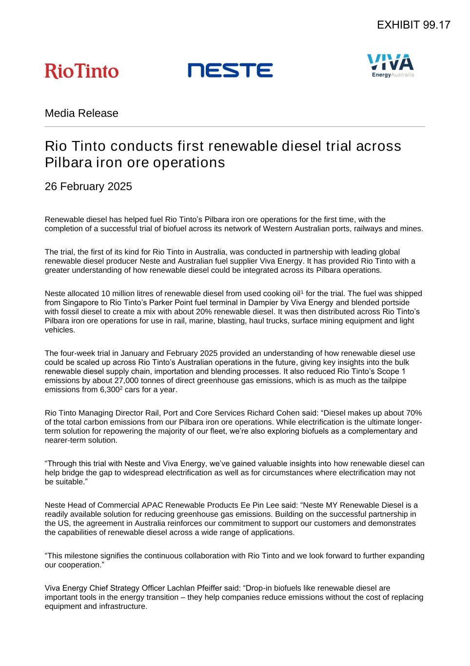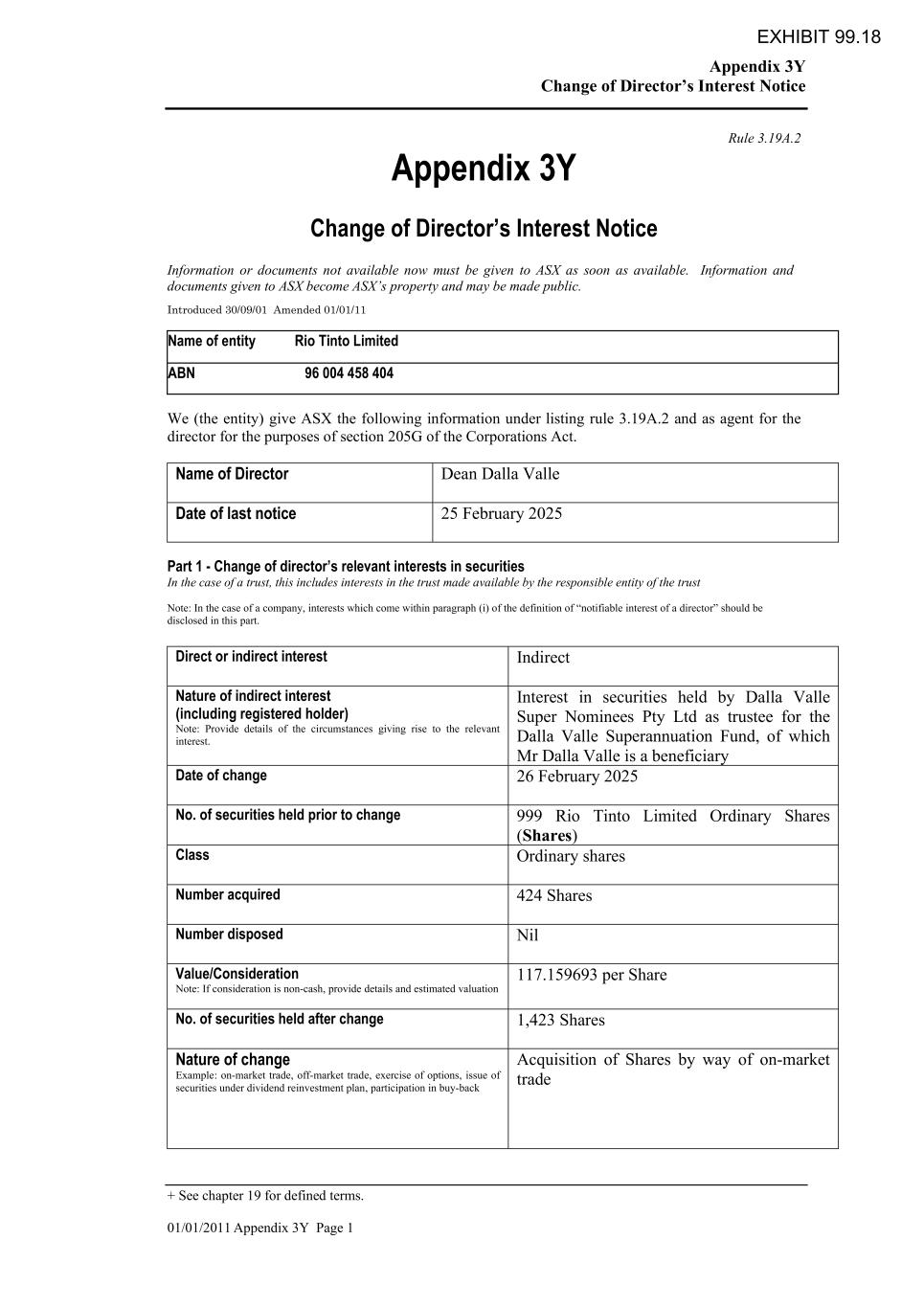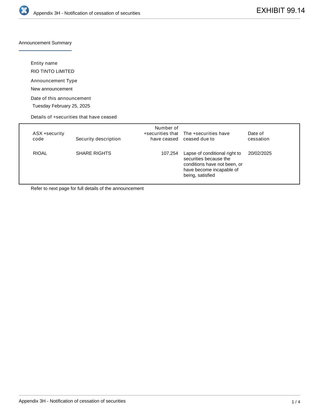 Notice to ASX 26 / 81 26 Contacts Please direct all enquiries to media.enquiries@riotinto.com Media Relations, United Kingdom David Outhwaite M +44 7787 597 493 Media Relations, Australia Matt Chambers M +61 433 525 739 Michelle Lee M +61 458 609 322 Rachel Pupazzoni M +61 438 875 469 Media Relations, Canada Simon Letendre M +1 514 796 4973 Malika Cherry M +1 418 592 7293 Vanessa Damha M +1 514 715 2152 Media Relations, US Jesse Riseborough M +1 202 394 9480 Investor Relations, United Kingdom Rachel Arellano M +44 7584 609 644 David Ovington M +44 7920 010 978 Laura Brooks M +44 7826 942 797 Wei Wei Hu M +44 7825 907 230 Investor Relations, Australia Tom Gallop M +61 439 353 948 Amar Jambaa M +61 472 865 948 Rio Tinto plc 6 St James’s Square London SW1Y 4AD United Kingdom T +44 20 7781 2000 Registered in England No. 719885 Rio Tinto Limited Level 43, 120 Collins Street Melbourne 3000 Australia T +61 3 9283 3333 Registered in Australia ABN 96 004 458 404 This announcement is authorised for release to the market by Andy Hodges, Rio Tinto’s Group Company Secretary. riotinto.com