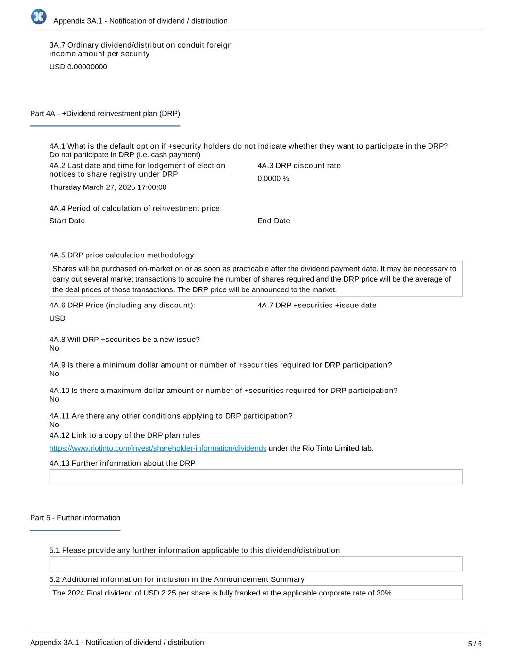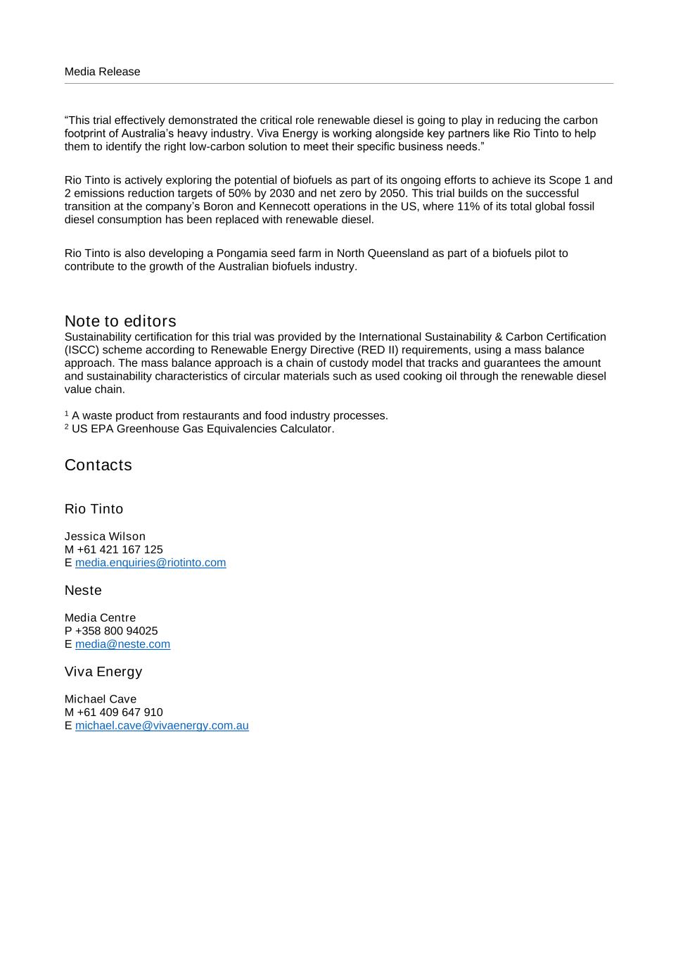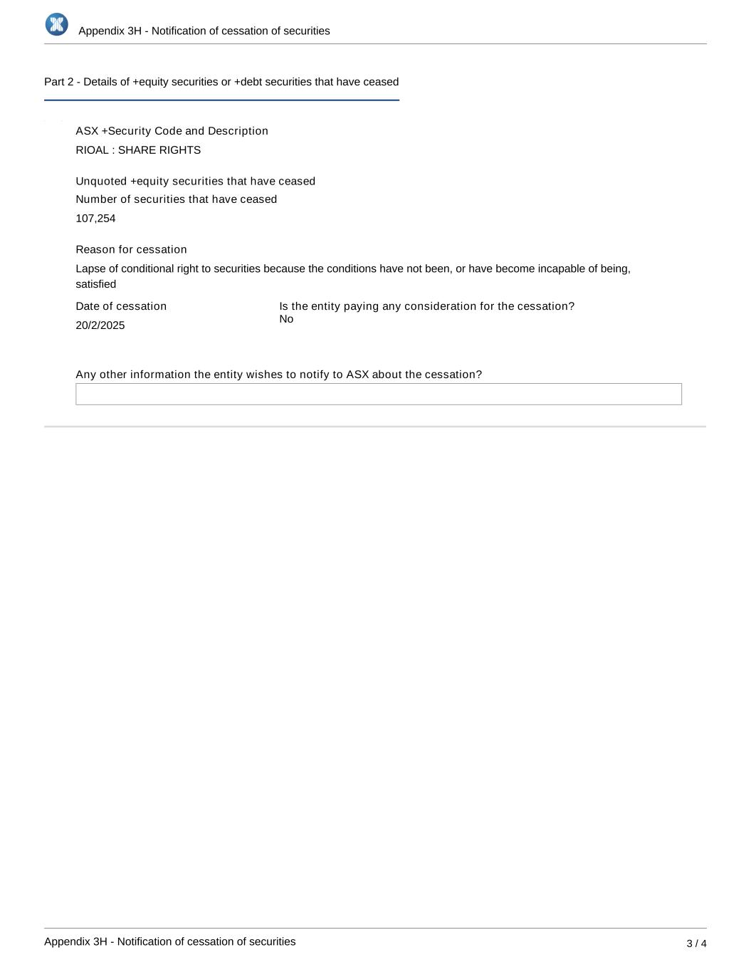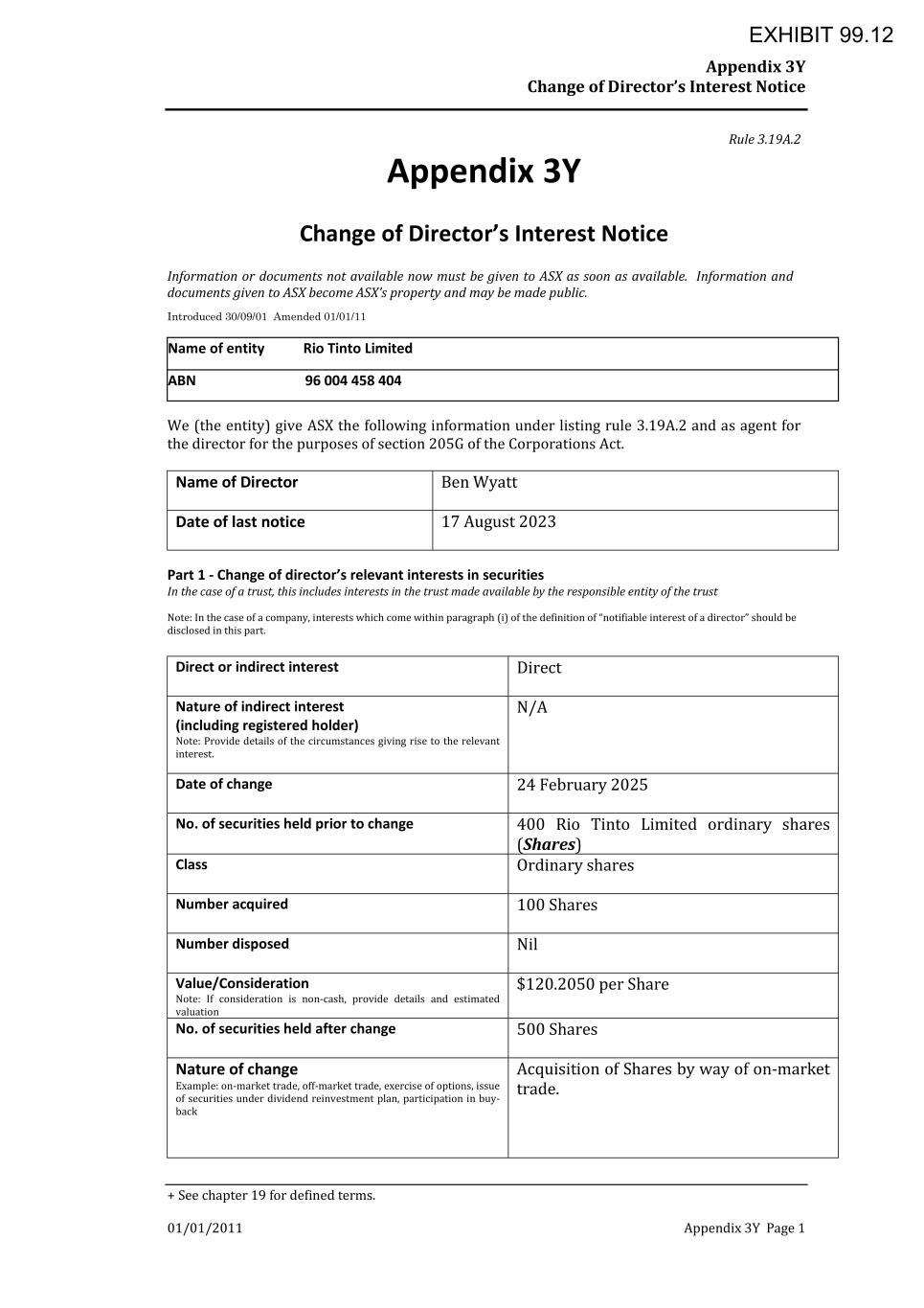 Notice to ASX 26 / 81 26 Contacts Please direct all enquiries to media.enquiries@riotinto.com Media Relations, United Kingdom David Outhwaite M +44 7787 597 493 Media Relations, Australia Matt Chambers M +61 433 525 739 Michelle Lee M +61 458 609 322 Rachel Pupazzoni M +61 438 875 469 Media Relations, Canada Simon Letendre M +1 514 796 4973 Malika Cherry M +1 418 592 7293 Vanessa Damha M +1 514 715 2152 Media Relations, US Jesse Riseborough M +1 202 394 9480 Investor Relations, United Kingdom Rachel Arellano M +44 7584 609 644 David Ovington M +44 7920 010 978 Laura Brooks M +44 7826 942 797 Wei Wei Hu M +44 7825 907 230 Investor Relations, Australia Tom Gallop M +61 439 353 948 Amar Jambaa M +61 472 865 948 Rio Tinto plc 6 St James’s Square London SW1Y 4AD United Kingdom T +44 20 7781 2000 Registered in England No. 719885 Rio Tinto Limited Level 43, 120 Collins Street Melbourne 3000 Australia T +61 3 9283 3333 Registered in Australia ABN 96 004 458 404 This announcement is authorised for release to the market by Andy Hodges, Rio Tinto’s Group Company Secretary. riotinto.com