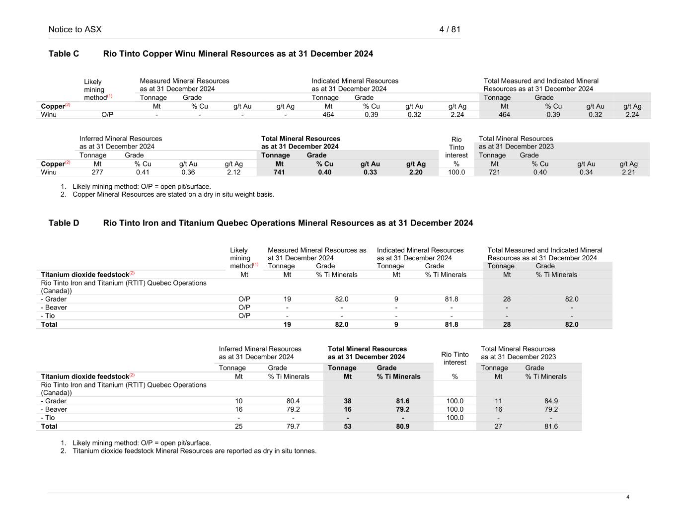 Notice to ASX 4 / 81 4 Table C Rio Tinto Copper Winu Mineral Resources as at 31 December 2024 Likely mining method(1) Measured Mineral Resources Indicated Mineral Resources Total Measured and Indicated Mineral as at 31 December 2024 as at 31 December 2024 Resources as at 31 December 2024 Tonnage Grade Tonnage Grade Tonnage Grade Copper(2) Mt % Cu g/t Au g/t Ag Mt % Cu g/t Au g/t Ag Mt % Cu g/t Au g/t Ag Winu O/P - - - - 464 0.39 0.32 2.24 464 0.39 0.32 2.24 Inferred Mineral Resources Total Mineral Resources Rio Tinto interest Total Mineral Resources as at 31 December 2024 as at 31 December 2024 as at 31 December 2023 Tonnage Grade Tonnage Grade Tonnage Grade Copper(2) Mt % Cu g/t Au g/t Ag Mt % Cu g/t Au g/t Ag % Mt % Cu g/t Au g/t Ag Winu 277 0.41 0.36 2.12 741 0.40 0.33 2.20 100.0 721 0.40 0.34 2.21 1. Likely mining method: O/P = open pit/surface. 2. Copper Mineral Resources are stated on a dry in situ weight basis. Table D Rio Tinto Iron and Titanium Quebec Operations Mineral Resources as at 31 December 2024 Likely mining method(1) Measured Mineral Resources as at 31 December 2024 Indicated Mineral Resources as at 31 December 2024 Total Measured and Indicated Mineral Resources as at 31 December 2024 Tonnage Grade Tonnage Grade Tonnage Grade Titanium dioxide feedstock(2) Mt Mt % Ti Minerals Mt % Ti Minerals Mt % Ti Minerals Rio Tinto Iron and Titanium (RTIT) Quebec Operations (Canada)) - Grader O/P 19 82.0 9 81.8 28 82.0 - Beaver O/P - - - - - - - Tio O/P - - - - - - Total 19 82.0 9 81.8 28 82.0 Inferred Mineral Resources as at 31 December 2024 Total Mineral Resources as at 31 December 2024 Rio Tinto interest Total Mineral Resources as at 31 December 2023 Tonnage Grade Tonnage Grade Tonnage Grade Titanium dioxide feedstock(2) Mt % Ti Minerals Mt % Ti Minerals % Mt % Ti Minerals Rio Tinto Iron and Titanium (RTIT) Quebec Operations (Canada)) - Grader 10 80.4 38 81.6 100.0 11 84.9 - Beaver 16 79.2 16 79.2 100.0 16 79.2 - Tio - - - - 100.0 - - Total 25 79.7 53 80.9 27 81.6 1. Likely mining method: O/P = open pit/surface. 2. Titanium dioxide feedstock Mineral Resources are reported as dry in situ tonnes.