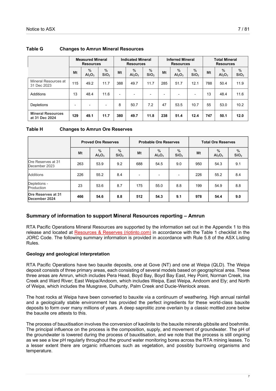 Notice to ASX 7 / 81 7 Table G Changes to Amrun Mineral Resources Measured Mineral Resources Indicated Mineral Resources Inferred Mineral Resources Total Mineral Resources Mt % Al2O3 % SiO2 Mt % Al2O3 % SiO2 Mt % Al2O3 % SiO2 Mt % Al2O3 % SiO2 Mineral Resources at 31 Dec 2023 115 49.2 11.7 388 49.7 11.7 285 51.7 12.1 788 50.4 11.9 Additions 13 48.4 11.6 - - - - - - 13 48.4 11.6 Depletions - - - 8 50.7 7.2 47 53.5 10.7 55 53.0 10.2 Mineral Resources at 31 Dec 2024 129 49.1 11.7 380 49.7 11.8 238 51.4 12.4 747 50.1 12.0 Table H Changes to Amrun Ore Reserves Proved Ore Reserves Probable Ore Reserves Total Ore Reserves Mt % Al2O3 % SiO2 Mt % Al2O3 % SiO2 Mt % Al2O3 % SiO2 Ore Reserves at 31 December 2023 263 53.9 9.2 688 54.5 9.0 950 54.3 9.1 Additions 226 55.2 8.4 - - - 226 55.2 8.4 Depletions - Production 23 53.6 8.7 175 55.0 8.8 199 54.9 8.8 Ore Reserves at 31 December 2024 466 54.6 8.8 512 54.3 9.1 978 54.4 9.0 Summary of information to support Mineral Resources reporting – Amrun RTA Pacific Operations Mineral Resources are supported by the information set out in the Appendix 1 to this release and located at Resources & Reserves (riotinto.com) in accordance with the Table 1 checklist in the JORC Code. The following summary information is provided in accordance with Rule 5.8 of the ASX Listing Rules. Geology and geological interpretation RTA Pacific Operations have two bauxite deposits, one at Gove (NT) and one at Weipa (QLD). The Weipa deposit consists of three primary areas, each consisting of several models based on geographical area. These three areas are Amrun, which includes Pera Head, Boyd Bay, Boyd Bay East, Hey Point, Norman Creek, Ina Creek and Ward River; East Weipa/Andoom, which includes Weipa, East Weipa, Andoom and Ely; and North of Weipa, which includes the Musgrave, Dulhunty, Palm Creek and Ducie-Wenlock areas. The host rocks at Weipa have been converted to bauxite via a continuum of weathering. High annual rainfall and a geologically stable environment has provided the perfect ingredients for these world-class bauxite deposits to form over many millions of years. A deep saprolitic zone overlain by a classic mottled zone below the bauxite ore attests to this. The process of bauxitisation involves the conversion of kaolinite to the bauxite minerals gibbsite and boehmite. The principal influence on the process is the composition, supply, and movement of groundwater. The pH of the groundwater is lowered during the process of bauxitisation, and we note that the process is still ongoing as we see a low pH regularly throughout the ground water monitoring bores across the RTA mining leases. To a lesser extent there are organic influences such as vegetation, and possibly burrowing organisms and temperature.