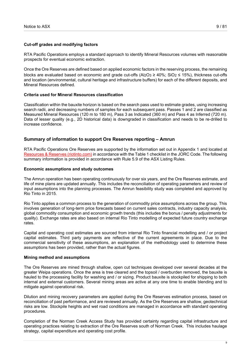 Notice to ASX 9 / 81 9 Cut-off grades and modifying factors RTA Pacific Operations employs a standard approach to identify Mineral Resources volumes with reasonable prospects for eventual economic extraction. Once the Ore Reserves are defined based on applied economic factors in the reserving process, the remaining blocks are evaluated based on economic and grade cut-offs (Al2O3 ≥ 40%; SiO2 ≤ 15%), thickness cut-offs and location (environmental, cultural heritage and infrastructure buffers) for each of the different deposits, and Mineral Resources defined. Criteria used for Mineral Resources classification Classification within the bauxite horizon is based on the search pass used to estimate grades, using increasing search radii, and decreasing numbers of samples for each subsequent pass. Passes 1 and 2 are classified as Measured Mineral Resources (120 m to 180 m), Pass 3 as Indicated (360 m) and Pass 4 as Inferred (720 m). Data of lesser quality (e.g., 2D historical data) is downgraded in classification and needs to be re-drilled to increase confidence. Summary of information to support Ore Reserves reporting – Amrun RTA Pacific Operations Ore Reserves are supported by the information set out in Appendix 1 and located at Resources & Reserves (riotinto.com) in accordance with the Table 1 checklist in the JORC Code. The following summary information is provided in accordance with Rule 5.9 of the ASX Listing Rules. Economic assumptions and study outcomes The Amrun operation has been operating continuously for over six years, and the Ore Reserves estimate, and life of mine plans are updated annually. This includes the reconciliation of operating parameters and review of input assumptions into the planning processes. The Amrun feasibility study was completed and approved by Rio Tinto in 2015. Rio Tinto applies a common process to the generation of commodity price assumptions across the group. This involves generation of long-term price forecasts based on current sales contracts, industry capacity analysis, global commodity consumption and economic growth trends (this includes the bonus / penalty adjustments for quality). Exchange rates are also based on internal Rio Tinto modelling of expected future country exchange rates. Capital and operating cost estimates are sourced from internal Rio Tinto financial modelling and / or project capital estimates. Third party payments are reflective of the current agreements in place. Due to the commercial sensitivity of these assumptions, an explanation of the methodology used to determine these assumptions has been provided, rather than the actual figures. Mining method and assumptions The Ore Reserves are mined through shallow, open cut techniques developed over several decades at the greater Weipa operations. Once the area is tree cleared and the topsoil / overburden removed, the bauxite is hauled to the processing facility for washing and / or sizing. Product bauxite is stockpiled for shipping to both internal and external customers. Several mining areas are active at any one time to enable blending and to mitigate against operational risk. Dilution and mining recovery parameters are applied during the Ore Reserves estimation process, based on reconciliation of past performance, and are reviewed annually. As the Ore Reserves are shallow, geotechnical risks are low. Stockpile heights and wet road conditions are managed in accordance with standard operating procedures. Completion of the Norman Creek Access Study has provided certainty regarding capital infrastructure and operating practices relating to extraction of the Ore Reserves south of Norman Creek. This includes haulage strategy, capital expenditure and operating cost profile.