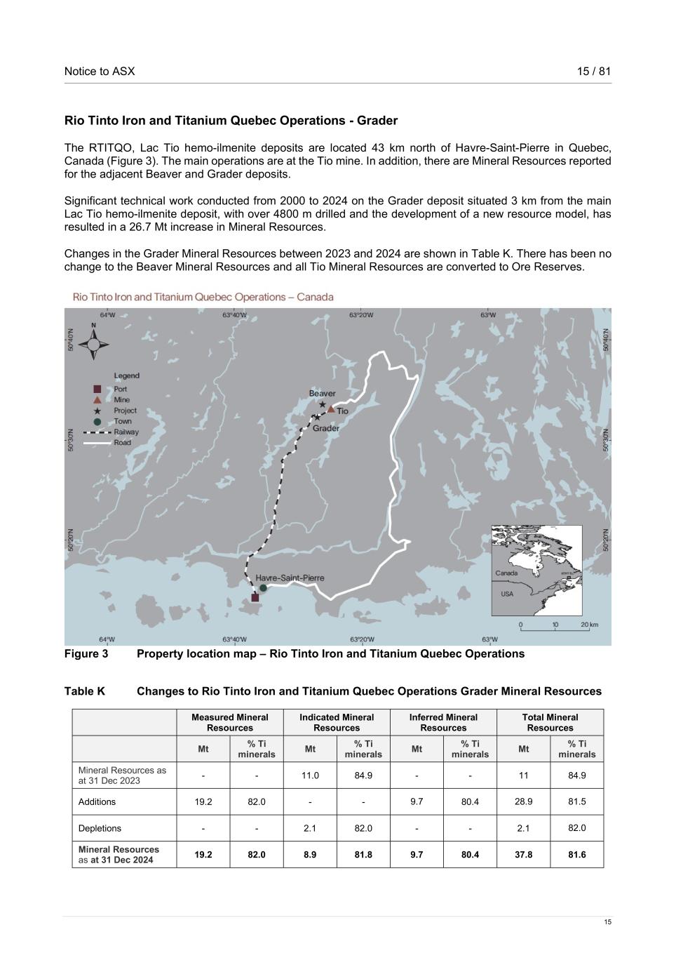 Notice to ASX 15 / 81 15 Rio Tinto Iron and Titanium Quebec Operations - Grader The RTITQO, Lac Tio hemo-ilmenite deposits are located 43 km north of Havre-Saint-Pierre in Quebec, Canada (Figure 3). The main operations are at the Tio mine. In addition, there are Mineral Resources reported for the adjacent Beaver and Grader deposits. Significant technical work conducted from 2000 to 2024 on the Grader deposit situated 3 km from the main Lac Tio hemo-ilmenite deposit, with over 4800 m drilled and the development of a new resource model, has resulted in a 26.7 Mt increase in Mineral Resources. Changes in the Grader Mineral Resources between 2023 and 2024 are shown in Table K. There has been no change to the Beaver Mineral Resources and all Tio Mineral Resources are converted to Ore Reserves. Figure 3 Property location map – Rio Tinto Iron and Titanium Quebec Operations Table K Changes to Rio Tinto Iron and Titanium Quebec Operations Grader Mineral Resources Measured Mineral Resources Indicated Mineral Resources Inferred Mineral Resources Total Mineral Resources Mt % Ti minerals Mt % Ti minerals Mt % Ti minerals Mt % Ti minerals Mineral Resources as at 31 Dec 2023 - - 11.0 84.9 - - 11 84.9 Additions 19.2 82.0 - - 9.7 80.4 28.9 81.5 Depletions - - 2.1 82.0 - - 2.1 82.0 Mineral Resources as at 31 Dec 2024 19.2 82.0 8.9 81.8 9.7 80.4 37.8 81.6