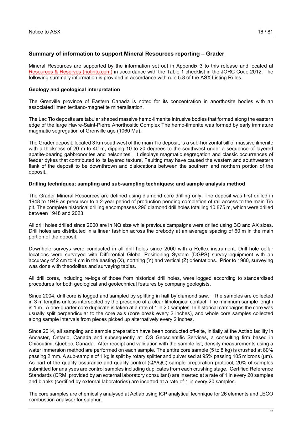 Notice to ASX 16 / 81 16 Summary of information to support Mineral Resources reporting – Grader Mineral Resources are supported by the information set out in Appendix 3 to this release and located at Resources & Reserves (riotinto.com) in accordance with the Table 1 checklist in the JORC Code 2012. The following summary information is provided in accordance with rule 5.8 of the ASX Listing Rules. Geology and geological interpretation The Grenville province of Eastern Canada is noted for its concentration in anorthosite bodies with an associated ilmenite/titano-magnetite mineralisation. The Lac Tio deposits are tabular shaped massive hemo-ilmenite intrusive bodies that formed along the eastern edge of the large Havre-Saint-Pierre Anorthositic Complex The hemo-ilmenite was formed by early immature magmatic segregation of Grenville age (1060 Ma). The Grader deposit, located 3 km southwest of the main Tio deposit, is a sub-horizontal sill of massive ilmenite with a thickness of 20 m to 40 m, dipping 10 to 20 degrees to the southwest under a sequence of layered apatite-bearing gabbronorites and nelsonites. It displays magmatic segregation and classic occurrences of feeder dykes that contributed to its layered texture. Faulting may have caused the western and southwestern flank of the deposit to be downthrown and dislocations between the southern and northern portion of the deposit. Drilling techniques; sampling and sub-sampling techniques; and sample analysis method The Grader Mineral Resources are defined using diamond core drilling only. The deposit was first drilled in 1948 to 1949 as precursor to a 2-year period of production pending completion of rail access to the main Tio pit. The complete historical drilling encompasses 296 diamond drill holes totalling 10,875 m, which were drilled between 1948 and 2023. All drill holes drilled since 2000 are in NQ size while previous campaigns were drilled using BQ and AX sizes. Drill holes are distributed in a linear fashion across the orebody at an average spacing of 60 m in the main portion of the deposit. Downhole surveys were conducted in all drill holes since 2000 with a Reflex instrument. Drill hole collar locations were surveyed with Differential Global Positioning System (DGPS) survey equipment with an accuracy of 2 cm to 4 cm in the easting (X), northing (Y) and vertical (Z) orientations. Prior to 1980, surveying was done with theodolites and surveying tables. All drill cores, including re-logs of those from historical drill holes, were logged according to standardised procedures for both geological and geotechnical features by company geologists. Since 2004, drill core is logged and sampled by splitting in half by diamond saw. The samples are collected in 3 m lengths unless intersected by the presence of a clear lithological contact. The minimum sample length is 1 m. A one-quarter core duplicate is taken at a rate of 1 in 20 samples. In historical campaigns the core was usually split perpendicular to the core axis (core break every 2 inches), and whole core samples collected along sample intervals from pieces picked up alternatively every 2 inches. Since 2014, all sampling and sample preparation have been conducted off-site, initially at the Actlab facility in Ancaster, Ontario, Canada and subsequently at IOS Geoscientific Services, a consulting firm based in Chicoutimi, Quebec, Canada. After receipt and validation with the sample list, density measurements using a water immersion method are performed on each sample. The entire core sample (5 to 8 kg) is crushed at 80% passing 2 mm. A sub-sample of 1 kg is split by rotary splitter and pulverised at 95% passing 105 microns (µm). As part of the quality assurance and quality control (QA/QC) sample preparation protocol, 20% of samples submitted for analyses are control samples including duplicates from each crushing stage. Certified Reference Standards (CRM; provided by an external laboratory consultant) are inserted at a rate of 1 in every 20 samples and blanks (certified by external laboratories) are inserted at a rate of 1 in every 20 samples. The core samples are chemically analysed at Actlab using ICP analytical technique for 26 elements and LECO combustion analyser for sulphur.