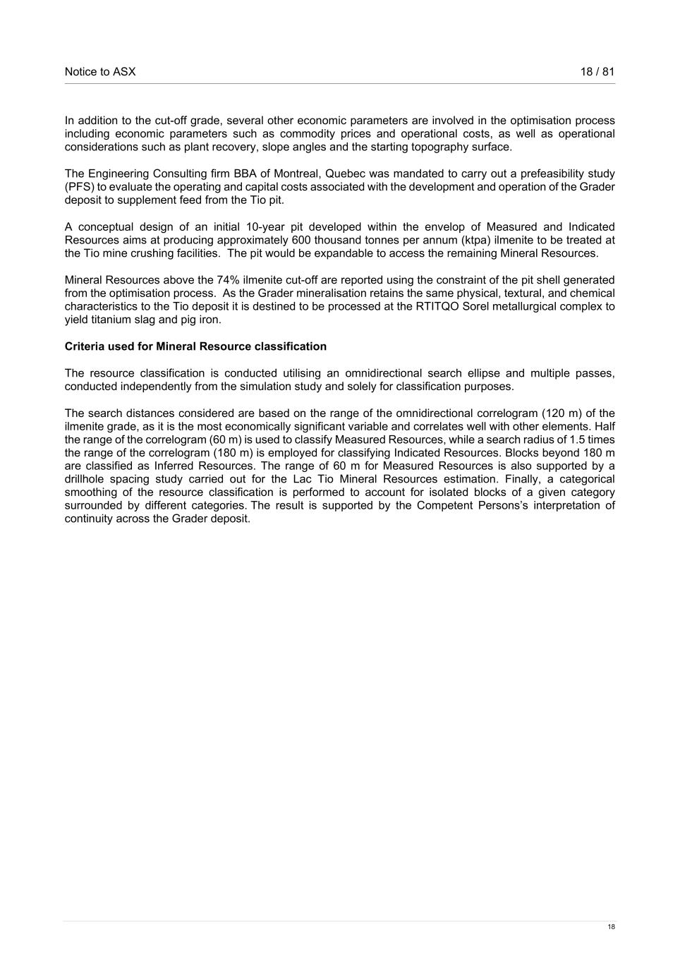 Notice to ASX 18 / 81 18 In addition to the cut-off grade, several other economic parameters are involved in the optimisation process including economic parameters such as commodity prices and operational costs, as well as operational considerations such as plant recovery, slope angles and the starting topography surface. The Engineering Consulting firm BBA of Montreal, Quebec was mandated to carry out a prefeasibility study (PFS) to evaluate the operating and capital costs associated with the development and operation of the Grader deposit to supplement feed from the Tio pit. A conceptual design of an initial 10-year pit developed within the envelop of Measured and Indicated Resources aims at producing approximately 600 thousand tonnes per annum (ktpa) ilmenite to be treated at the Tio mine crushing facilities. The pit would be expandable to access the remaining Mineral Resources. Mineral Resources above the 74% ilmenite cut-off are reported using the constraint of the pit shell generated from the optimisation process. As the Grader mineralisation retains the same physical, textural, and chemical characteristics to the Tio deposit it is destined to be processed at the RTITQO Sorel metallurgical complex to yield titanium slag and pig iron. Criteria used for Mineral Resource classification The resource classification is conducted utilising an omnidirectional search ellipse and multiple passes, conducted independently from the simulation study and solely for classification purposes. The search distances considered are based on the range of the omnidirectional correlogram (120 m) of the ilmenite grade, as it is the most economically significant variable and correlates well with other elements. Half the range of the correlogram (60 m) is used to classify Measured Resources, while a search radius of 1.5 times the range of the correlogram (180 m) is employed for classifying Indicated Resources. Blocks beyond 180 m are classified as Inferred Resources. The range of 60 m for Measured Resources is also supported by a drillhole spacing study carried out for the Lac Tio Mineral Resources estimation. Finally, a categorical smoothing of the resource classification is performed to account for isolated blocks of a given category surrounded by different categories. The result is supported by the Competent Persons’s interpretation of continuity across the Grader deposit.