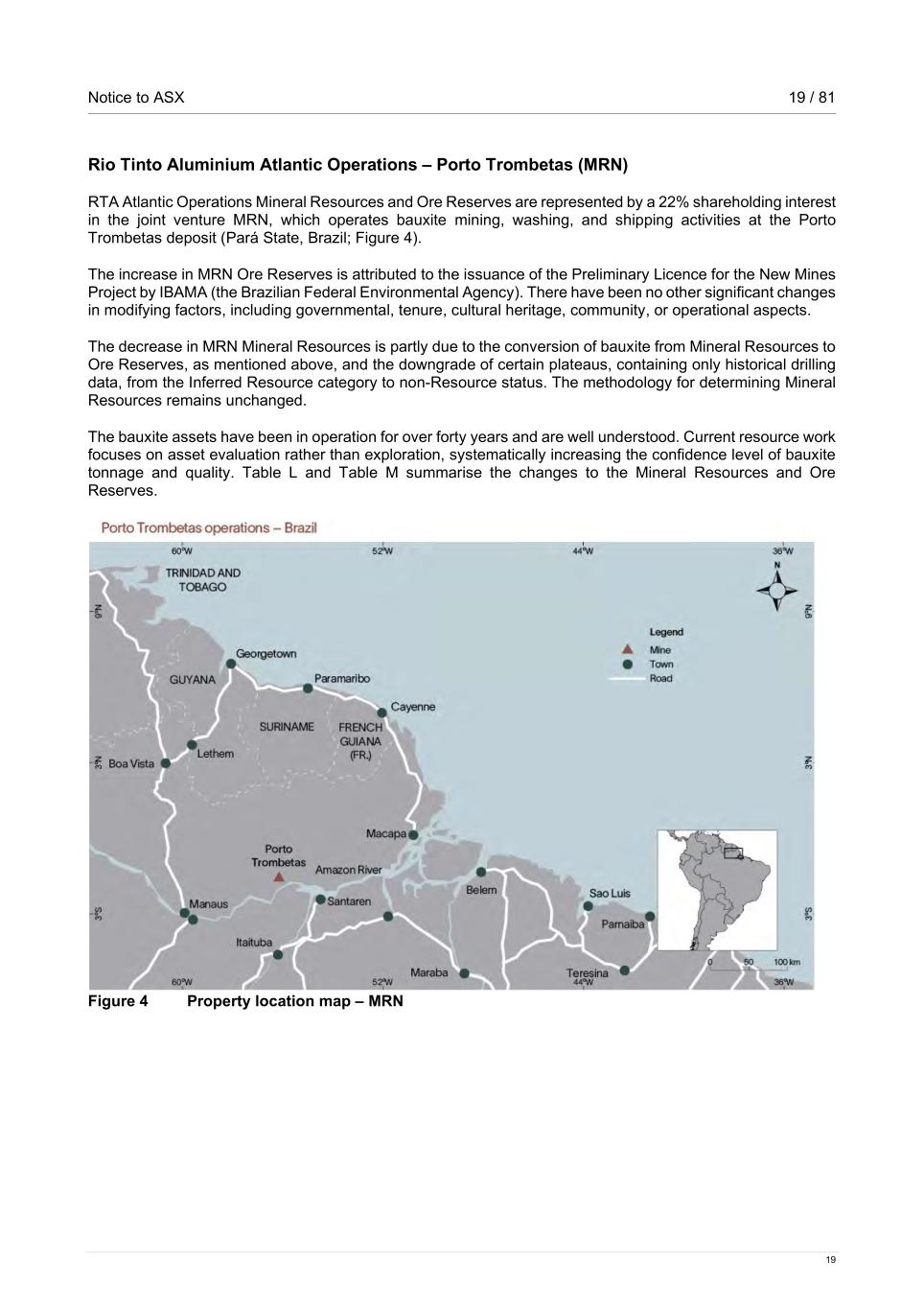 Notice to ASX 19 / 81 19 Rio Tinto Aluminium Atlantic Operations – Porto Trombetas (MRN) RTA Atlantic Operations Mineral Resources and Ore Reserves are represented by a 22% shareholding interest in the joint venture MRN, which operates bauxite mining, washing, and shipping activities at the Porto Trombetas deposit (Pará State, Brazil; Figure 4). The increase in MRN Ore Reserves is attributed to the issuance of the Preliminary Licence for the New Mines Project by IBAMA (the Brazilian Federal Environmental Agency). There have been no other significant changes in modifying factors, including governmental, tenure, cultural heritage, community, or operational aspects. The decrease in MRN Mineral Resources is partly due to the conversion of bauxite from Mineral Resources to Ore Reserves, as mentioned above, and the downgrade of certain plateaus, containing only historical drilling data, from the Inferred Resource category to non-Resource status. The methodology for determining Mineral Resources remains unchanged. The bauxite assets have been in operation for over forty years and are well understood. Current resource work focuses on asset evaluation rather than exploration, systematically increasing the confidence level of bauxite tonnage and quality. Table L and Table M summarise the changes to the Mineral Resources and Ore Reserves. Figure 4 Property location map – MRN