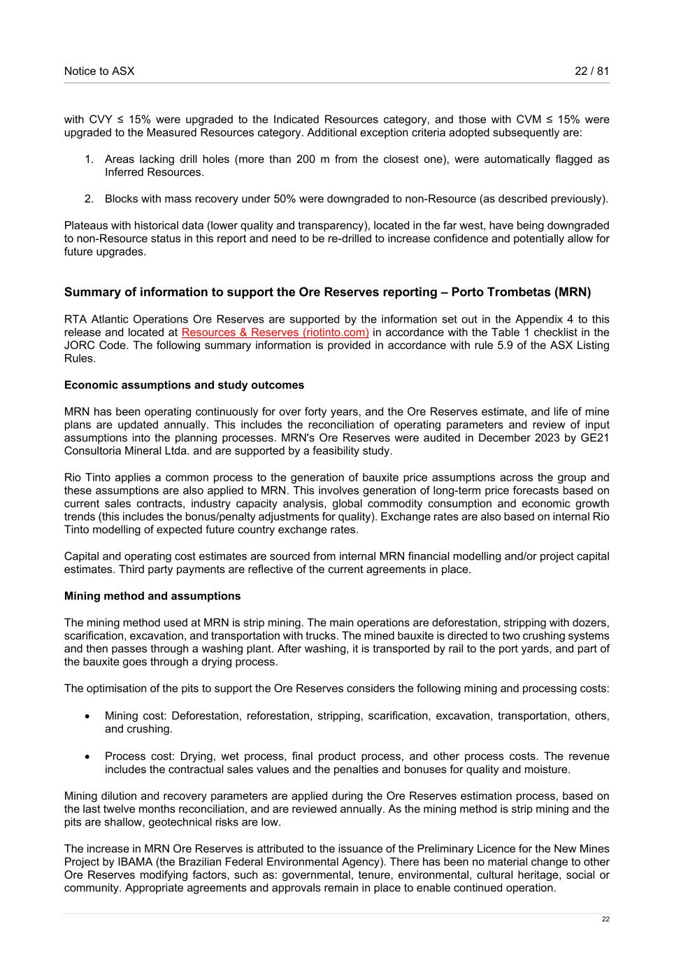 Notice to ASX 22 / 81 22 with CVY ≤ 15% were upgraded to the Indicated Resources category, and those with CVM ≤ 15% were upgraded to the Measured Resources category. Additional exception criteria adopted subsequently are: 1. Areas lacking drill holes (more than 200 m from the closest one), were automatically flagged as Inferred Resources. 2. Blocks with mass recovery under 50% were downgraded to non-Resource (as described previously). Plateaus with historical data (lower quality and transparency), located in the far west, have being downgraded to non-Resource status in this report and need to be re-drilled to increase confidence and potentially allow for future upgrades. Summary of information to support the Ore Reserves reporting – Porto Trombetas (MRN) RTA Atlantic Operations Ore Reserves are supported by the information set out in the Appendix 4 to this release and located at Resources & Reserves (riotinto.com) in accordance with the Table 1 checklist in the JORC Code. The following summary information is provided in accordance with rule 5.9 of the ASX Listing Rules. Economic assumptions and study outcomes MRN has been operating continuously for over forty years, and the Ore Reserves estimate, and life of mine plans are updated annually. This includes the reconciliation of operating parameters and review of input assumptions into the planning processes. MRN's Ore Reserves were audited in December 2023 by GE21 Consultoria Mineral Ltda. and are supported by a feasibility study. Rio Tinto applies a common process to the generation of bauxite price assumptions across the group and these assumptions are also applied to MRN. This involves generation of long-term price forecasts based on current sales contracts, industry capacity analysis, global commodity consumption and economic growth trends (this includes the bonus/penalty adjustments for quality). Exchange rates are also based on internal Rio Tinto modelling of expected future country exchange rates. Capital and operating cost estimates are sourced from internal MRN financial modelling and/or project capital estimates. Third party payments are reflective of the current agreements in place. Mining method and assumptions The mining method used at MRN is strip mining. The main operations are deforestation, stripping with dozers, scarification, excavation, and transportation with trucks. The mined bauxite is directed to two crushing systems and then passes through a washing plant. After washing, it is transported by rail to the port yards, and part of the bauxite goes through a drying process. The optimisation of the pits to support the Ore Reserves considers the following mining and processing costs: • Mining cost: Deforestation, reforestation, stripping, scarification, excavation, transportation, others, and crushing. • Process cost: Drying, wet process, final product process, and other process costs. The revenue includes the contractual sales values and the penalties and bonuses for quality and moisture. Mining dilution and recovery parameters are applied during the Ore Reserves estimation process, based on the last twelve months reconciliation, and are reviewed annually. As the mining method is strip mining and the pits are shallow, geotechnical risks are low. The increase in MRN Ore Reserves is attributed to the issuance of the Preliminary Licence for the New Mines Project by IBAMA (the Brazilian Federal Environmental Agency). There has been no material change to other Ore Reserves modifying factors, such as: governmental, tenure, environmental, cultural heritage, social or community. Appropriate agreements and approvals remain in place to enable continued operation.