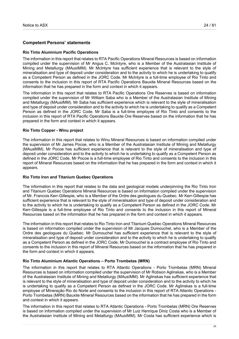 Notice to ASX 24 / 81 24 Competent Persons’ statements Rio Tinto Aluminium Pacific Operations The information in this report that relates to RTA Pacific Operations Mineral Resources is based on information compiled under the supervision of Mr Angus C. McIntyre, who is a Member of the Australasian Institute of Mining and Metallurgy (MAusIMM). Mr McIntyre has sufficient experience that is relevant to the style of mineralisation and type of deposit under consideration and to the activity to which he is undertaking to qualify as a Competent Person as defined in the JORC Code. Mr McIntyre is a full-time employee of Rio Tinto and consents to the inclusion in this report of RTA Pacific Operations Bauxite Mineral Resources based on the information that he has prepared in the form and context in which it appears. The information in this report that relates to RTA Pacific Operations Ore Reserves is based on information compiled under the supervision of Mr William Saba who is a Member of the Australasian Institute of Mining and Metallurgy (MAusIMM). Mr Saba has sufficient experience which is relevant to the style of mineralisation and type of deposit under consideration and to the activity to which he is undertaking to qualify as a Competent Person as defined in the JORC Code. Mr Saba is a full-time employee of Rio Tinto and consents to the inclusion in this report of RTA Pacific Operations Bauxite Ore Reserves based on the information that he has prepared in the form and context in which it appears. Rio Tinto Copper - Winu project The information in this report that relates to Winu Mineral Resources is based on information compiled under the supervision of Mr James Pocoe, who is a Member of the Australasian Institute of Mining and Metallurgy (MAuslMM). Mr Pocoe has sufficient experience that is relevant to the style of mineralisation and type of deposit under consideration and to the activity to which he is undertaking to qualify as a Competent Person as defined in the JORC Code. Mr Pocoe is a full-time employee of Rio Tinto and consents to the inclusion in this report of Mineral Resources based on the information that he has prepared in the form and context in which it appears. Rio Tinto Iron and Titanium Quebec Operations The information in this report that relates to the data and geological models underpinning the Rio Tinto Iron and Titanium Quebec Operations Mineral Resources is based on information compiled under the supervision of Mr. Francois Kerr-Gillespie, who is a Member of the Ordre des geologues du Quebec. Mr Kerr-Gillespie has sufficient experience that is relevant to the style of mineralisation and type of deposit under consideration and to the activity to which he is undertaking to qualify as a Competent Person as defined in the JORC Code. Mr Kerr-Gillespie is a full-time employee of Rio Tinto and consents to the inclusion in this report of Mineral Resources based on the information that he has prepared in the form and context in which it appears. The information in this report that relates to Rio Tinto Iron and Titanium Quebec Operations Mineral Resources is based on information compiled under the supervision of Mr Jacques Dumouchel, who is a Member of the Ordre des geologues du Quebec. Mr Dumouchel has sufficient experience that is relevant to the style of mineralisation and type of deposit under consideration and to the activity to which he is undertaking to qualify as a Competent Person as defined in the JORC Code. Mr Dumouchel is a contract employee of Rio Tinto and consents to the inclusion in this report of Mineral Resources based on the information that he has prepared in the form and context in which it appears. Rio Tinto Aluminium Atlantic Operations – Porto Trombetas (MRN) The information in this report that relates to RTA Atlantic Operations - Porto Trombetas (MRN) Mineral Resources is based on information compiled under the supervision of Mr Robson Aglinskas, who is a Member of the Australasian Institute of Mining and Metallurgy (MAusIMM). Mr Aglinskas has sufficient experience that is relevant to the style of mineralisation and type of deposit under consideration and to the activity to which he is undertaking to qualify as a Competent Person as defined in the JORC Code. Mr Aglinskas is a full-time employee of Mineração Rio do Norte and consents to the inclusion in this report of RTA Atlantic Operations - Porto Trombetas (MRN) Bauxite Mineral Resources based on the information that he has prepared in the form and context in which it appears. The information in this report that relates to RTA Atlantic Operations - Porto Trombetas (MRN) Ore Reserves is based on information compiled under the supervision of Mr Luiz Henrique Diniz Costa who is a Member of the Australasian Institute of Mining and Metallurgy (MAusIMM). Mr Costa has sufficient experience which is