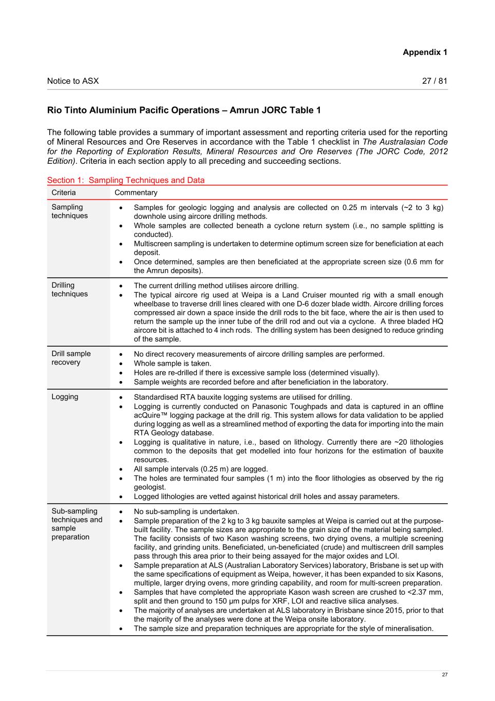 Appendix 1 Notice to ASX 33 / 81 33 Figure 8 Type section for Amrun deposits Balanced reporting • Not applicable as no Exploration Results are being reported. Weipa is a mature mining operation with more than 50 years of operational and orebody knowledge. The Amrun Mine started operations in 2018. Other substantive exploration data • Not applicable. Weipa is a mature mining operation with more than 50 years of operational and orebody knowledge. Further work • Drilling will continue in the future to further support the five-year and life of mine plans, as well as options for future growth. Section 3: Estimation and Reporting of Mineral Resources Criteria Commentary Database integrity • Data capture is on Panasonic Toughpad digital loggers that have internal validation rules that identify logging errors. • The geological drill hole database (RTA Geology) is managed by the Bauxite Geology Team within RTA. Drilling data is securely stored in a Microsoft SQL Server using an acQuire™ front end. acQuire™ is a third-party software product that provides a user-friendly interface to SQL Server and consists of two components: o a Relational Data Model (structured storage tables and links) optimised for the storing of exploration and mining data information; and o a Software System (objects for data collect/importing/exporting, validation, viewing, modification, etc.) to manage the data and provide end user functionality for the optimum use of exploration and mining data. • The database is located on a virtual server hosted in Rio Tinto’s Azure cloud servers in Sydney. They are backed up daily in accordance with Rio Tinto’s standard back up procedure. • The drill hole database used for Mineral Resources estimation has been internally validated. Methods include checking: o acQuire™ scripts for relational integrity, duplicates, total assay, and missing / blank assay values. o Domain names. o Null and negative grade values. o Missing or overlapping intervals. o Duplicate data. • Drill hole data was also validated visually by domain and compared to the geological model. Site visits • The Competent Person for the Weipa Mineral Resources, which include Amrun, visits the site on a regular basis and is involved in all aspects relating to the orebody knowledge.