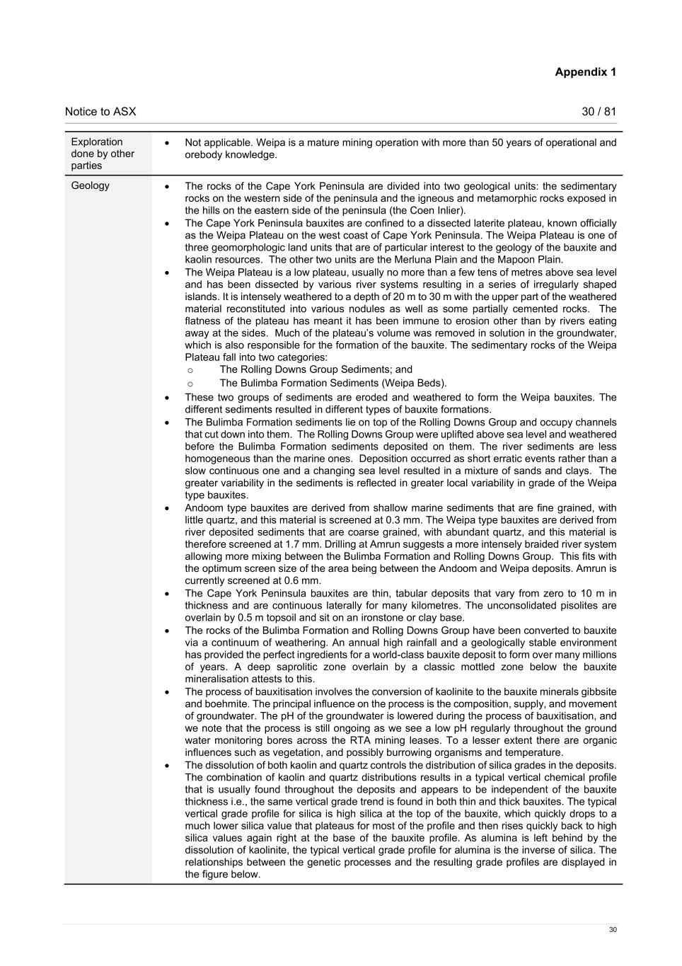 Appendix 1 Notice to ASX 30 / 81 30 Exploration done by other parties • Not applicable. Weipa is a mature mining operation with more than 50 years of operational and orebody knowledge. Geology • The rocks of the Cape York Peninsula are divided into two geological units: the sedimentary rocks on the western side of the peninsula and the igneous and metamorphic rocks exposed in the hills on the eastern side of the peninsula (the Coen Inlier). • The Cape York Peninsula bauxites are confined to a dissected laterite plateau, known officially as the Weipa Plateau on the west coast of Cape York Peninsula. The Weipa Plateau is one of three geomorphologic land units that are of particular interest to the geology of the bauxite and kaolin resources. The other two units are the Merluna Plain and the Mapoon Plain. • The Weipa Plateau is a low plateau, usually no more than a few tens of metres above sea level and has been dissected by various river systems resulting in a series of irregularly shaped islands. It is intensely weathered to a depth of 20 m to 30 m with the upper part of the weathered material reconstituted into various nodules as well as some partially cemented rocks. The flatness of the plateau has meant it has been immune to erosion other than by rivers eating away at the sides. Much of the plateau’s volume was removed in solution in the groundwater, which is also responsible for the formation of the bauxite. The sedimentary rocks of the Weipa Plateau fall into two categories: o The Rolling Downs Group Sediments; and o The Bulimba Formation Sediments (Weipa Beds). • These two groups of sediments are eroded and weathered to form the Weipa bauxites. The different sediments resulted in different types of bauxite formations. • The Bulimba Formation sediments lie on top of the Rolling Downs Group and occupy channels that cut down into them. The Rolling Downs Group were uplifted above sea level and weathered before the Bulimba Formation sediments deposited on them. The river sediments are less homogeneous than the marine ones. Deposition occurred as short erratic events rather than a slow continuous one and a changing sea level resulted in a mixture of sands and clays. The greater variability in the sediments is reflected in greater local variability in grade of the Weipa type bauxites. • Andoom type bauxites are derived from shallow marine sediments that are fine grained, with little quartz, and this material is screened at 0.3 mm. The Weipa type bauxites are derived from river deposited sediments that are coarse grained, with abundant quartz, and this material is therefore screened at 1.7 mm. Drilling at Amrun suggests a more intensely braided river system allowing more mixing between the Bulimba Formation and Rolling Downs Group. This fits with the optimum screen size of the area being between the Andoom and Weipa deposits. Amrun is currently screened at 0.6 mm. • The Cape York Peninsula bauxites are thin, tabular deposits that vary from zero to 10 m in thickness and are continuous laterally for many kilometres. The unconsolidated pisolites are overlain by 0.5 m topsoil and sit on an ironstone or clay base. • The rocks of the Bulimba Formation and Rolling Downs Group have been converted to bauxite via a continuum of weathering. An annual high rainfall and a geologically stable environment has provided the perfect ingredients for a world-class bauxite deposit to form over many millions of years. A deep saprolitic zone overlain by a classic mottled zone below the bauxite mineralisation attests to this. • The process of bauxitisation involves the conversion of kaolinite to the bauxite minerals gibbsite and boehmite. The principal influence on the process is the composition, supply, and movement of groundwater. The pH of the groundwater is lowered during the process of bauxitisation, and we note that the process is still ongoing as we see a low pH regularly throughout the ground water monitoring bores across the RTA mining leases. To a lesser extent there are organic influences such as vegetation, and possibly burrowing organisms and temperature. • The dissolution of both kaolin and quartz controls the distribution of silica grades in the deposits. The combination of kaolin and quartz distributions results in a typical vertical chemical profile that is usually found throughout the deposits and appears to be independent of the bauxite thickness i.e., the same vertical grade trend is found in both thin and thick bauxites. The typical vertical grade profile for silica is high silica at the top of the bauxite, which quickly drops to a much lower silica value that plateaus for most of the profile and then rises quickly back to high silica values again right at the base of the bauxite profile. As alumina is left behind by the dissolution of kaolinite, the typical vertical grade profile for alumina is the inverse of silica. The relationships between the genetic processes and the resulting grade profiles are displayed in the figure below.