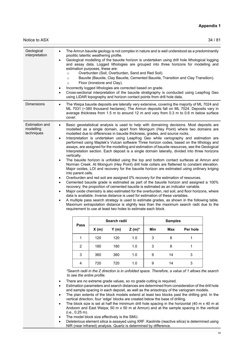 Appendix 1 Notice to ASX 34 / 81 34 Geological interpretation • The Amrun bauxite geology is not complex in nature and is well understood as a predominantly pisolitic lateritic weathering profile. • Geological modelling of the bauxite horizon is undertaken using drill hole lithological logging and assay data. Logged lithologies are grouped into three horizons for modelling and estimation purposes, these are: o Overburden (Soil, Overburden, Sand and Red Soil). o Bauxite (Bauxite, Clay Bauxite, Cemented Bauxite, Transition and Clay Transition). o Floor (Ironstone and Clay). • Incorrectly logged lithologies are corrected based on grade. • Cross-sectional interpretation of the bauxite stratigraphy is conducted using Leapfrog Geo using LiDAR topography and horizon contact points from drill hole data. Dimensions • The Weipa bauxite deposits are laterally very extensive, covering the majority of ML 7024 and ML 7031 (~380 thousand hectares). The Amrun deposits fall on ML 7024. Deposits vary in average thickness from 1.5 m to around 12 m and vary from 0.3 m to 0.6 m below surface cover. Estimation and modelling techniques • Basic geostatistical analysis is used to help with domaining decisions. Most deposits are modelled as a single domain, apart from Moingum (Hey Point) where two domains are modelled due to differences in bauxite thickness, grades, and source rocks. • Interpretation is undertaken using Leapfrog Geo while variography and estimation are performed using Maptek’s Vulcan software Three horizon codes, based on the lithology and assays, are assigned for the modelling and estimation of bauxite resources, see the Geological Interpretation section. Each deposit is a single domain laterally, divided into three horizons vertically. • The bauxite horizon is unfolded using the top and bottom contact surfaces at Amrun and Norman Creek. At Moingum (Hey Point) drill hole collars are flattened to constant elevation. Major oxides, LOI and recovery for the bauxite horizon are estimated using ordinary kriging into parent cells. • Overburden and red soil are assigned 0% recovery for the estimation of resources. • Cemented bauxite grade is estimated as part of the bauxite horizon and assigned a 100% recovery; the proportion of cemented bauxite is estimated as an indicator variable. • Major oxide chemistry is also estimated for the overburden, red soil, and floor horizons, where data is available. Inverse distance is used for estimation of these variables. • A multiple pass search strategy is used to estimate grades, as shown in the following table. Maximum extrapolation distance is slightly less than the maximum search radii due to the requirement to use at least two holes to estimate each block. Pass Search radii Samples X (m) Y (m) Z (m)* Min Max Per hole 1 120 120 1.0 3 8 1 2 180 180 1.0 3 8 1 3 360 360 1.0 9 14 3 4 720 720 1.0 9 14 3 *Search radii in the Z direction is in unfolded space. Therefore, a value of 1 allows the search to see the entire profile. • There are no extreme grade values, so no grade cutting is required. • Estimation parameters and search distances are determined from consideration of the drill hole and sample spacing in each deposit, as well as the anisotropy of the variogram models. • The plan extents of the block models extend at least two blocks past the drilling grid. In the vertical direction, four ‘edge’ blocks are created below the base of drilling. • The block size is set at half the minimum drill hole spacing in the horizontal (40 m x 40 m at Andoom and East Weipa; 50 m x 50 m at Amrun) and at the sample spacing in the vertical (i.e., 0.25 m). • The model block size effectively is the SMU. • Deleterious element silica is assayed using XRF. Kaolinite (reactive silica) is determined using NIR (near infrared) analysis. Quartz is determined by difference.
