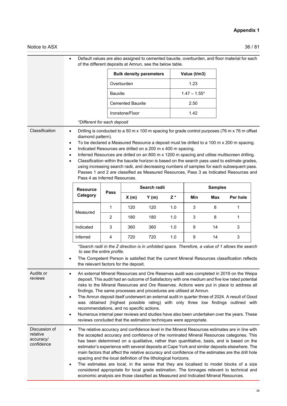 Appendix 1 Notice to ASX 36 / 81 36 • Default values are also assigned to cemented bauxite, overburden, and floor material for each of the different deposits at Amrun, see the below table. Bulk density parameters Value (t/m3) Overburden 1.23 Bauxite 1.47 – 1.55* Cemented Bauxite 2.50 Ironstone/Floor 1.42 *Different for each deposit Classification • Drilling is conducted to a 50 m x 100 m spacing for grade control purposes (76 m x 76 m offset diamond pattern). • To be declared a Measured Resource a deposit must be drilled to a 100 m x 200 m spacing. • Indicated Resources are drilled on a 200 m x 400 m spacing. • Inferred Resources are drilled on an 800 m x 1200 m spacing and utilise multiscreen drilling. • Classification within the bauxite horizon is based on the search pass used to estimate grades, using increasing search radii, and decreasing numbers of samples for each subsequent pass. Passes 1 and 2 are classified as Measured Resources, Pass 3 as Indicated Resources and Pass 4 as Inferred Resources. Resource Category Pass Search radii Samples X (m) Y (m) Z * Min Max Per hole Measured 1 120 120 1.0 3 8 1 2 180 180 1.0 3 8 1 Indicated 3 360 360 1.0 9 14 3 Inferred 4 720 720 1.0 9 14 3 *Search radii in the Z direction is in unfolded space. Therefore, a value of 1 allows the search to see the entire profile. • The Competent Person is satisfied that the current Mineral Resources classification reflects the relevant factors for the deposit. Audits or reviews • An external Mineral Resources and Ore Reserves audit was completed in 2019 on the Weipa deposit. This audit had an outcome of Satisfactory with one medium and five low rated potential risks to the Mineral Resources and Ore Reserves. Actions were put in place to address all findings. The same processes and procedures are utilised at Amrun. • The Amrun deposit itself underwent an external audit in quarter three of 2024. A result of Good was obtained (highest possible rating) with only three low findings outlined with recommendations, and no specific actions. • Numerous internal peer reviews and studies have also been undertaken over the years. These reviews concluded that the estimation techniques were appropriate. Discussion of relative accuracy/ confidence • The relative accuracy and confidence level in the Mineral Resources estimates are in line with the accepted accuracy and confidence of the nominated Mineral Resources categories. This has been determined on a qualitative, rather than quantitative, basis, and is based on the estimator’s experience with several deposits at Cape York and similar deposits elsewhere. The main factors that affect the relative accuracy and confidence of the estimates are the drill hole spacing and the local definition of the lithological horizons. • The estimates are local, in the sense that they are localised to model blocks of a size considered appropriate for local grade estimation. The tonnages relevant to technical and economic analysis are those classified as Measured and Indicated Mineral Resources.