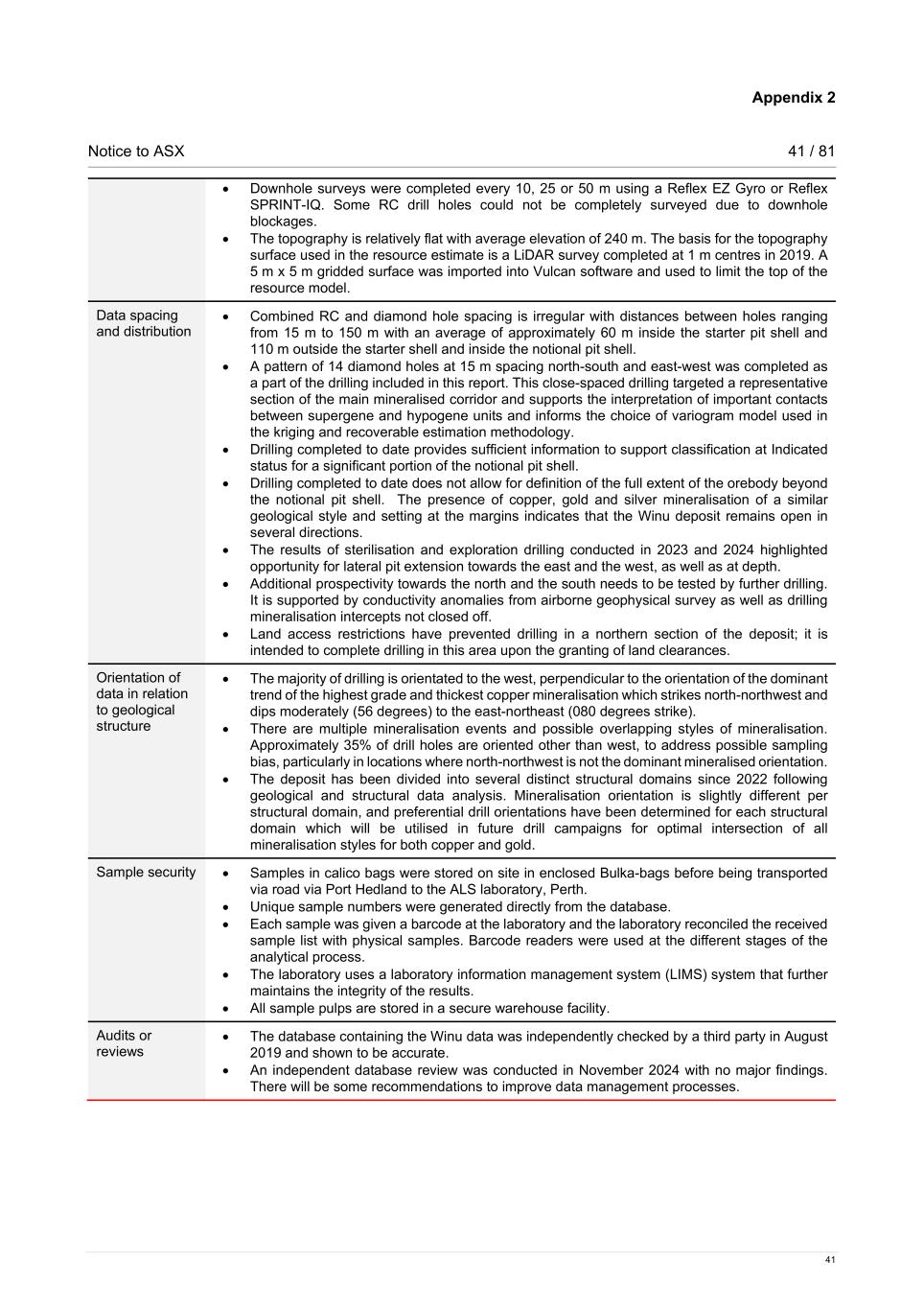 Appendix 2 Notice to ASX 41 / 81 41 • Downhole surveys were completed every 10, 25 or 50 m using a Reflex EZ Gyro or Reflex SPRINT-IQ. Some RC drill holes could not be completely surveyed due to downhole blockages. • The topography is relatively flat with average elevation of 240 m. The basis for the topography surface used in the resource estimate is a LiDAR survey completed at 1 m centres in 2019. A 5 m x 5 m gridded surface was imported into Vulcan software and used to limit the top of the resource model. Data spacing and distribution • Combined RC and diamond hole spacing is irregular with distances between holes ranging from 15 m to 150 m with an average of approximately 60 m inside the starter pit shell and 110 m outside the starter shell and inside the notional pit shell. • A pattern of 14 diamond holes at 15 m spacing north-south and east-west was completed as a part of the drilling included in this report. This close-spaced drilling targeted a representative section of the main mineralised corridor and supports the interpretation of important contacts between supergene and hypogene units and informs the choice of variogram model used in the kriging and recoverable estimation methodology. • Drilling completed to date provides sufficient information to support classification at Indicated status for a significant portion of the notional pit shell. • Drilling completed to date does not allow for definition of the full extent of the orebody beyond the notional pit shell. The presence of copper, gold and silver mineralisation of a similar geological style and setting at the margins indicates that the Winu deposit remains open in several directions. • The results of sterilisation and exploration drilling conducted in 2023 and 2024 highlighted opportunity for lateral pit extension towards the east and the west, as well as at depth. • Additional prospectivity towards the north and the south needs to be tested by further drilling. It is supported by conductivity anomalies from airborne geophysical survey as well as drilling mineralisation intercepts not closed off. • Land access restrictions have prevented drilling in a northern section of the deposit; it is intended to complete drilling in this area upon the granting of land clearances. Orientation of data in relation to geological structure • The majority of drilling is orientated to the west, perpendicular to the orientation of the dominant trend of the highest grade and thickest copper mineralisation which strikes north-northwest and dips moderately (56 degrees) to the east-northeast (080 degrees strike). • There are multiple mineralisation events and possible overlapping styles of mineralisation. Approximately 35% of drill holes are oriented other than west, to address possible sampling bias, particularly in locations where north-northwest is not the dominant mineralised orientation. • The deposit has been divided into several distinct structural domains since 2022 following geological and structural data analysis. Mineralisation orientation is slightly different per structural domain, and preferential drill orientations have been determined for each structural domain which will be utilised in future drill campaigns for optimal intersection of all mineralisation styles for both copper and gold. Sample security • Samples in calico bags were stored on site in enclosed Bulka-bags before being transported via road via Port Hedland to the ALS laboratory, Perth. • Unique sample numbers were generated directly from the database. • Each sample was given a barcode at the laboratory and the laboratory reconciled the received sample list with physical samples. Barcode readers were used at the different stages of the analytical process. • The laboratory uses a laboratory information management system (LIMS) system that further maintains the integrity of the results. • All sample pulps are stored in a secure warehouse facility. Audits or reviews • The database containing the Winu data was independently checked by a third party in August 2019 and shown to be accurate. • An independent database review was conducted in November 2024 with no major findings. There will be some recommendations to improve data management processes.