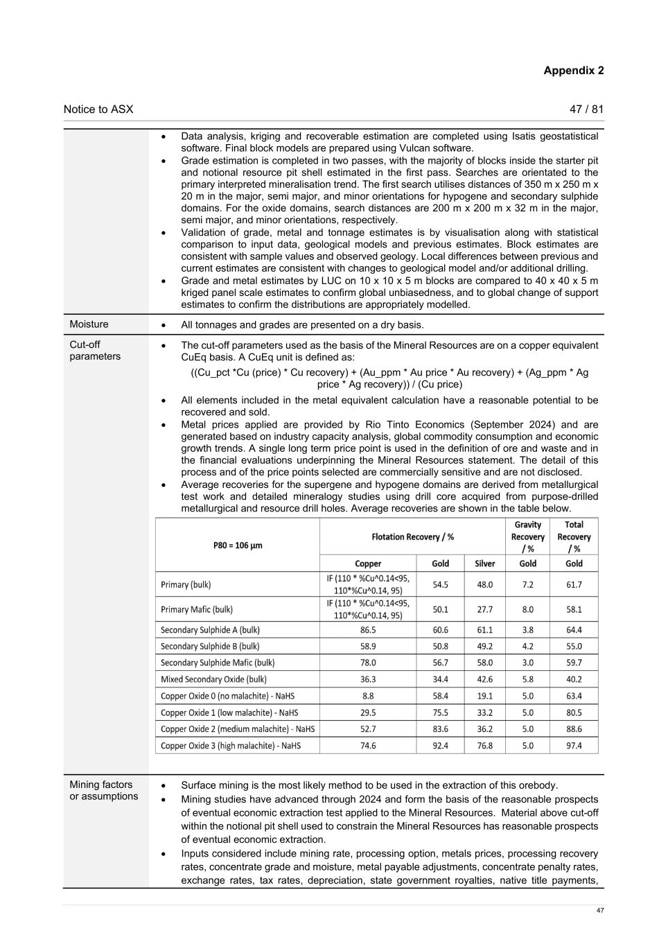 Appendix 2 Notice to ASX 47 / 81 47 • Data analysis, kriging and recoverable estimation are completed using Isatis geostatistical software. Final block models are prepared using Vulcan software. • Grade estimation is completed in two passes, with the majority of blocks inside the starter pit and notional resource pit shell estimated in the first pass. Searches are orientated to the primary interpreted mineralisation trend. The first search utilises distances of 350 m x 250 m x 20 m in the major, semi major, and minor orientations for hypogene and secondary sulphide domains. For the oxide domains, search distances are 200 m x 200 m x 32 m in the major, semi major, and minor orientations, respectively. • Validation of grade, metal and tonnage estimates is by visualisation along with statistical comparison to input data, geological models and previous estimates. Block estimates are consistent with sample values and observed geology. Local differences between previous and current estimates are consistent with changes to geological model and/or additional drilling. • Grade and metal estimates by LUC on 10 x 10 x 5 m blocks are compared to 40 x 40 x 5 m kriged panel scale estimates to confirm global unbiasedness, and to global change of support estimates to confirm the distributions are appropriately modelled. Moisture • All tonnages and grades are presented on a dry basis. Cut-off parameters • The cut-off parameters used as the basis of the Mineral Resources are on a copper equivalent CuEq basis. A CuEq unit is defined as: ((Cu_pct *Cu (price) * Cu recovery) + (Au_ppm * Au price * Au recovery) + (Ag_ppm * Ag price * Ag recovery)) / (Cu price) • All elements included in the metal equivalent calculation have a reasonable potential to be recovered and sold. • Metal prices applied are provided by Rio Tinto Economics (September 2024) and are generated based on industry capacity analysis, global commodity consumption and economic growth trends. A single long term price point is used in the definition of ore and waste and in the financial evaluations underpinning the Mineral Resources statement. The detail of this process and of the price points selected are commercially sensitive and are not disclosed. • Average recoveries for the supergene and hypogene domains are derived from metallurgical test work and detailed mineralogy studies using drill core acquired from purpose-drilled metallurgical and resource drill holes. Average recoveries are shown in the table below. Mining factors or assumptions • Surface mining is the most likely method to be used in the extraction of this orebody. • Mining studies have advanced through 2024 and form the basis of the reasonable prospects of eventual economic extraction test applied to the Mineral Resources. Material above cut-off within the notional pit shell used to constrain the Mineral Resources has reasonable prospects of eventual economic extraction. • Inputs considered include mining rate, processing option, metals prices, processing recovery rates, concentrate grade and moisture, metal payable adjustments, concentrate penalty rates, exchange rates, tax rates, depreciation, state government royalties, native title payments,