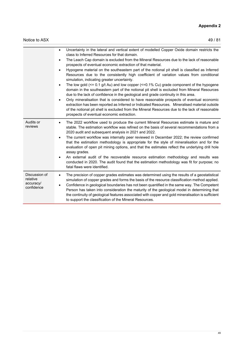 Appendix 2 Notice to ASX 49 / 81 49 • Uncertainty in the lateral and vertical extent of modelled Copper Oxide domain restricts the class to Inferred Resources for that domain. • The Leach Cap domain is excluded from the Mineral Resources due to the lack of reasonable prospects of eventual economic extraction of that material. • Hypogene material on the southeastern part of the notional pit shell is classified as Inferred Resources due to the consistently high coefficient of variation values from conditional simulation, indicating greater uncertainty. • The low gold (<= 0.1 g/t Au) and low copper (<=0.1% Cu) grade component of the hypogene domain in the southeastern part of the notional pit shell is excluded from Mineral Resources due to the lack of confidence in the geological and grade continuity in this area. • Only mineralisation that is considered to have reasonable prospects of eventual economic extraction has been reported as Inferred or Indicated Resources. Mineralised material outside of the notional pit shell is excluded from the Mineral Resources due to the lack of reasonable prospects of eventual economic extraction. Audits or reviews • The 2022 workflow used to produce the current Mineral Resources estimate is mature and stable. The estimation workflow was refined on the basis of several recommendations from a 2020 audit and subsequent analysis in 2021 and 2022. • The current workflow was internally peer reviewed in December 2022; the review confirmed that the estimation methodology is appropriate for the style of mineralisation and for the evaluation of open pit mining options, and that the estimates reflect the underlying drill hole assay grades. • An external audit of the recoverable resource estimation methodology and results was conducted in 2020. The audit found that the estimation methodology was fit for purpose; no fatal flaws were identified. Discussion of relative accuracy/ confidence • The precision of copper grades estimates was determined using the results of a geostatistical simulation of copper grades and forms the basis of the resource classification method applied. • Confidence in geological boundaries has not been quantified in the same way. The Competent Person has taken into consideration the maturity of the geological model in determining that the continuity of geological features associated with copper and gold mineralisation is sufficient to support the classification of the Mineral Resources.