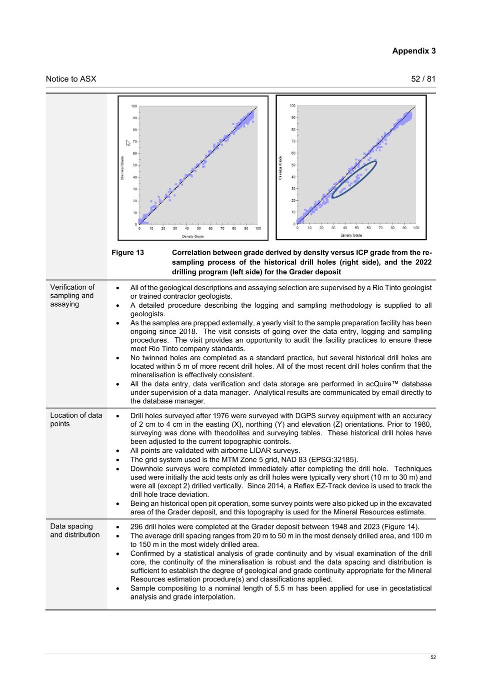 Appendix 3 Notice to ASX 52 / 81 52 Figure 13 Correlation between grade derived by density versus ICP grade from the re- sampling process of the historical drill holes (right side), and the 2022 drilling program (left side) for the Grader deposit Verification of sampling and assaying • All of the geological descriptions and assaying selection are supervised by a Rio Tinto geologist or trained contractor geologists. • A detailed procedure describing the logging and sampling methodology is supplied to all geologists. • As the samples are prepped externally, a yearly visit to the sample preparation facility has been ongoing since 2018. The visit consists of going over the data entry, logging and sampling procedures. The visit provides an opportunity to audit the facility practices to ensure these meet Rio Tinto company standards. • No twinned holes are completed as a standard practice, but several historical drill holes are located within 5 m of more recent drill holes. All of the most recent drill holes confirm that the mineralisation is effectively consistent. • All the data entry, data verification and data storage are performed in acQuire™ database under supervision of a data manager. Analytical results are communicated by email directly to the database manager. Location of data points • Drill holes surveyed after 1976 were surveyed with DGPS survey equipment with an accuracy of 2 cm to 4 cm in the easting (X), northing (Y) and elevation (Z) orientations. Prior to 1980, surveying was done with theodolites and surveying tables. These historical drill holes have been adjusted to the current topographic controls. • All points are validated with airborne LIDAR surveys. • The grid system used is the MTM Zone 5 grid, NAD 83 (EPSG:32185). • Downhole surveys were completed immediately after completing the drill hole. Techniques used were initially the acid tests only as drill holes were typically very short (10 m to 30 m) and were all (except 2) drilled vertically. Since 2014, a Reflex EZ-Track device is used to track the drill hole trace deviation. • Being an historical open pit operation, some survey points were also picked up in the excavated area of the Grader deposit, and this topography is used for the Mineral Resources estimate. Data spacing and distribution • 296 drill holes were completed at the Grader deposit between 1948 and 2023 (Figure 14). • The average drill spacing ranges from 20 m to 50 m in the most densely drilled area, and 100 m to 150 m in the most widely drilled area. • Confirmed by a statistical analysis of grade continuity and by visual examination of the drill core, the continuity of the mineralisation is robust and the data spacing and distribution is sufficient to establish the degree of geological and grade continuity appropriate for the Mineral Resources estimation procedure(s) and classifications applied. • Sample compositing to a nominal length of 5.5 m has been applied for use in geostatistical analysis and grade interpolation.