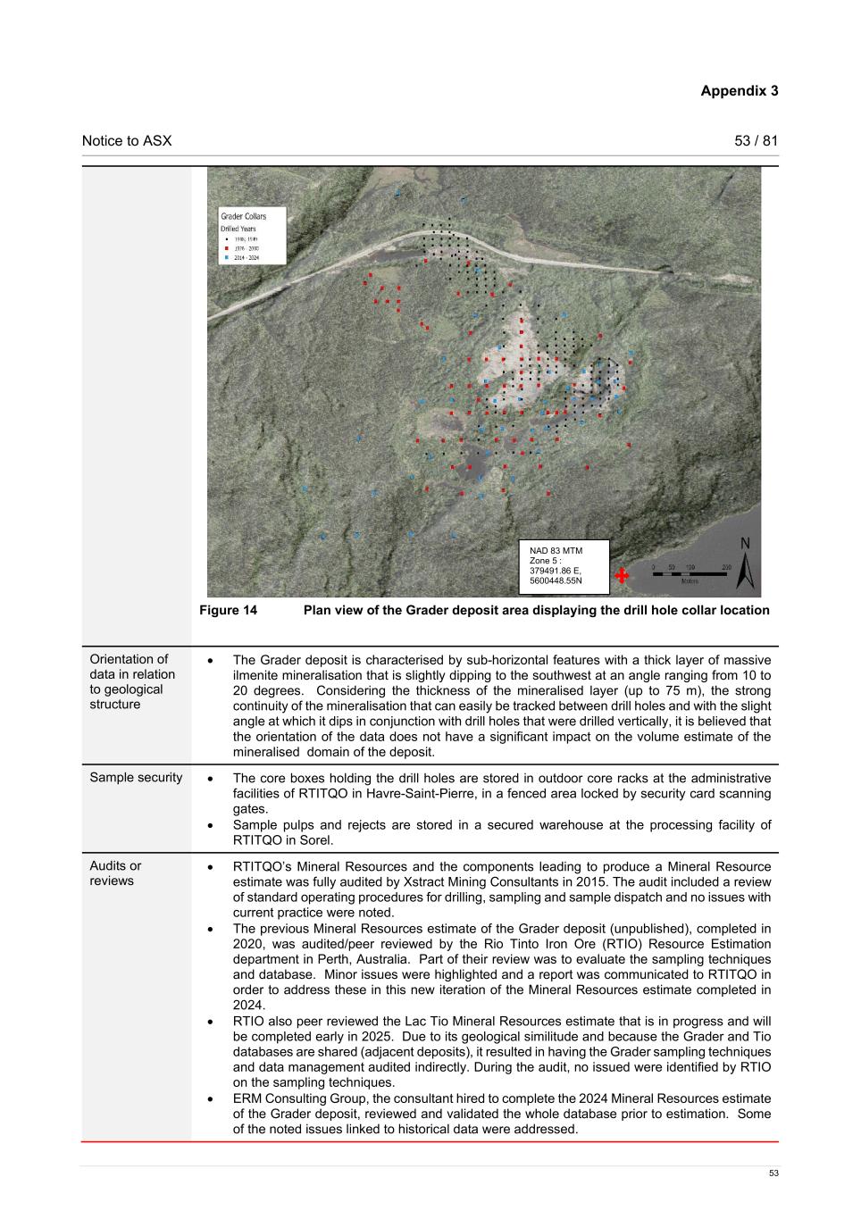 Appendix 3 Notice to ASX 53 / 81 53 Figure 14 Plan view of the Grader deposit area displaying the drill hole collar location Orientation of data in relation to geological structure • The Grader deposit is characterised by sub-horizontal features with a thick layer of massive ilmenite mineralisation that is slightly dipping to the southwest at an angle ranging from 10 to 20 degrees. Considering the thickness of the mineralised layer (up to 75 m), the strong continuity of the mineralisation that can easily be tracked between drill holes and with the slight angle at which it dips in conjunction with drill holes that were drilled vertically, it is believed that the orientation of the data does not have a significant impact on the volume estimate of the mineralised domain of the deposit. Sample security • The core boxes holding the drill holes are stored in outdoor core racks at the administrative facilities of RTITQO in Havre-Saint-Pierre, in a fenced area locked by security card scanning gates. • Sample pulps and rejects are stored in a secured warehouse at the processing facility of RTITQO in Sorel. Audits or reviews • RTITQO’s Mineral Resources and the components leading to produce a Mineral Resource estimate was fully audited by Xstract Mining Consultants in 2015. The audit included a review of standard operating procedures for drilling, sampling and sample dispatch and no issues with current practice were noted. • The previous Mineral Resources estimate of the Grader deposit (unpublished), completed in 2020, was audited/peer reviewed by the Rio Tinto Iron Ore (RTIO) Resource Estimation department in Perth, Australia. Part of their review was to evaluate the sampling techniques and database. Minor issues were highlighted and a report was communicated to RTITQO in order to address these in this new iteration of the Mineral Resources estimate completed in 2024. • RTIO also peer reviewed the Lac Tio Mineral Resources estimate that is in progress and will be completed early in 2025. Due to its geological similitude and because the Grader and Tio databases are shared (adjacent deposits), it resulted in having the Grader sampling techniques and data management audited indirectly. During the audit, no issued were identified by RTIO on the sampling techniques. • ERM Consulting Group, the consultant hired to complete the 2024 Mineral Resources estimate of the Grader deposit, reviewed and validated the whole database prior to estimation. Some of the noted issues linked to historical data were addressed. NAD 83 MTM Zone 5 : 379491.86 E, 5600448.55N