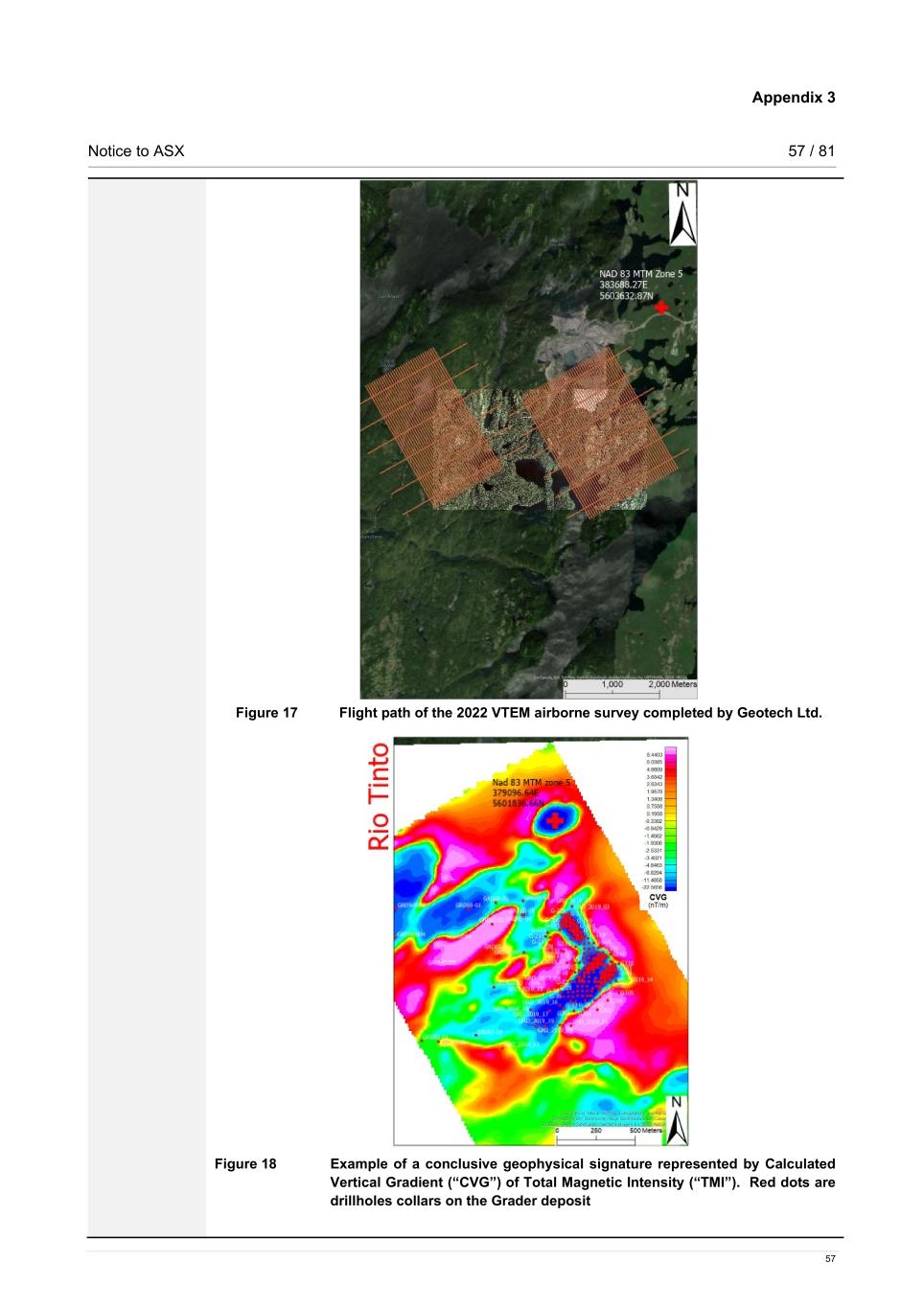 Appendix 3 Notice to ASX 57 / 81 57 Figure 17 Flight path of the 2022 VTEM airborne survey completed by Geotech Ltd. Figure 18 Example of a conclusive geophysical signature represented by Calculated Vertical Gradient (“CVG”) of Total Magnetic Intensity (“TMI”). Red dots are drillholes collars on the Grader deposit