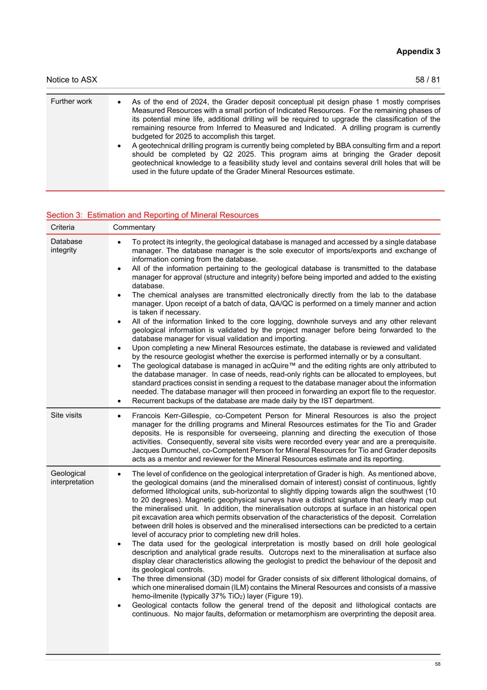 Appendix 3 Notice to ASX 58 / 81 58 Further work • As of the end of 2024, the Grader deposit conceptual pit design phase 1 mostly comprises Measured Resources with a small portion of Indicated Resources. For the remaining phases of its potential mine life, additional drilling will be required to upgrade the classification of the remaining resource from Inferred to Measured and Indicated. A drilling program is currently budgeted for 2025 to accomplish this target. • A geotechnical drilling program is currently being completed by BBA consulting firm and a report should be completed by Q2 2025. This program aims at bringing the Grader deposit geotechnical knowledge to a feasibility study level and contains several drill holes that will be used in the future update of the Grader Mineral Resources estimate. Section 3: Estimation and Reporting of Mineral Resources Criteria Commentary Database integrity • To protect its integrity, the geological database is managed and accessed by a single database manager. The database manager is the sole executor of imports/exports and exchange of information coming from the database. • All of the information pertaining to the geological database is transmitted to the database manager for approval (structure and integrity) before being imported and added to the existing database. • The chemical analyses are transmitted electronically directly from the lab to the database manager. Upon receipt of a batch of data, QA/QC is performed on a timely manner and action is taken if necessary. • All of the information linked to the core logging, downhole surveys and any other relevant geological information is validated by the project manager before being forwarded to the database manager for visual validation and importing. • Upon completing a new Mineral Resources estimate, the database is reviewed and validated by the resource geologist whether the exercise is performed internally or by a consultant. • The geological database is managed in acQuire™ and the editing rights are only attributed to the database manager. In case of needs, read-only rights can be allocated to employees, but standard practices consist in sending a request to the database manager about the information needed. The database manager will then proceed in forwarding an export file to the requestor. • Recurrent backups of the database are made daily by the IST department. Site visits • Francois Kerr-Gillespie, co-Competent Person for Mineral Resources is also the project manager for the drilling programs and Mineral Resources estimates for the Tio and Grader deposits. He is responsible for overseeing, planning and directing the execution of those activities. Consequently, several site visits were recorded every year and are a prerequisite. Jacques Dumouchel, co-Competent Person for Mineral Resources for Tio and Grader deposits acts as a mentor and reviewer for the Mineral Resources estimate and its reporting. Geological interpretation • The level of confidence on the geological interpretation of Grader is high. As mentioned above, the geological domains (and the mineralised domain of interest) consist of continuous, lightly deformed lithological units, sub-horizontal to slightly dipping towards align the southwest (10 to 20 degrees). Magnetic geophysical surveys have a distinct signature that clearly map out the mineralised unit. In addition, the mineralisation outcrops at surface in an historical open pit excavation area which permits observation of the characteristics of the deposit. Correlation between drill holes is observed and the mineralised intersections can be predicted to a certain level of accuracy prior to completing new drill holes. • The data used for the geological interpretation is mostly based on drill hole geological description and analytical grade results. Outcrops next to the mineralisation at surface also display clear characteristics allowing the geologist to predict the behaviour of the deposit and its geological controls. • The three dimensional (3D) model for Grader consists of six different lithological domains, of which one mineralised domain (ILM) contains the Mineral Resources and consists of a massive hemo-ilmenite (typically 37% TiO2) layer (Figure 19). • Geological contacts follow the general trend of the deposit and lithological contacts are continuous. No major faults, deformation or metamorphism are overprinting the deposit area.
