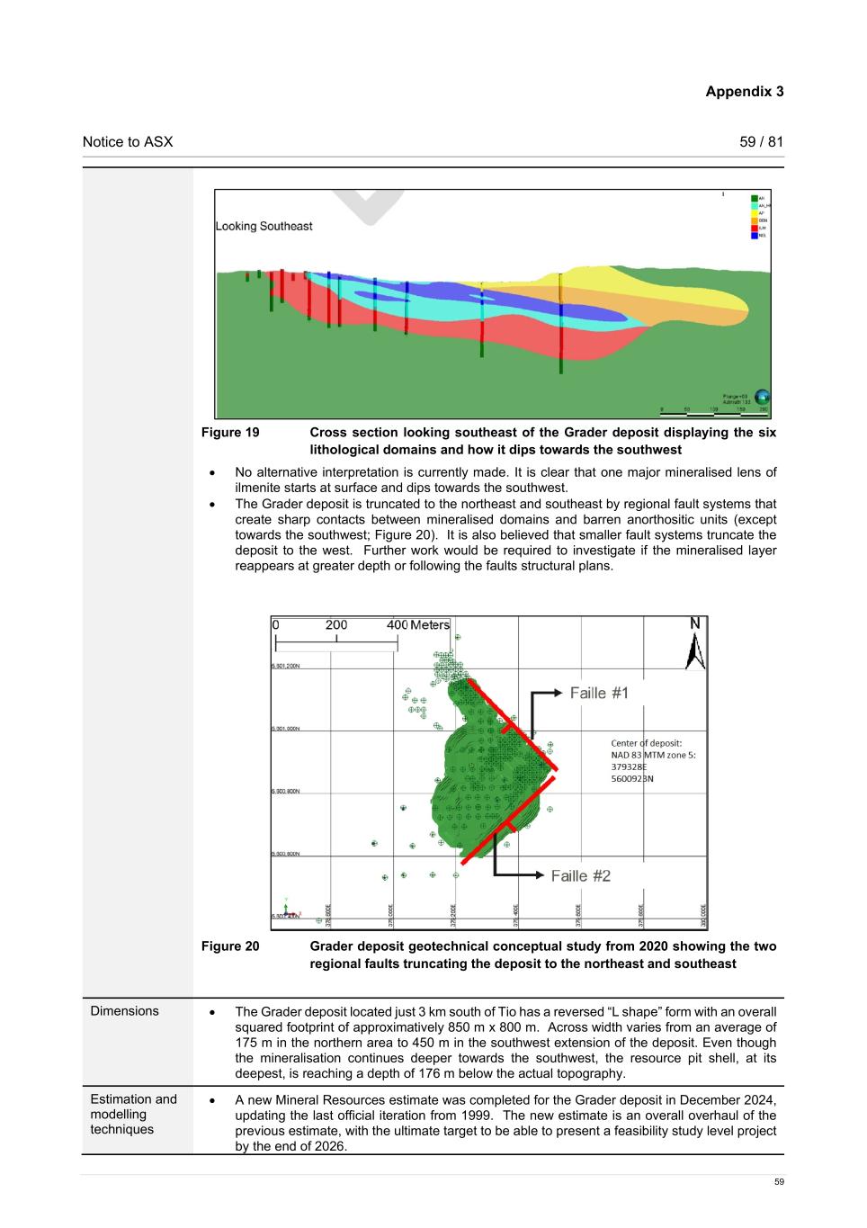 Appendix 3 Notice to ASX 59 / 81 59 Figure 19 Cross section looking southeast of the Grader deposit displaying the six lithological domains and how it dips towards the southwest • No alternative interpretation is currently made. It is clear that one major mineralised lens of ilmenite starts at surface and dips towards the southwest. • The Grader deposit is truncated to the northeast and southeast by regional fault systems that create sharp contacts between mineralised domains and barren anorthositic units (except towards the southwest; Figure 20). It is also believed that smaller fault systems truncate the deposit to the west. Further work would be required to investigate if the mineralised layer reappears at greater depth or following the faults structural plans. Figure 20 Grader deposit geotechnical conceptual study from 2020 showing the two regional faults truncating the deposit to the northeast and southeast Dimensions • The Grader deposit located just 3 km south of Tio has a reversed “L shape” form with an overall squared footprint of approximatively 850 m x 800 m. Across width varies from an average of 175 m in the northern area to 450 m in the southwest extension of the deposit. Even though the mineralisation continues deeper towards the southwest, the resource pit shell, at its deepest, is reaching a depth of 176 m below the actual topography. Estimation and modelling techniques • A new Mineral Resources estimate was completed for the Grader deposit in December 2024, updating the last official iteration from 1999. The new estimate is an overall overhaul of the previous estimate, with the ultimate target to be able to present a feasibility study level project by the end of 2026.