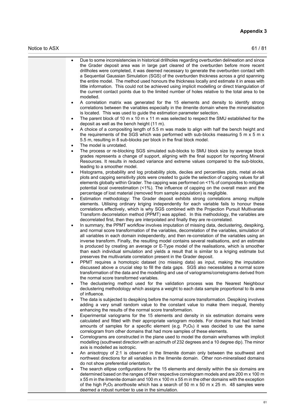 Appendix 3 Notice to ASX 61 / 81 61 • Due to some inconsistencies in historical drillholes regarding overburden delineation and since the Grader deposit area was in large part cleared of the overburden before more recent drillholes were completed, it was deemed necessary to generate the overburden contact with a Sequential Gaussian Simulation (SGS) of the overburden thickness across a grid spanning the entire model. The method used honours the thickness locally and estimate it in areas with little information. This could not be achieved using implicit modelling or direct triangulation of the current contact points due to the limited number of holes relative to the total area to be modelled. • A correlation matrix was generated for the 15 elements and density to identify strong correlations between the variables especially in the ilmenite domain where the mineralisation is located. This was used to guide the estimation parameter selection. • The parent block of 10 m x 10 m x 11 m was selected to respect the SMU established for the deposit as well as the bench height (11 m). • A choice of a compositing length of 5.5 m was made to align with half the bench height and the requirements of the SGS which was performed with sub-blocks measuring 5 m x 5 m x 5.5 m, resulting in 8 sub-blocks per block in the final block model. • The model is unrotated. • The process or re-blocking SGS simulated sub-blocks to SMU block size by average block grades represents a change of support, aligning with the final support for reporting Mineral Resources. It results in reduced variance and extreme values compared to the sub-blocks, leading to a smoother model. • Histograms, probability and log probability plots, deciles and percentiles plots, metal at-risk plots and capping sensitivity plots were created to guide the selection of capping values for all elements globally within Grader. The capping was performed on <1% of composites to mitigate potential local overestimation (<1%). The influence of capping on the overall mean and the percentage of lost material (removed from sample population) is negligible. • Estimation methodology: The Grader deposit exhibits strong correlations among multiple elements. Utilising ordinary kriging independently for each variable fails to honour these correlations effectively, which is why SGS combined with the Projection Pursuit Multivariate Transform decorrelation method (PPMT) was applied. In this methodology, the variables are decorrelated first, then they are interpolated and finally they are re-correlated. • In summary, the PPMT workflow involves imputation of missing data, declustering, despiking, and normal score transformation of the variables, decorrelation of the variables, simulation of all variables in each domain independently, and then re-correlation of the variables using an inverse transform. Finally, the resulting model contains several realisations, and an estimate is produced by creating an average or E-Type model of the realisations, which is smoother than each individual simulation and yields a result that is similar to a kriging estimate but preserves the multivariate correlation present in the Grader deposit. • PPMT requires a homotopic dataset (no missing data) as input, making the imputation discussed above a crucial step to fill the data gaps. SGS also necessitates a normal score transformation of the data and the modelling and use of variograms/correlograms derived from the normal score transformed variables. • The declustering method used for the validation process was the Nearest Neighbour declustering methodology which assigns a weight to each data sample proportional to its area of influence. • The data is subjected to despiking before the normal score transformation. Despiking involves adding a very small random value to the constant value to make them inequal, thereby enhancing the results of the normal score transformation. • Experimental variograms for the 15 elements and density in six estimation domains were calculated and fitted with their appropriate variogram models. For domains that had limited amounts of samples for a specific element (e.g. P2O5) it was decided to use the same correlogram from other domains that had more samples of these elements. • Correlograms are constructed in the plane used to model the domain wireframes with implicit modelling (southwest direction with an azimuth of 232 degrees and a 10 degree dip). The minor axis is modelled as isotropic. • An anisotropy of 2:1 is observed in the Ilmenite domain only between the southwest and northwest directions for all variables in the Ilmenite domain. Other non-mineralised domains do not show preferential orientation. • The search ellipse configurations for the 15 elements and density within the six domains are determined based on the ranges of their respective correlogram models and are 200 m x 100 m x 55 m in the ilmenite domain and 100 m x 100 m x 55 m in the other domains with the exception of the high P2O5 anorthosite which has a search of 50 m x 50 m x 25 m. 48 samples were deemed a robust number to use in the simulation.