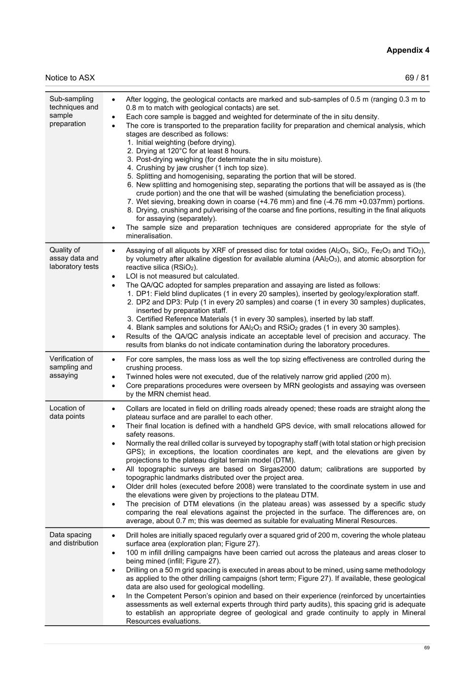 Appendix 4 Notice to ASX 69 / 81 69 Sub-sampling techniques and sample preparation • After logging, the geological contacts are marked and sub-samples of 0.5 m (ranging 0.3 m to 0.8 m to match with geological contacts) are set. • Each core sample is bagged and weighted for determinate of the in situ density. • The core is transported to the preparation facility for preparation and chemical analysis, which stages are described as follows: 1. Initial weighting (before drying). 2. Drying at 120°C for at least 8 hours. 3. Post-drying weighing (for determinate the in situ moisture). 4. Crushing by jaw crusher (1 inch top size). 5. Splitting and homogenising, separating the portion that will be stored. 6. New splitting and homogenising step, separating the portions that will be assayed as is (the crude portion) and the one that will be washed (simulating the beneficiation process). 7. Wet sieving, breaking down in coarse (+4.76 mm) and fine (-4.76 mm +0.037mm) portions. 8. Drying, crushing and pulverising of the coarse and fine portions, resulting in the final aliquots for assaying (separately). • The sample size and preparation techniques are considered appropriate for the style of mineralisation. Quality of assay data and laboratory tests • Assaying of all aliquots by XRF of pressed disc for total oxides (Al2O3, SiO2, Fe2O3 and TiO2), by volumetry after alkaline digestion for available alumina (AAl2O3), and atomic absorption for reactive silica (RSiO2). • LOI is not measured but calculated. • The QA/QC adopted for samples preparation and assaying are listed as follows: 1. DP1: Field blind duplicates (1 in every 20 samples), inserted by geology/exploration staff. 2. DP2 and DP3: Pulp (1 in every 20 samples) and coarse (1 in every 30 samples) duplicates, inserted by preparation staff. 3. Certified Reference Materials (1 in every 30 samples), inserted by lab staff. 4. Blank samples and solutions for AAl2O3 and RSiO2 grades (1 in every 30 samples). • Results of the QA/QC analysis indicate an acceptable level of precision and accuracy. The results from blanks do not indicate contamination during the laboratory procedures. Verification of sampling and assaying • For core samples, the mass loss as well the top sizing effectiveness are controlled during the crushing process. • Twinned holes were not executed, due of the relatively narrow grid applied (200 m). • Core preparations procedures were overseen by MRN geologists and assaying was overseen by the MRN chemist head. Location of data points • Collars are located in field on drilling roads already opened; these roads are straight along the plateau surface and are parallel to each other. • Their final location is defined with a handheld GPS device, with small relocations allowed for safety reasons. • Normally the real drilled collar is surveyed by topography staff (with total station or high precision GPS); in exceptions, the location coordinates are kept, and the elevations are given by projections to the plateau digital terrain model (DTM). • All topographic surveys are based on Sirgas2000 datum; calibrations are supported by topographic landmarks distributed over the project area. • Older drill holes (executed before 2008) were translated to the coordinate system in use and the elevations were given by projections to the plateau DTM. • The precision of DTM elevations (in the plateau areas) was assessed by a specific study comparing the real elevations against the projected in the surface. The differences are, on average, about 0.7 m; this was deemed as suitable for evaluating Mineral Resources. Data spacing and distribution • Drill holes are initially spaced regularly over a squared grid of 200 m, covering the whole plateau surface area (exploration plan; Figure 27). • 100 m infill drilling campaigns have been carried out across the plateaus and areas closer to being mined (infill; Figure 27). • Drilling on a 50 m grid spacing is executed in areas about to be mined, using same methodology as applied to the other drilling campaigns (short term; Figure 27). If available, these geological data are also used for geological modelling. • In the Competent Person’s opinion and based on their experience (reinforced by uncertainties assessments as well external experts through third party audits), this spacing grid is adequate to establish an appropriate degree of geological and grade continuity to apply in Mineral Resources evaluations.
