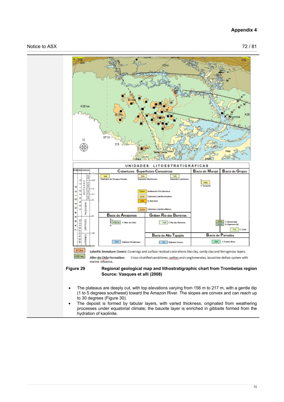 Appendix 4 Notice to ASX 72 / 81 72 Figure 29 Regional geological map and lithostratigraphic chart from Trombetas region Source: Vasques et alli (2008) • The plateaus are deeply cut, with top elevations varying from 156 m to 217 m, with a gentle dip (1 to 5 degrees southwest) toward the Amazon River. The slopes are convex and can reach up to 30 degrees (Figure 30). • The deposit is formed by tabular layers, with varied thickness, originated from weathering processes under equatorial climate; the bauxite layer is enriched in gibbsite formed from the hydration of kaolinite. 0 N