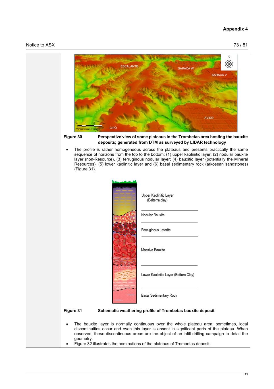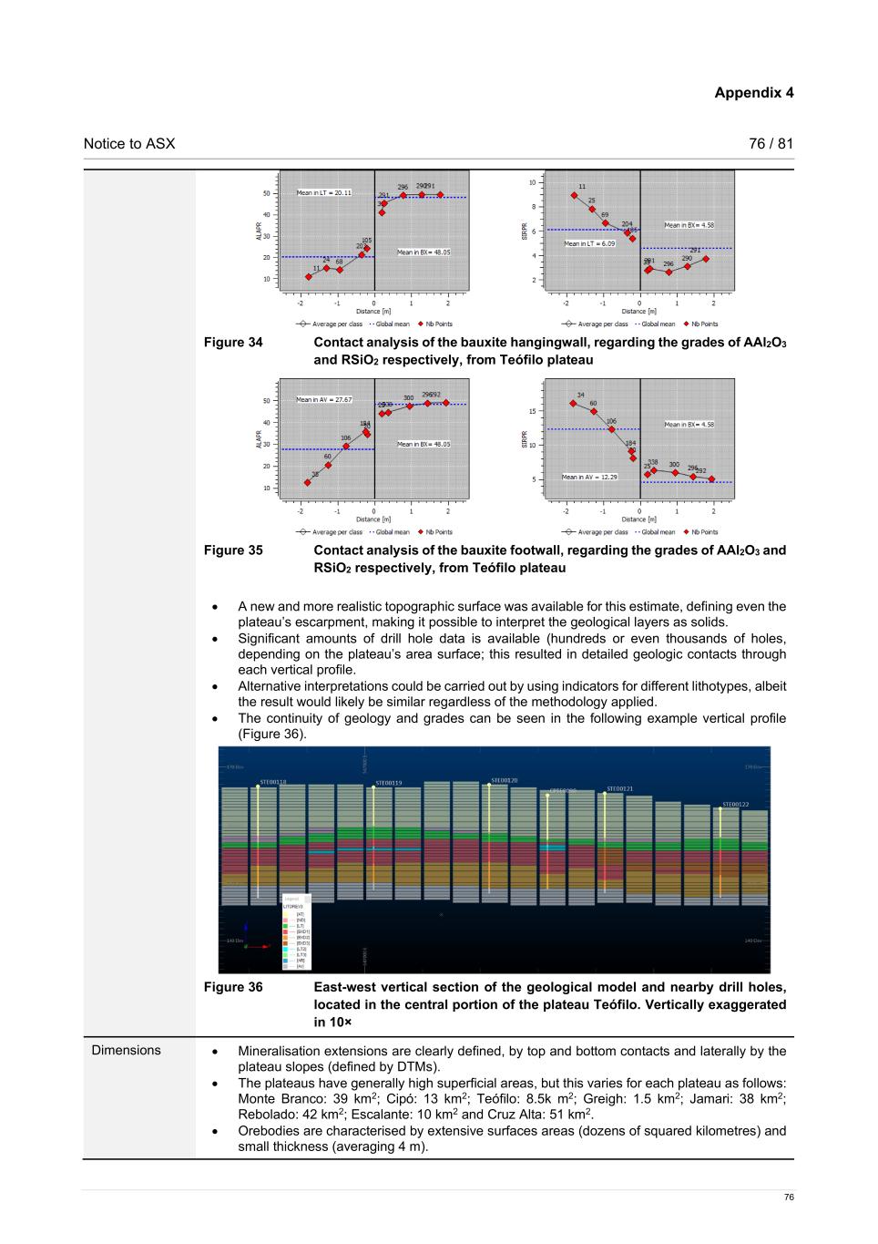 Appendix 4 Notice to ASX 76 / 81 76 Figure 34 Contact analysis of the bauxite hangingwall, regarding the grades of AAl2O3 and RSiO2 respectively, from Teófilo plateau Figure 35 Contact analysis of the bauxite footwall, regarding the grades of AAl2O3 and RSiO2 respectively, from Teófilo plateau • A new and more realistic topographic surface was available for this estimate, defining even the plateau’s escarpment, making it possible to interpret the geological layers as solids. • Significant amounts of drill hole data is available (hundreds or even thousands of holes, depending on the plateau’s area surface; this resulted in detailed geologic contacts through each vertical profile. • Alternative interpretations could be carried out by using indicators for different lithotypes, albeit the result would likely be similar regardless of the methodology applied. • The continuity of geology and grades can be seen in the following example vertical profile (Figure 36). Figure 36 East-west vertical section of the geological model and nearby drill holes, located in the central portion of the plateau Teófilo. Vertically exaggerated in 10× Dimensions • Mineralisation extensions are clearly defined, by top and bottom contacts and laterally by the plateau slopes (defined by DTMs). • The plateaus have generally high superficial areas, but this varies for each plateau as follows: Monte Branco: 39 km2; Cipó: 13 km2; Teófilo: 8.5k m2; Greigh: 1.5 km2; Jamari: 38 km2; Rebolado: 42 km2; Escalante: 10 km2 and Cruz Alta: 51 km2. • Orebodies are characterised by extensive surfaces areas (dozens of squared kilometres) and small thickness (averaging 4 m).