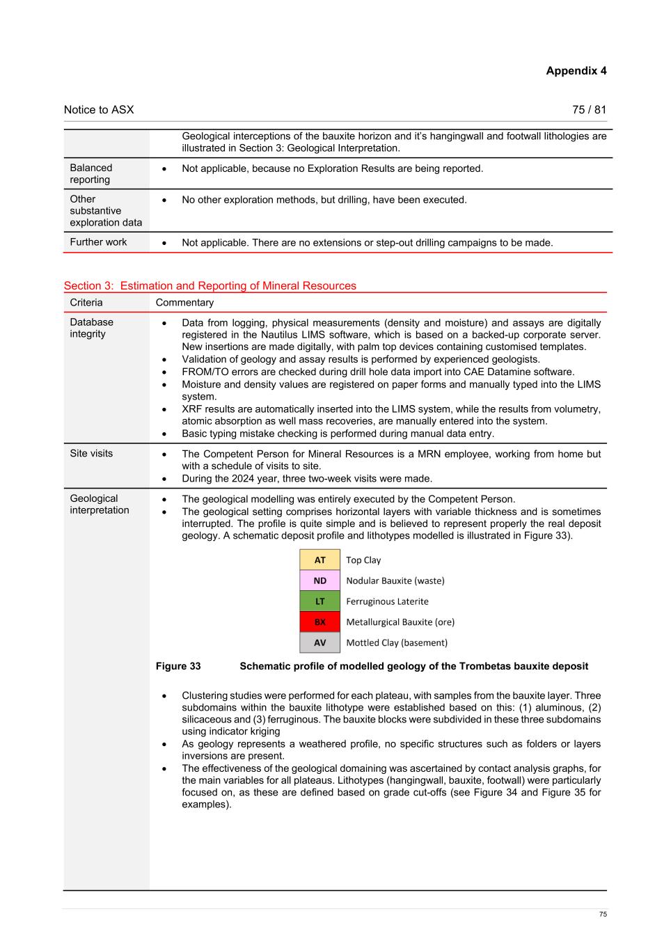 Appendix 4 Notice to ASX 75 / 81 75 Geological interceptions of the bauxite horizon and it’s hangingwall and footwall lithologies are illustrated in Section 3: Geological Interpretation. Balanced reporting • Not applicable, because no Exploration Results are being reported. Other substantive exploration data • No other exploration methods, but drilling, have been executed. Further work • Not applicable. There are no extensions or step-out drilling campaigns to be made. Section 3: Estimation and Reporting of Mineral Resources Criteria Commentary Database integrity • Data from logging, physical measurements (density and moisture) and assays are digitally registered in the Nautilus LIMS software, which is based on a backed-up corporate server. New insertions are made digitally, with palm top devices containing customised templates. • Validation of geology and assay results is performed by experienced geologists. • FROM/TO errors are checked during drill hole data import into CAE Datamine software. • Moisture and density values are registered on paper forms and manually typed into the LIMS system. • XRF results are automatically inserted into the LIMS system, while the results from volumetry, atomic absorption as well mass recoveries, are manually entered into the system. • Basic typing mistake checking is performed during manual data entry. Site visits • The Competent Person for Mineral Resources is a MRN employee, working from home but with a schedule of visits to site. • During the 2024 year, three two-week visits were made. Geological interpretation • The geological modelling was entirely executed by the Competent Person. • The geological setting comprises horizontal layers with variable thickness and is sometimes interrupted. The profile is quite simple and is believed to represent properly the real deposit geology. A schematic deposit profile and lithotypes modelled is illustrated in Figure 33). Figure 33 Schematic profile of modelled geology of the Trombetas bauxite deposit • Clustering studies were performed for each plateau, with samples from the bauxite layer. Three subdomains within the bauxite lithotype were established based on this: (1) aluminous, (2) silicaceous and (3) ferruginous. The bauxite blocks were subdivided in these three subdomains using indicator kriging • As geology represents a weathered profile, no specific structures such as folders or layers inversions are present. • The effectiveness of the geological domaining was ascertained by contact analysis graphs, for the main variables for all plateaus. Lithotypes (hangingwall, bauxite, footwall) were particularly focused on, as these are defined based on grade cut-offs (see Figure 34 and Figure 35 for examples).