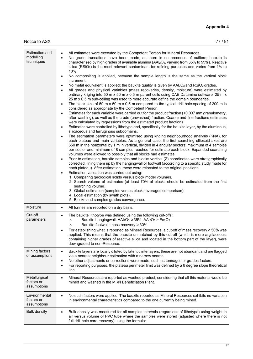 Appendix 4 Notice to ASX 77 / 81 77 Estimation and modelling techniques • All estimates were executed by the Competent Person for Mineral Resources. • No grade truncations have been made, as there is no presence of outliers; bauxite is characterised by high grades of available alumina (AAl2O3, varying from 35% to 55%). Reactive silica (RSiO2) is the most relevant contaminant for refining purposes and varies from 1% to 10%. • No compositing is applied, because the sample length is the same as the vertical block increment. • No metal equivalent is applied; the bauxite quality is given by AAl2O3 and RSiO2 grades. • All grades and physical variables (mass recoveries, density, moisture) were estimated by ordinary kriging into 50 m x 50 m x 0.5 m parent cells using CAE Datamine software. 25 m x 25 m x 0.5 m sub-celling was used to more accurate define the domain boundaries. • The block size of 50 m x 50 m x 0.5 m compared to the typical drill hole spacing of 200 m is considered as appropriate by the Competent Person. • Estimates for each variable were carried out for the product fraction (+0.037 mm granulometry, after washing), as well as the crude (unwashed) fraction. Coarse and fine fractions estimates were calculated by regressions from the estimated product fractions. • Estimates were controlled by lithotype and, specifically for the bauxite layer, by the aluminous, silicaceous and ferruginous subdomains. • The estimation parameters were optimised using kriging neighbourhood analysis (KNA), for each plateau and main variables. As a general case, the first searching ellipsoid axes are 650 m in the horizontal by 1 m in vertical, divided in 4 angular sectors; maximum of 4 samples per sector and minimum of 8 samples reached for estimate each block. Expanded searching volumes were allowed to possibly that all blocks had estimates. • Prior to estimation, bauxite samples and blocks vertical (Z) coordinates were stratigraphically corrected, lining them up by the hangingwall or footwall (according to a specific study made for each plateau). After estimation, these were relocated to the original positions. • Estimation validation was carried out using: 1. Comparing geological solids versus block model volumes. 2. Search volume of estimates (at least 70% of blocks should be estimated from the first searching volume). 3. Global estimation (samples versus blocks averages comparison). 4. Local estimation (by swath plots). 5. Blocks and samples grades convergence. Moisture • All tonnes are reported on a dry basis. Cut-off parameters • The bauxite lithotype was defined using the following cut-offs: o Bauxite hangingwall: AAl2O3 ≥ 35%, AAl2O3 > Fe2O3 o Bauxite footwall: mass recovery ≥ 30% • For establishing what is reported as Mineral Resources, a cut-off of mass recovery ≥ 50% was applied. This means that the bauxite unmatched by this cut-off (which is more argillaceous, containing higher grades of reactive silica and located in the bottom part of the layer), were downgraded to non-Resource. Mining factors or assumptions • Bauxite layers are locally diluted by lateritic interlayers, these are not abundant and are flagged via a nearest neighbour estimation with a narrow search. • No other adjustments or corrections were made, such as tonnages or grades factors. • For reporting purposes, the plateau perimeter limit was defined by a 6 degree slope theoretical line. Metallurgical factors or assumptions • Mineral Resources are reported as washed product, considering that all this material would be mined and washed in the MRN Beneficiation Plant. Environmental factors or assumptions • No such factors were applied. The bauxite reported as Mineral Resources exhibits no variation in environmental characteristics compared to the one currently being mined. Bulk density • Bulk density was measured for all samples intervals (regardless of lithotype) using weight in air versus volume of PVC tube where the samples were stored (adjusted where there is not full drill hole core recovery) using the formula:
