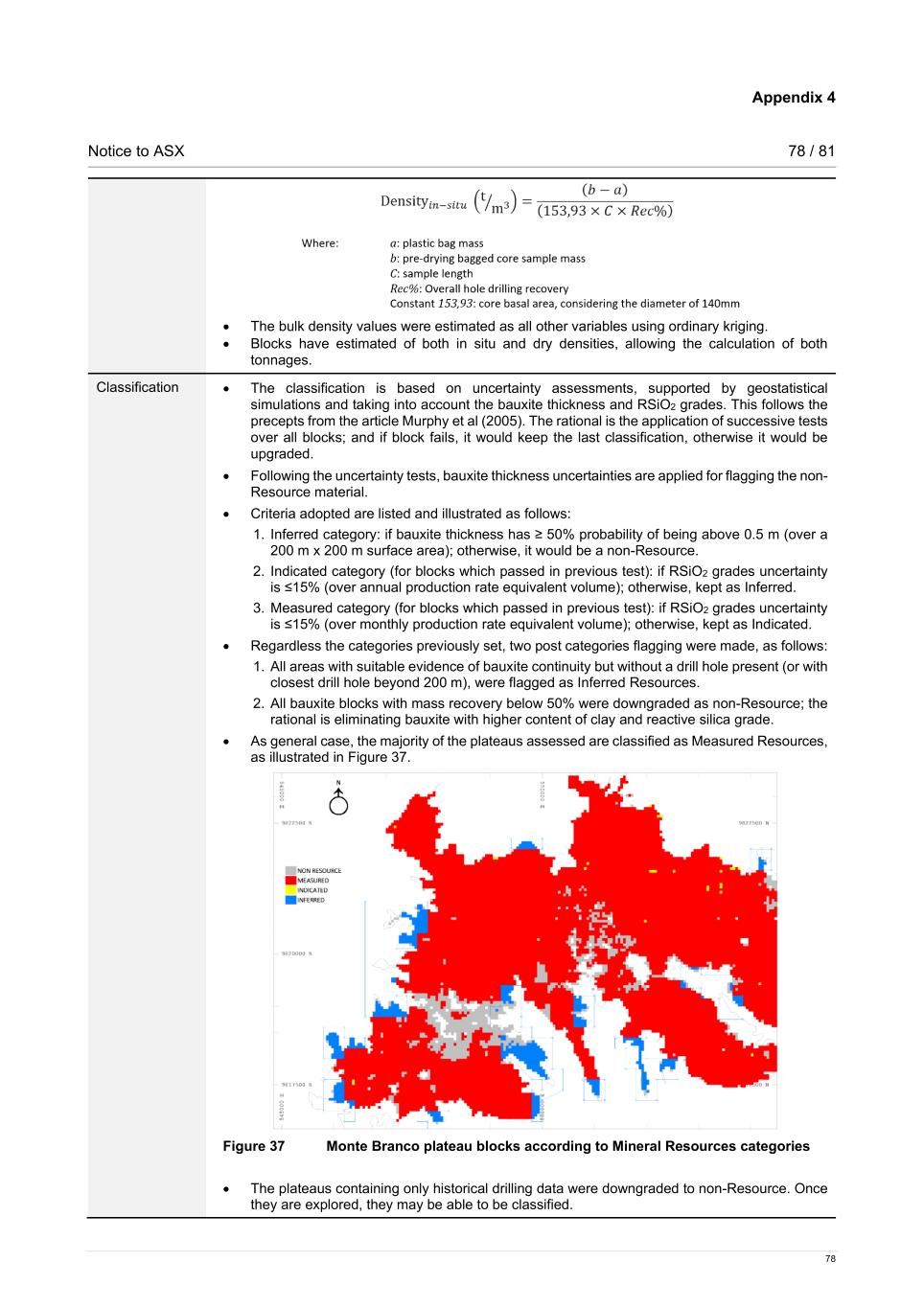 Appendix 4 Notice to ASX 78 / 81 78 • The bulk density values were estimated as all other variables using ordinary kriging. • Blocks have estimated of both in situ and dry densities, allowing the calculation of both tonnages. Classification • The classification is based on uncertainty assessments, supported by geostatistical simulations and taking into account the bauxite thickness and RSiO2 grades. This follows the precepts from the article Murphy et al (2005). The rational is the application of successive tests over all blocks; and if block fails, it would keep the last classification, otherwise it would be upgraded. • Following the uncertainty tests, bauxite thickness uncertainties are applied for flagging the non- Resource material. • Criteria adopted are listed and illustrated as follows: 1. Inferred category: if bauxite thickness has ≥ 50% probability of being above 0.5 m (over a 200 m x 200 m surface area); otherwise, it would be a non-Resource. 2. Indicated category (for blocks which passed in previous test): if RSiO2 grades uncertainty is ≤15% (over annual production rate equivalent volume); otherwise, kept as Inferred. 3. Measured category (for blocks which passed in previous test): if RSiO2 grades uncertainty is ≤15% (over monthly production rate equivalent volume); otherwise, kept as Indicated. • Regardless the categories previously set, two post categories flagging were made, as follows: 1. All areas with suitable evidence of bauxite continuity but without a drill hole present (or with closest drill hole beyond 200 m), were flagged as Inferred Resources. 2. All bauxite blocks with mass recovery below 50% were downgraded as non-Resource; the rational is eliminating bauxite with higher content of clay and reactive silica grade. • As general case, the majority of the plateaus assessed are classified as Measured Resources, as illustrated in Figure 37. Figure 37 Monte Branco plateau blocks according to Mineral Resources categories • The plateaus containing only historical drilling data were downgraded to non-Resource. Once they are explored, they may be able to be classified.